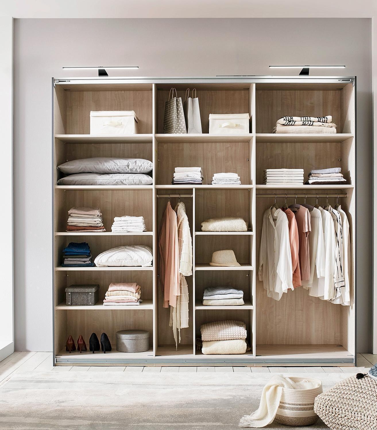 | Lieferumfang: | 1 Schwebetürenschrank mit 2 Türen, 2 Kleiderstangen und 12 Einlegeböden. Die LED-Beleuchtungen sind nicht enthalten |