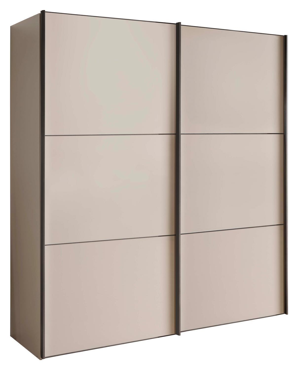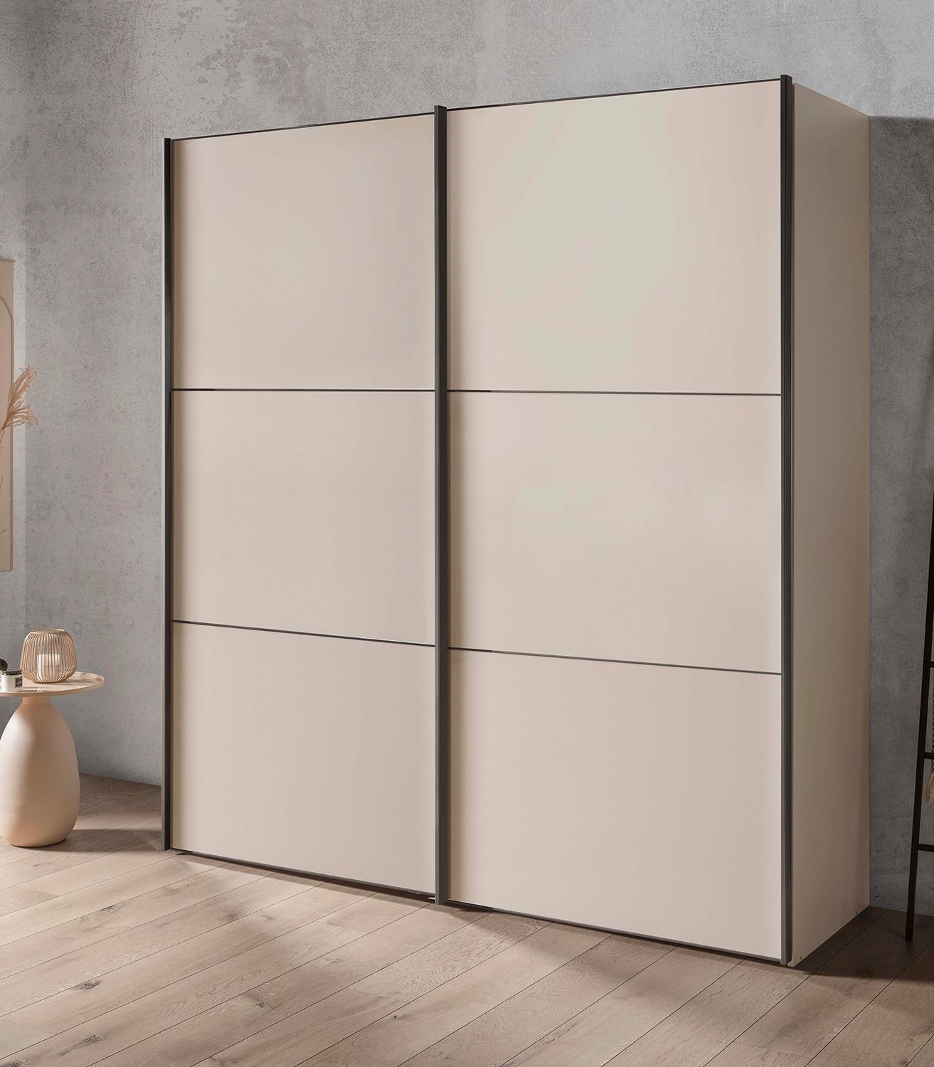 Der Schwebetürenschrank PARIX präsentiert sich in einer eleganten champagnerfarbenen Ausführung und ist mit schiefergrauen Griffleisten ausgestattet. Er verfügt über zwei Türen, die mit einer Soft-Close-Funktion und einem Selbsteinzug versehen sind, was ein geräuscharmes und komfortables Schließen ermöglicht. Im Innenraum befinden sich zwei Kleiderstangen sowie zwölf Einlegeböden, die eine strukturierte und vielseitige Aufbewahrung von Kleidung und Accessoires erlauben. Die Maße des Schranks betragen 200 cm in der Breite, 217 cm in der Höhe und 67 cm in der Tiefe. Die LED-Beleuchtungen sind nicht im Lieferumfang enthalten.