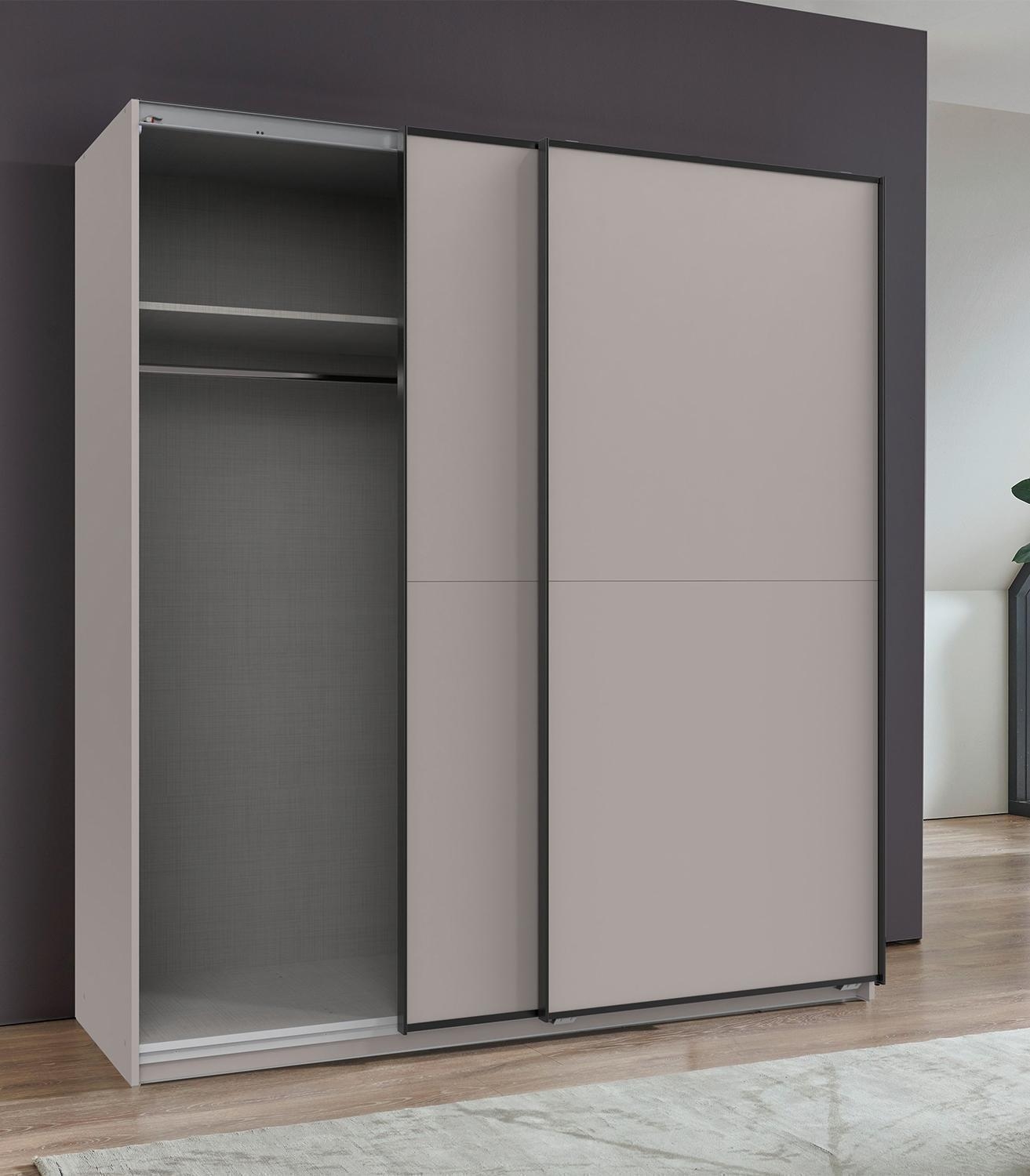 Der Schwebetürenschrank ULLA ist in Saharagrau gestaltet und mit Leisten in Schwarz versehen. Er verfügt über 2 Schwebetüren, die den Zugriff auf den Innenbereich ermöglichen. Dieser ist mit 2 Einlegeböden sowie 2 Kleiderstangen ausgestattet und bietet damit vielfältige Aufbewahrungsmöglichkeiten. Die Maße des Schranks betragen 180 cm in der Breite, 198 cm in der Höhe und 65 cm in der Tiefe.