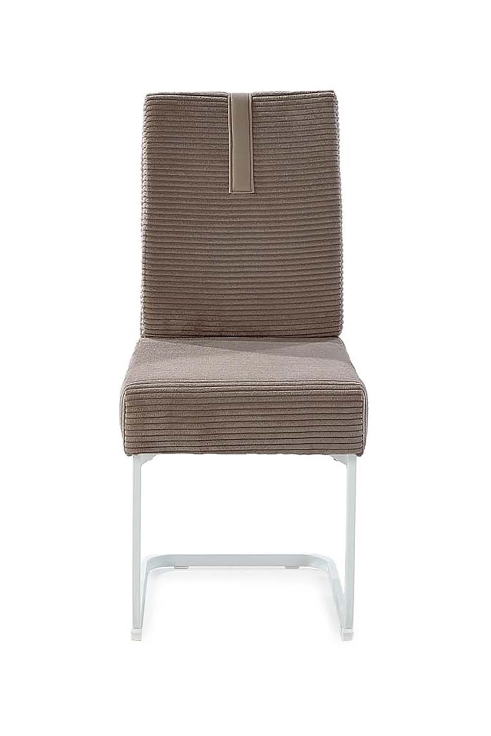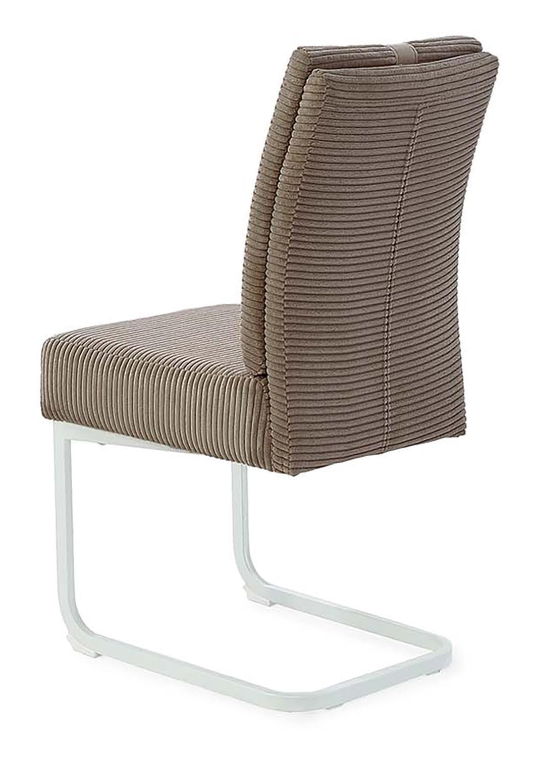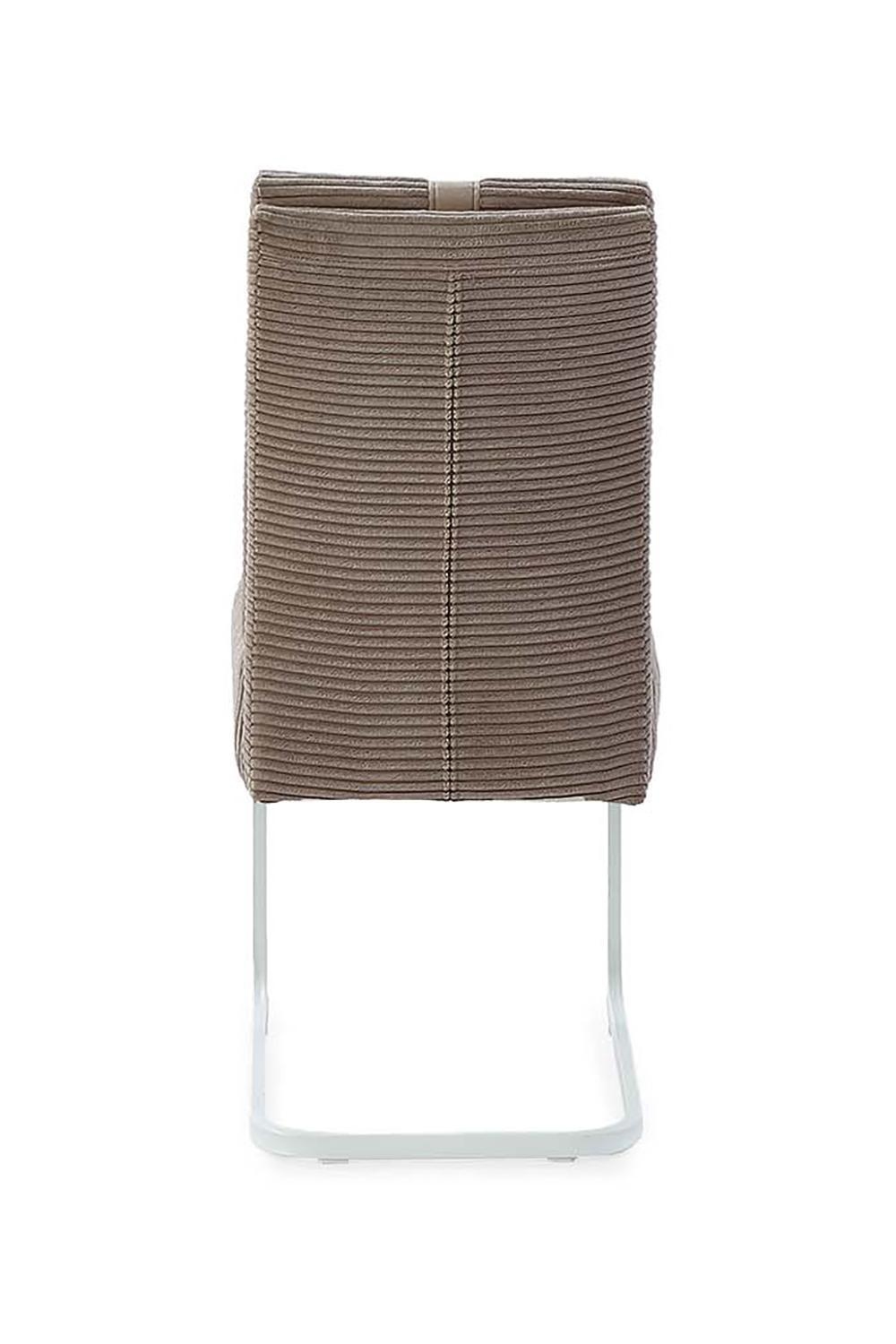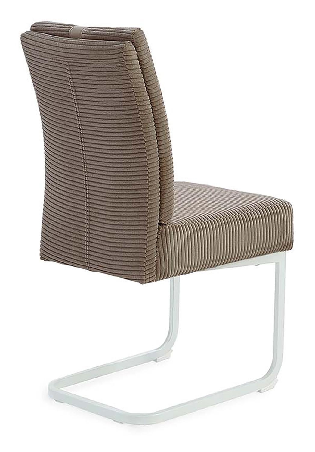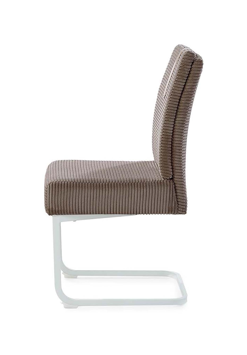 Der Schwingstuhl RICA ist mit einem Cordbezug in Taupe bezogen und verfügt über ein Gestell aus Metall in Perlweiß. Die Sitzfläche ist mit einer Tonnentaschenfederkernpolsterung versehen, die Rückenlehne ist doppelt gepolstert. Als Freischwinger ist der Stuhl bis maximal 110 kg belastbar. Die Breite beträgt 44 cm, die Höhe 96 cm und die Tiefe 60 cm.