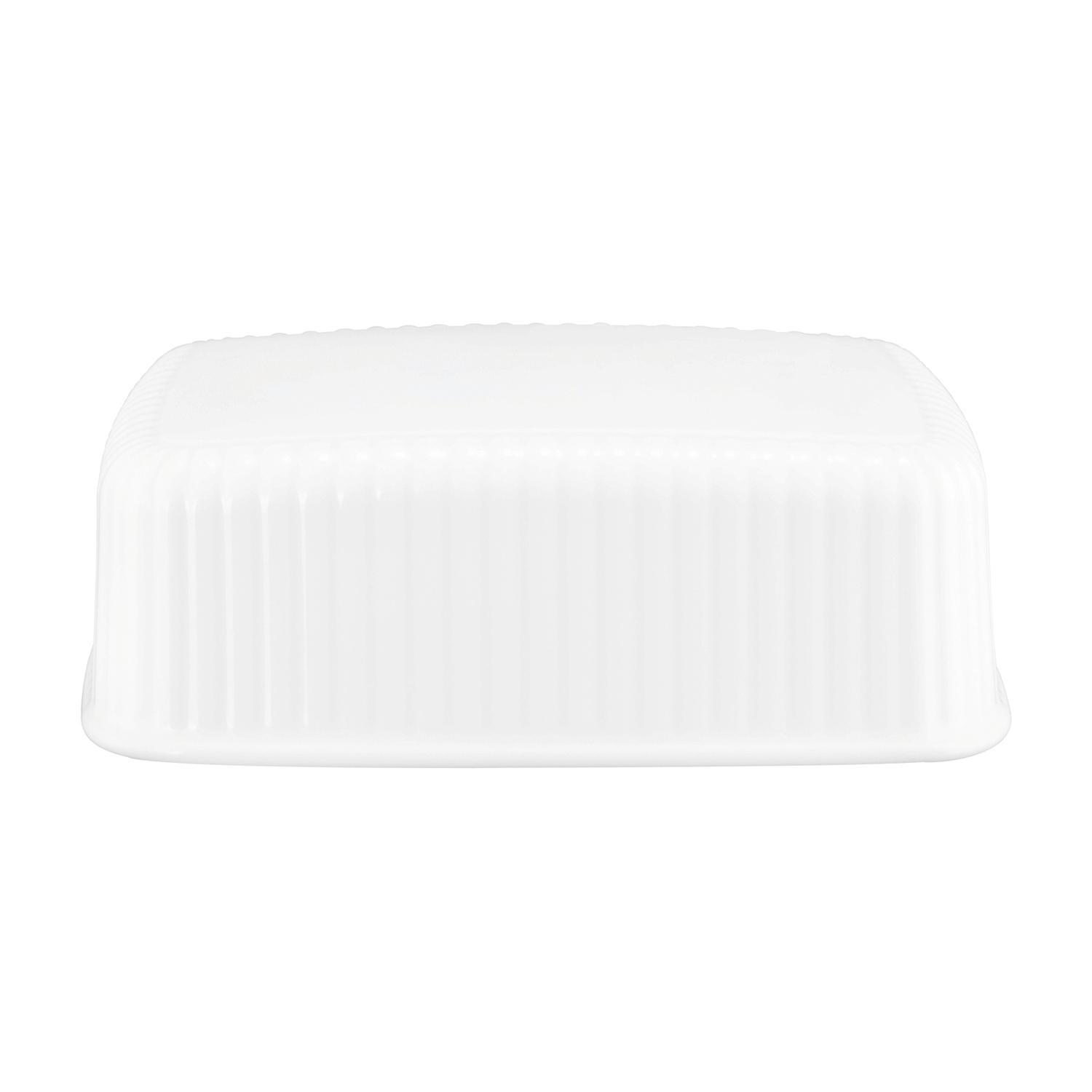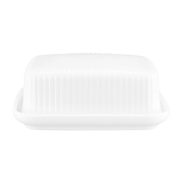 Die Butterdose AMINA der Marke Seltmann ist aus weißem Porzellan gefertigt. Sie ist für 250-Gramm-Stücke Butter geeignet. Der Deckel verfügt über ein Rillendekor. Die Butterdose ist mikrowellengeeignet, spülmaschinenfest, gefriergeeignet und backofenfest. Hergestellt wird sie in Deutschland. Die Maße betragen 17,5 cm in der Breite, 6,2 cm in der Höhe und 14 cm in der Tiefe.