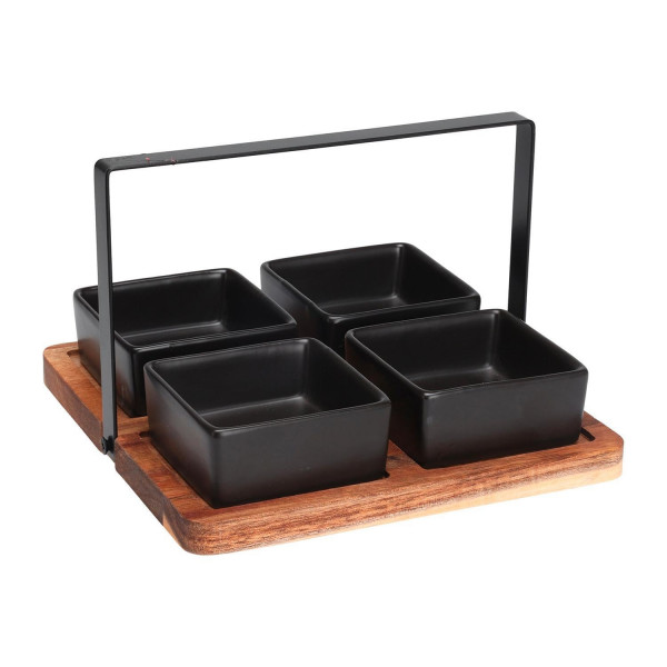Das 5-teilige Servier-Set KABINAS besteht aus einem Tablett aus Akazienholz und vier schwarzen Schalen aus Keramik. Der Henkel aus schwarzem Metall erleichtert den Transport und ergänzt die stabile Ausführung. Mit einer Breite und Tiefe von jeweils 20 cm sowie einer Höhe von 13 cm eignet sich das Set für vielseitige Einsatzbereiche, beispielsweise zum Servieren von Snacks, Dips oder kleinen Speisen.
