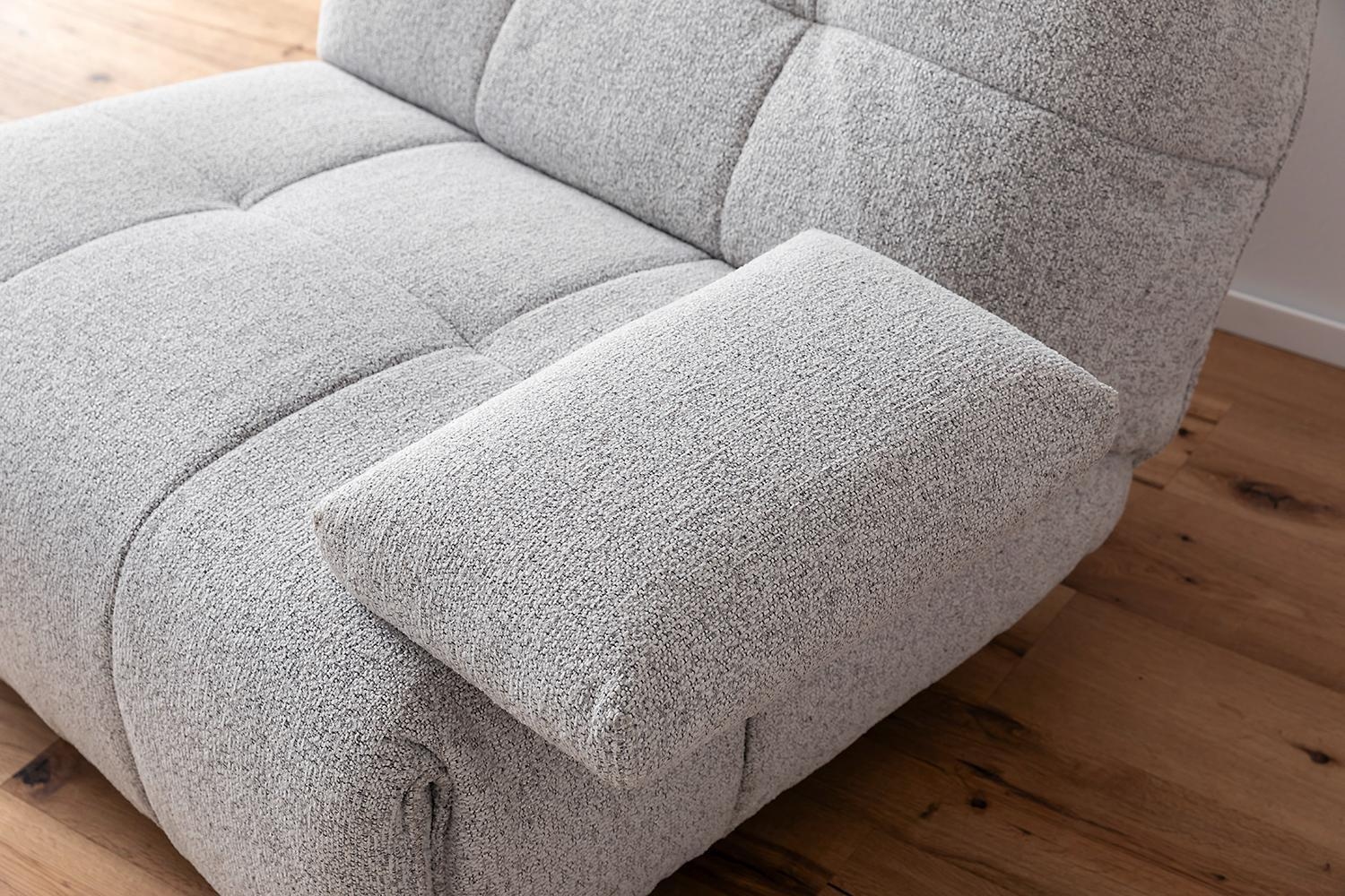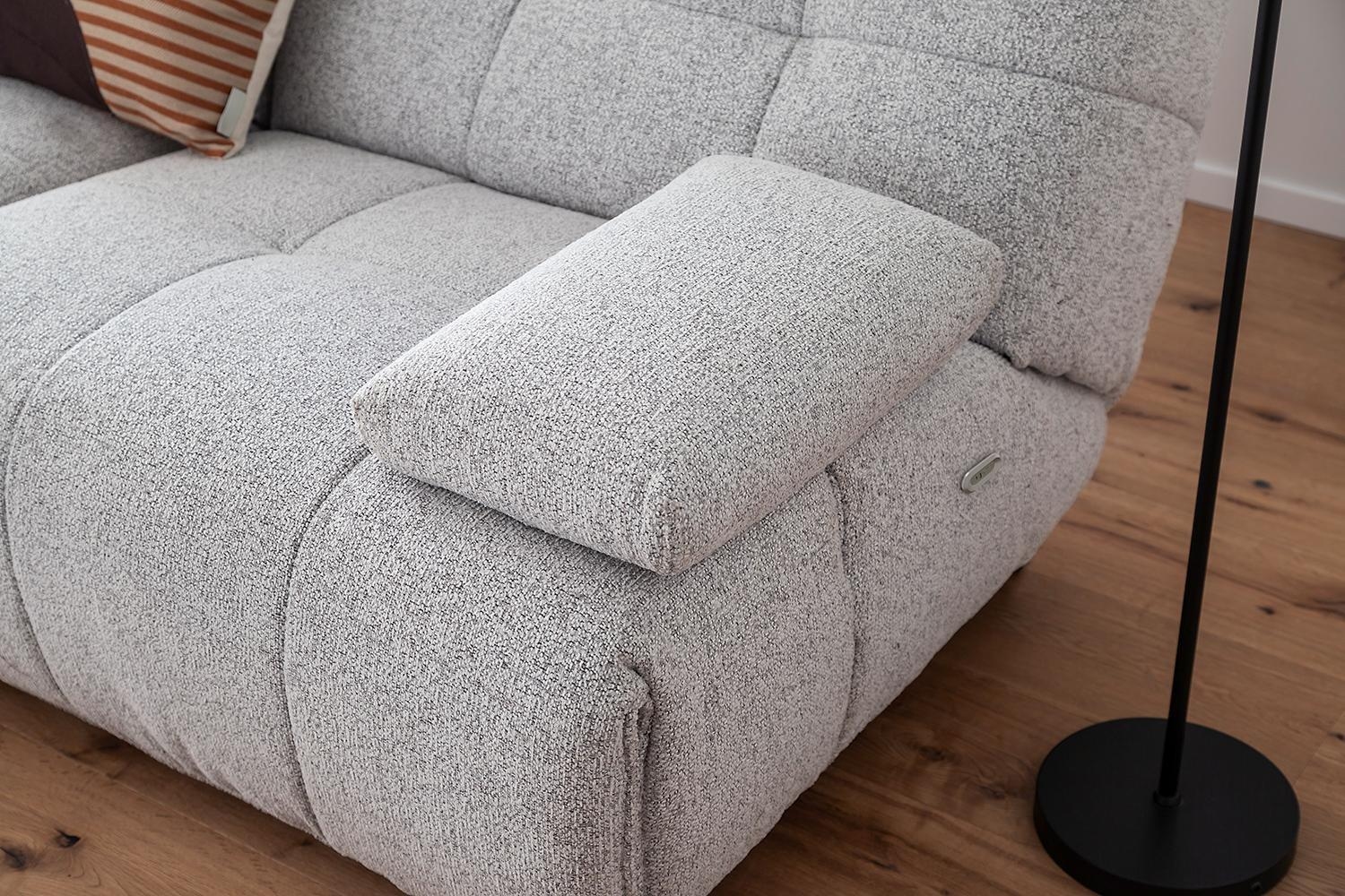 Der Sessel BASTA ist mit einem hellgrauen Stoffbezug ausgestattet. Die Relaxfunktion sowie das Fußteil werden über einen Elektromotor gesteuert. Für zusätzlichen Komfort lässt sich die Kopfstütze manuell in drei Positionen verstellen.