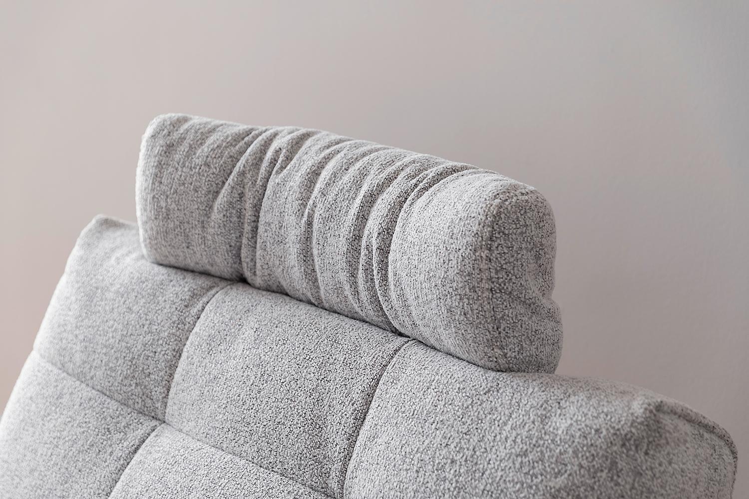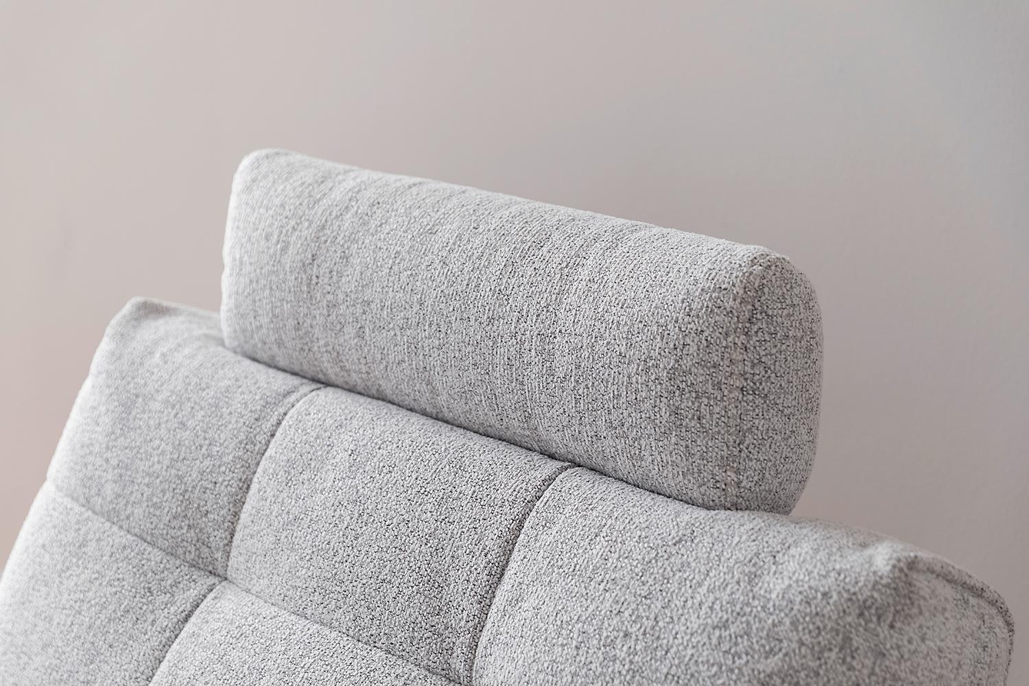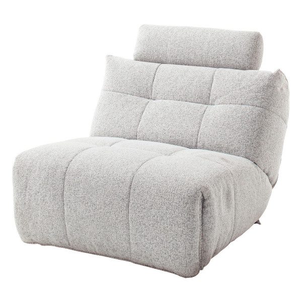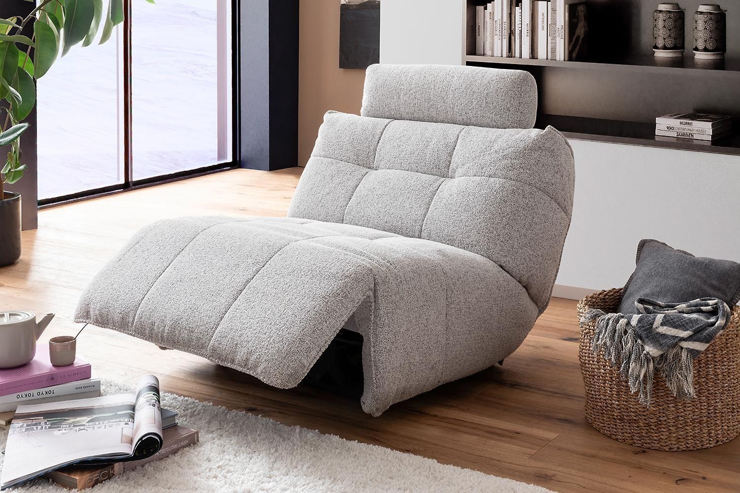 Der Sessel BASTA ist mit einem hellgrauen Stoffbezug ausgestattet. Die Relaxfunktion sowie das Fußteil werden über einen Elektromotor gesteuert. Für zusätzlichen Komfort lässt sich die Kopfstütze manuell in drei Positionen verstellen.