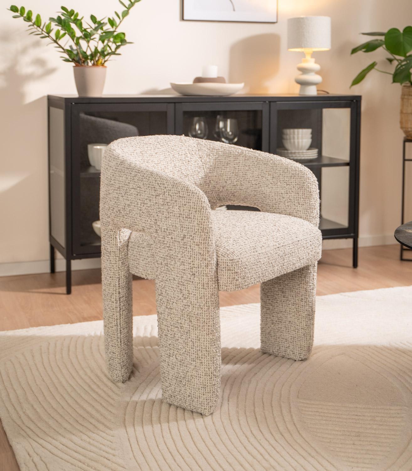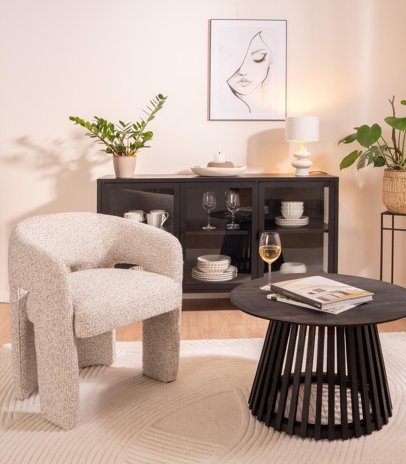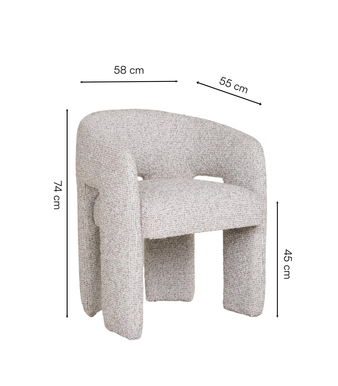 Der Sessel MARYLIN ist mit einem Stoffbezug in Beige ausgestattet und verfügt über eine Polsterung aus Kaltschaum, die eine gleichmäßige Sitzfläche bietet. Die gepolsterten Armlehnen tragen zur komfortablen Nutzung bei. Der Sessel wird vollständig montiert geliefert, sodass kein Zusammenbau erforderlich ist. Mit einer Breite von 58 cm, einer Höhe von 74 cm und einer Tiefe von 55 cm besitzt er kompakte Abmessungen. Die Sitzhöhe beträgt 45 cm, die Sitztiefe liegt bei 50 cm.