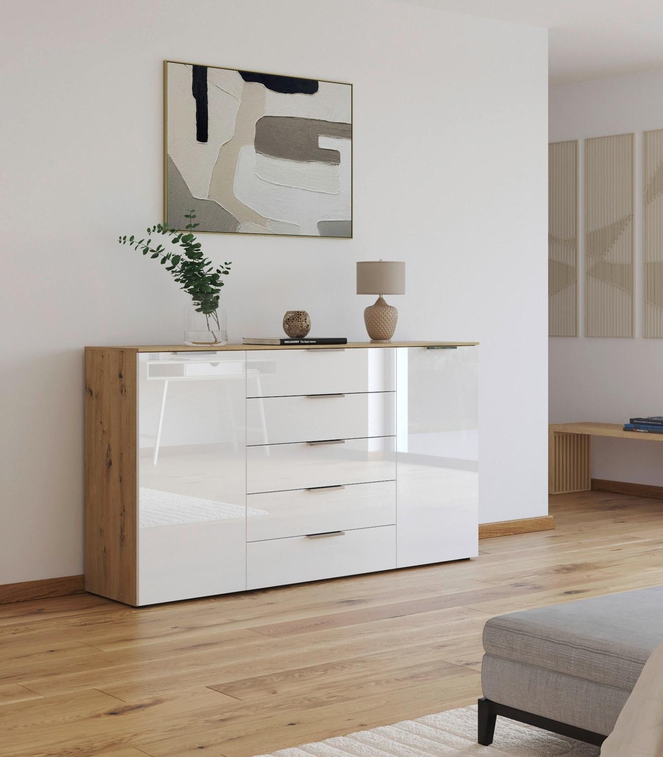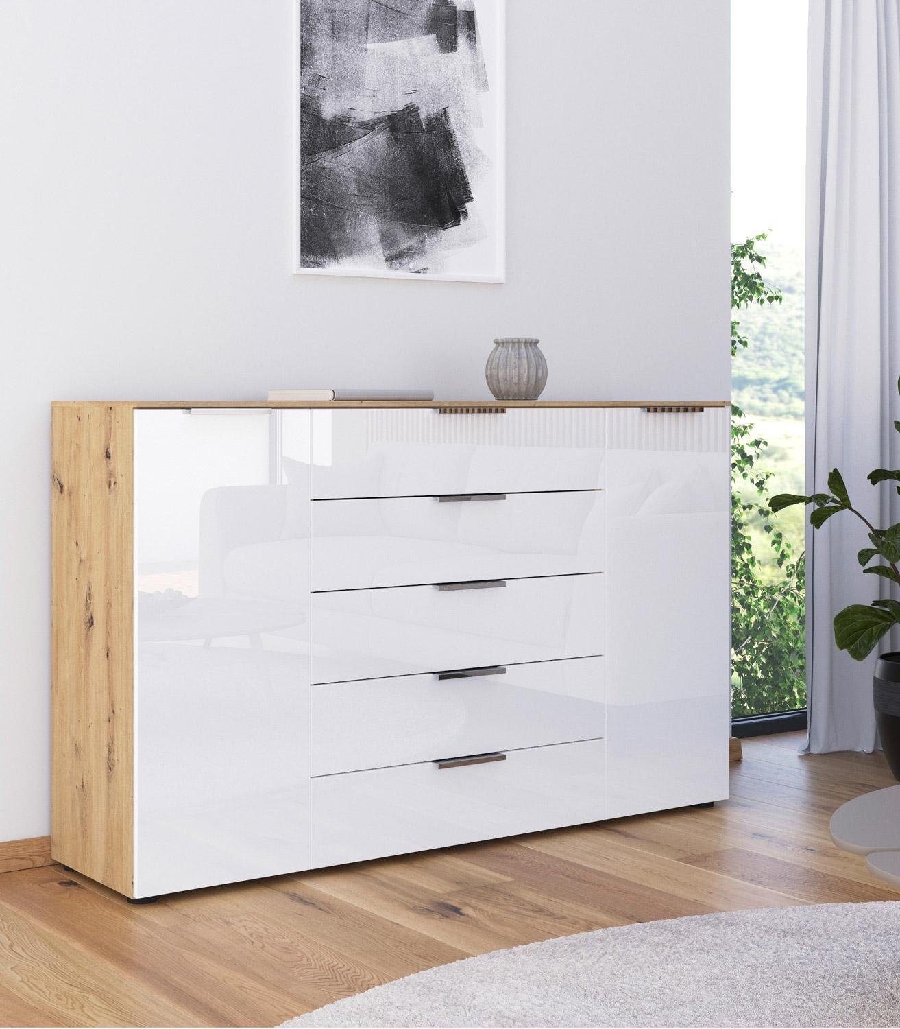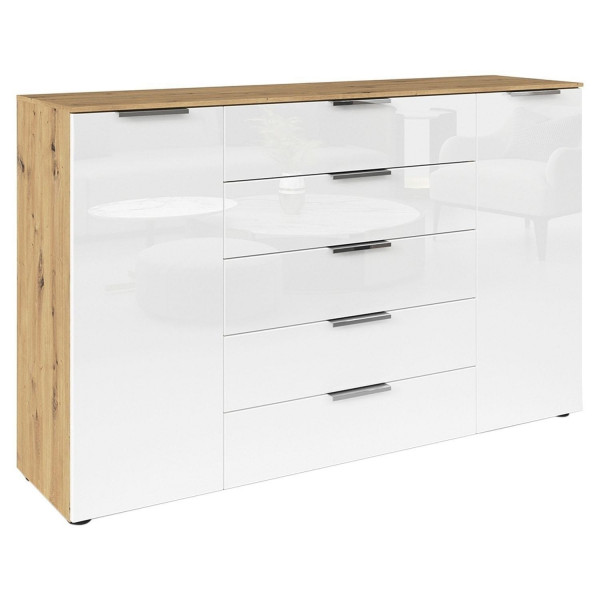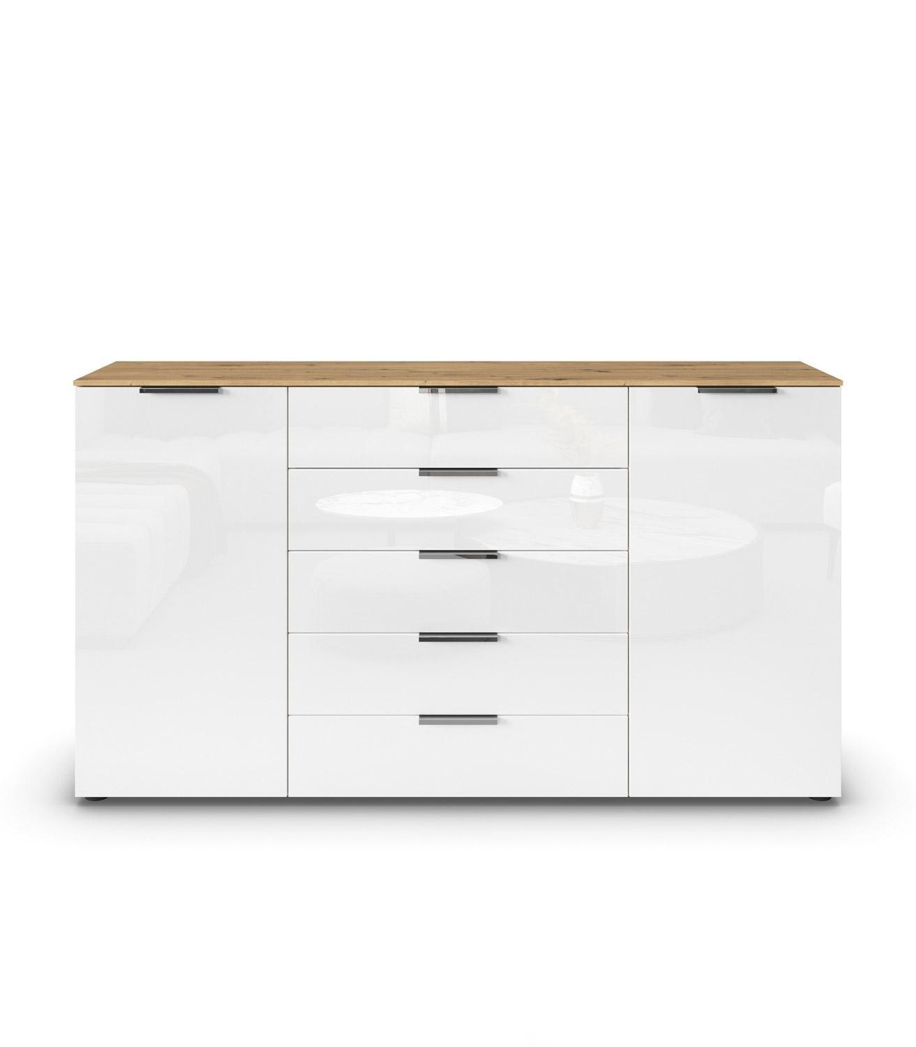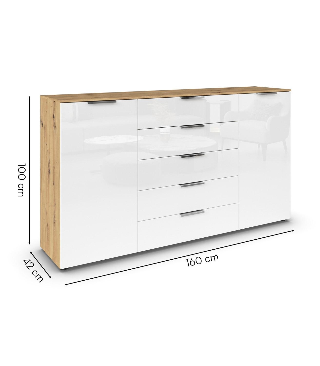 Das Sideboard FELPI ist ein Möbelstück, hergestellt in Deutschland. Mit einer Breite von 160 cm, einer Höhe von 100 cm und einer Tiefe von 42 cm bietet es großzügigen Stauraum. Der Korpus ist aus Holzwerkstoff gefertigt und mit einem edlen Artisan Eiche Dekor versehen, während die Fronten aus weißem Glas für ein modernes Erscheinungsbild sorgen. Das Sideboard verfügt über zwei Türen und fünf Schubladen mit Soft-Close-Funktion. Die chromfarbenen Griffe setzen stilvolle Akzente und erleichtern die Handhabung.