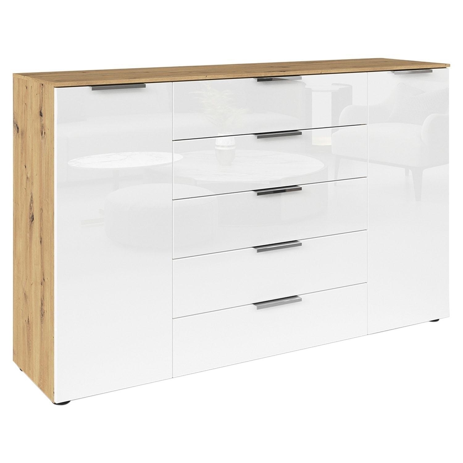 160 x 100 cm - 2 Türen - 5 Schubladen - Artisan Eiche Dekor - Weiß - Glas