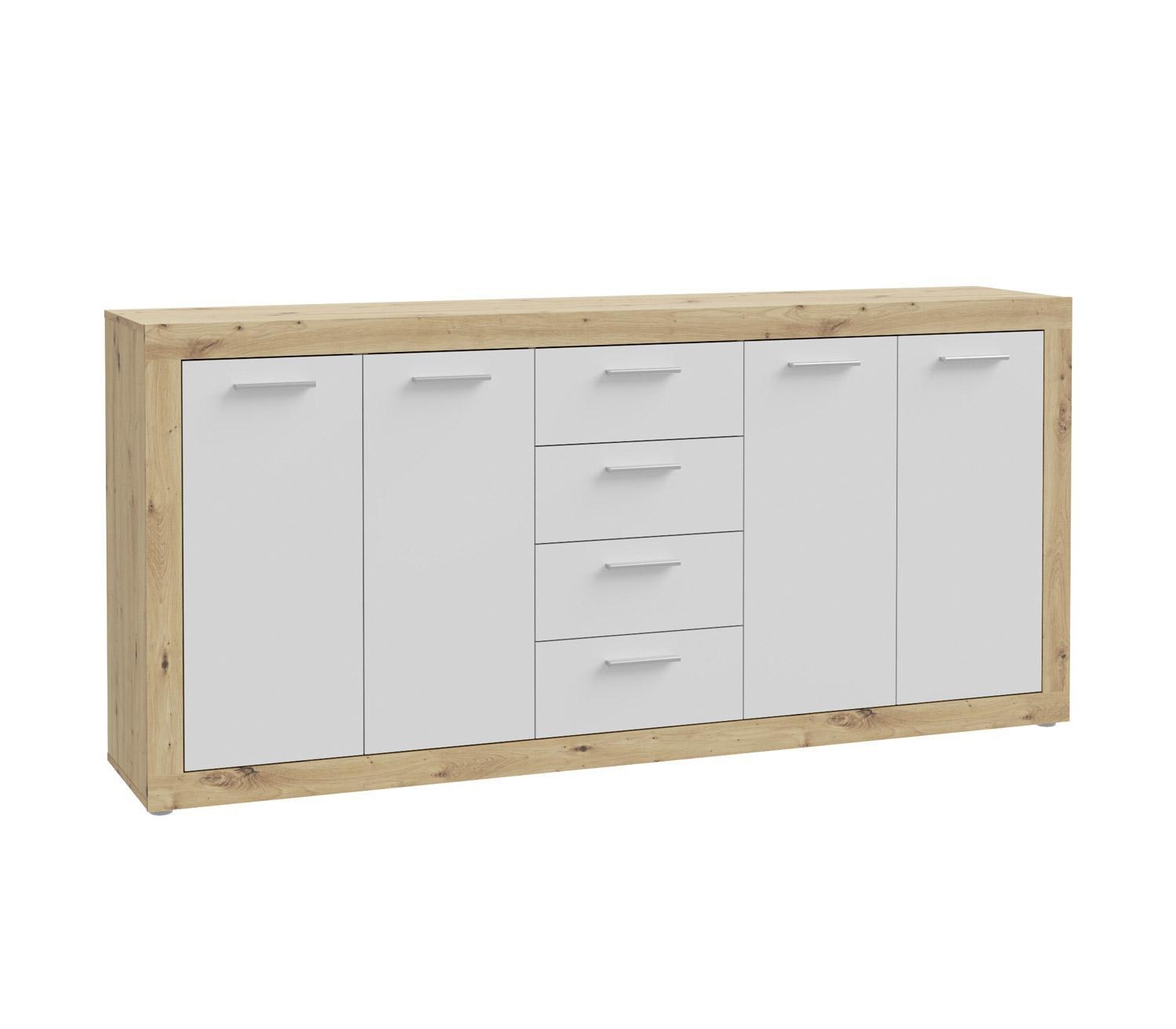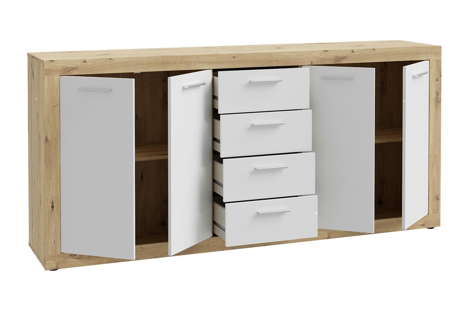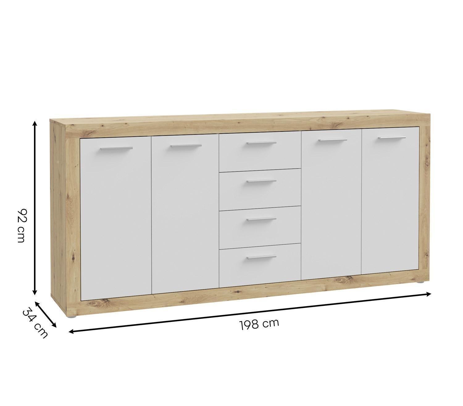 Das Sideboard BIONDA ist in Artisan Eiche Dekor gefertigt und verfügt über Fronten in Weiß matt. Es ist mit vier Türen und vier Schubladen ausgestattet. Hinter den Türen befinden sich zwei Einlegeböden, die mehrfach höhenverstellbar sind. Die Oberplatte ist bis maximal 40 kg belastbar. Das Sideboard hat eine Breite von 198 cm, eine Höhe von 92 cm und eine Tiefe von 34 cm.