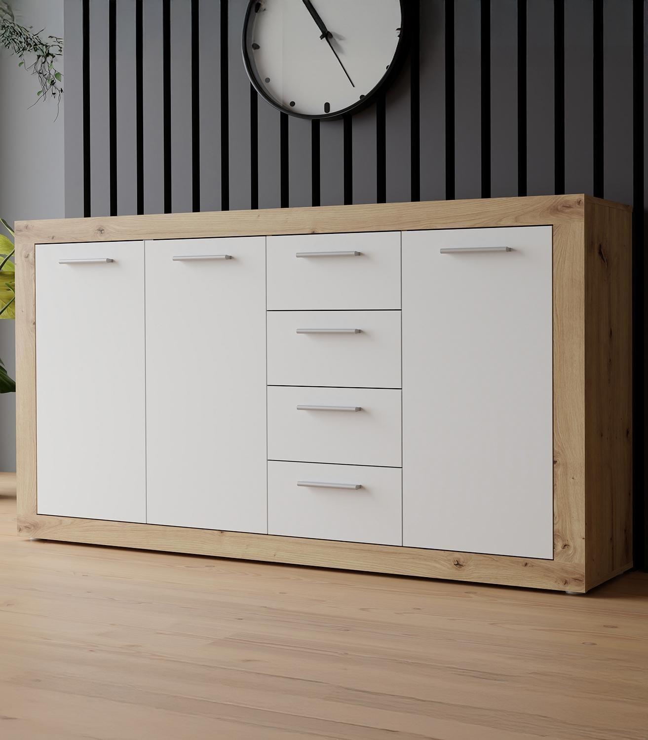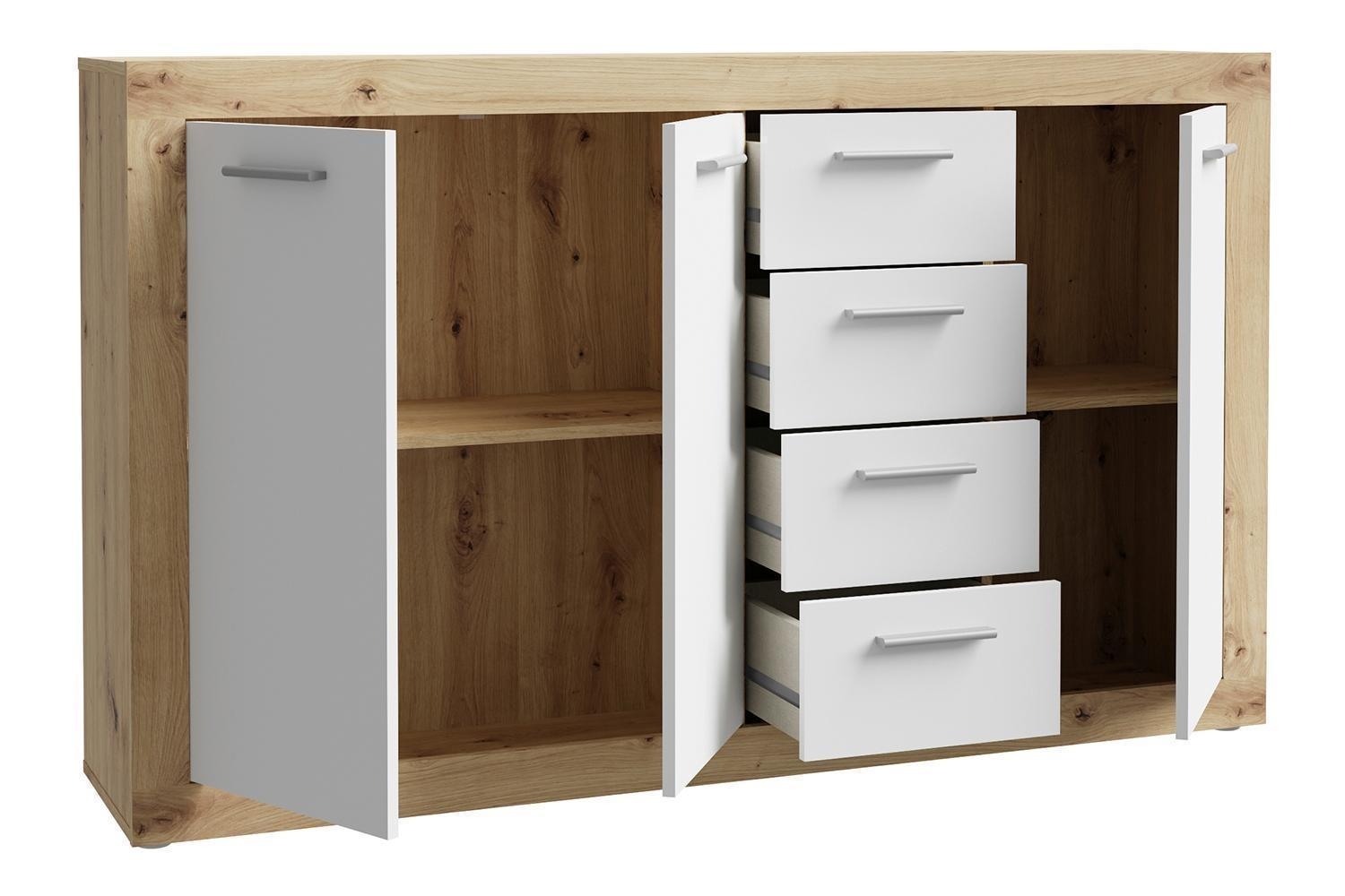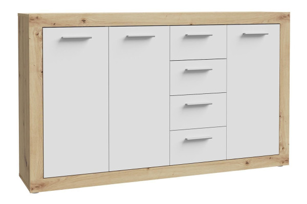 Das Sideboard BIONDA ist in Artisan Eiche Dekor gefertigt und verfügt über Fronten in Weiß matt. Es ist mit drei Türen und vier Schubladen ausgestattet. Hinter den Türen befinden sich zwei Einlegeböden, die mehrfach höhenverstellbar sind. Die Oberplatte ist bis maximal 40 kg belastbar. Das Sideboard hat eine Breite von 153 cm, eine Höhe von 92 cm und eine Tiefe von 34 cm.