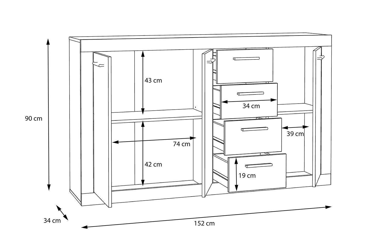 | Lieferumfang: | 1 Sideboard mit 3 Türen, 4 Schubladen und 2 mehrfach höhenverstellbaren Einlegeböden |