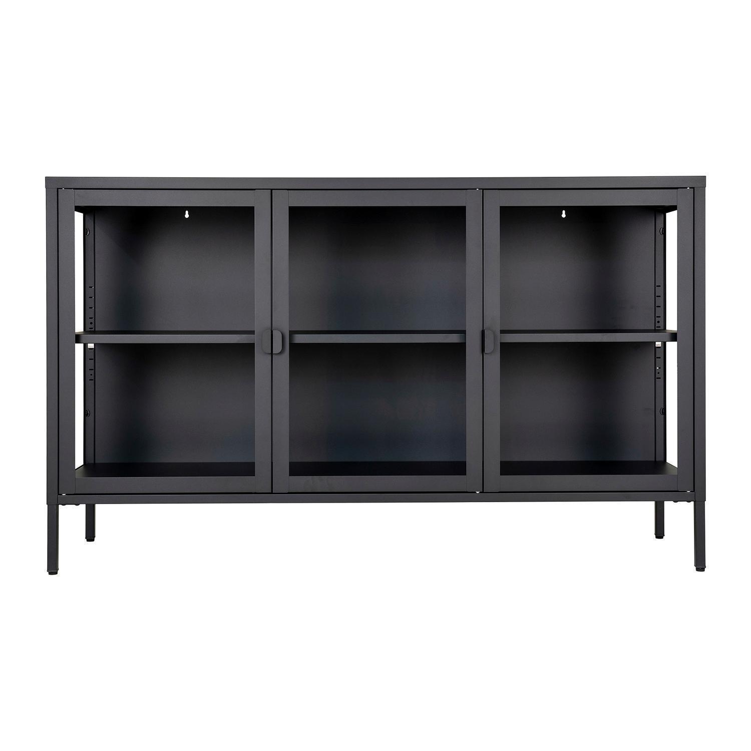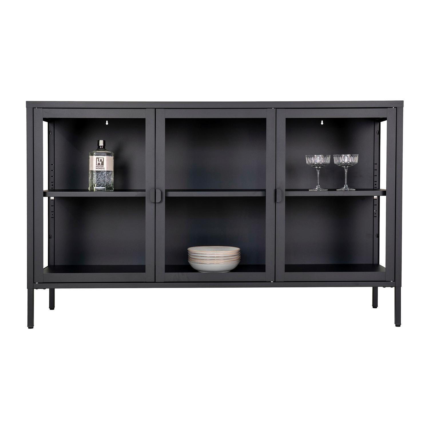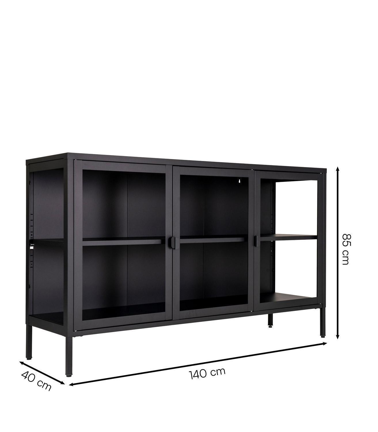 Das Sideboard BOND besteht aus schwarzem Stahl und ist mit einer pulverbeschichteten Oberfläche versehen. Die Seiten und Fronten sind aus transparentem Glas gefertigt. Das Möbelstück verfügt über drei Türen sowie einen höhenverstellbaren Einlegeboden. Die Maße des Sideboards betragen 140 cm in der Breite, 85 cm in der Höhe und 40 cm in der Tiefe.