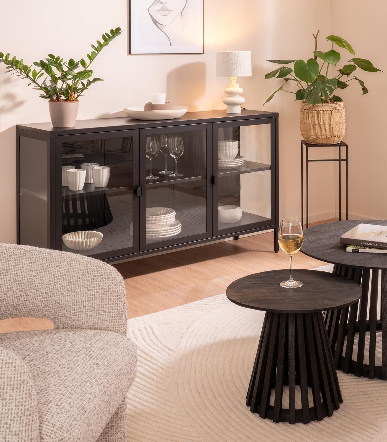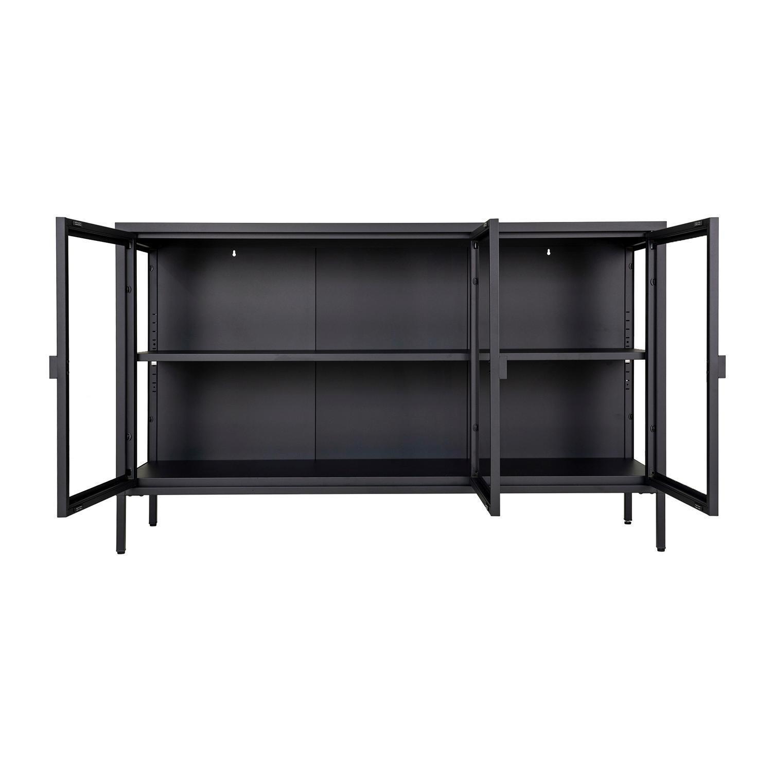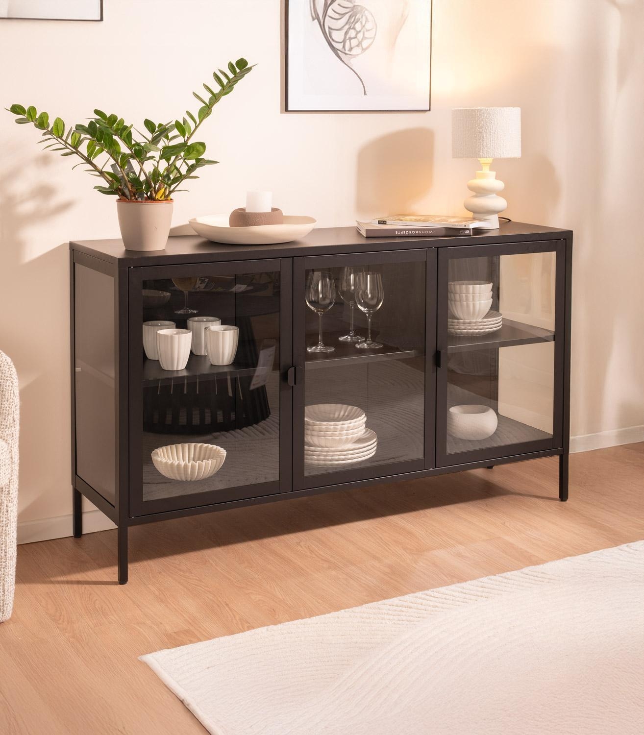 Das Sideboard BOND besteht aus schwarzem Stahl und ist mit einer pulverbeschichteten Oberfläche versehen. Die Seiten und Fronten sind aus transparentem Glas gefertigt. Das Möbelstück verfügt über drei Türen sowie einen höhenverstellbaren Einlegeboden. Die Maße des Sideboards betragen 140 cm in der Breite, 85 cm in der Höhe und 40 cm in der Tiefe.