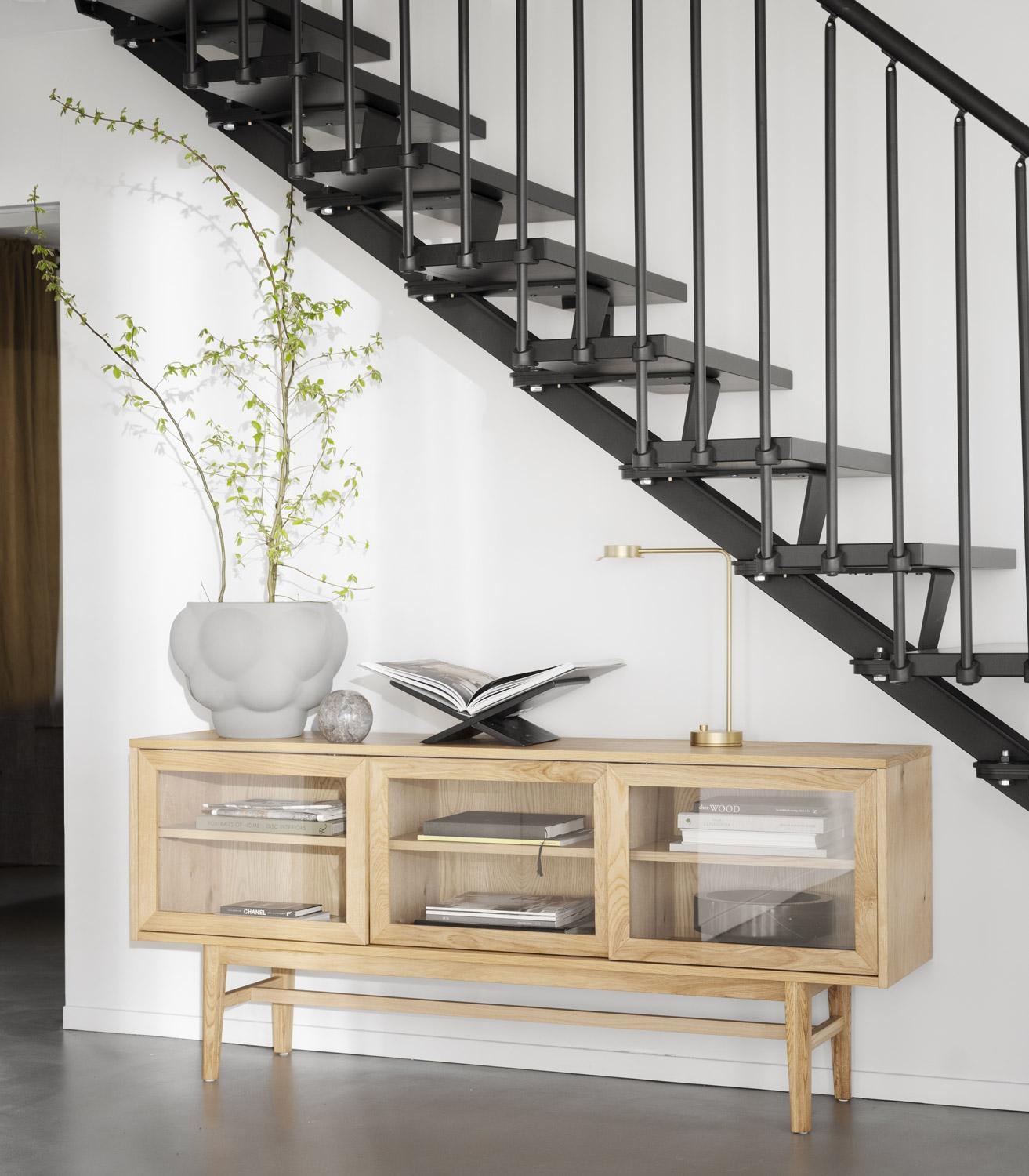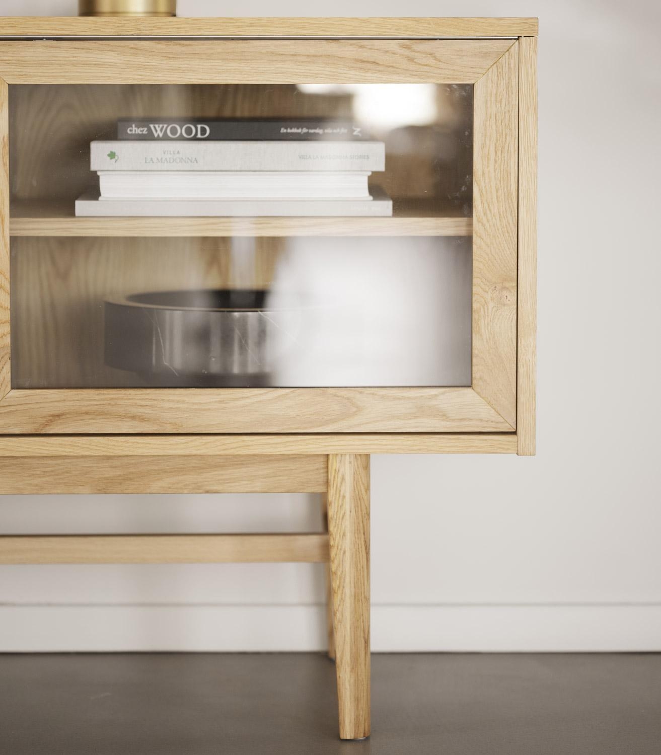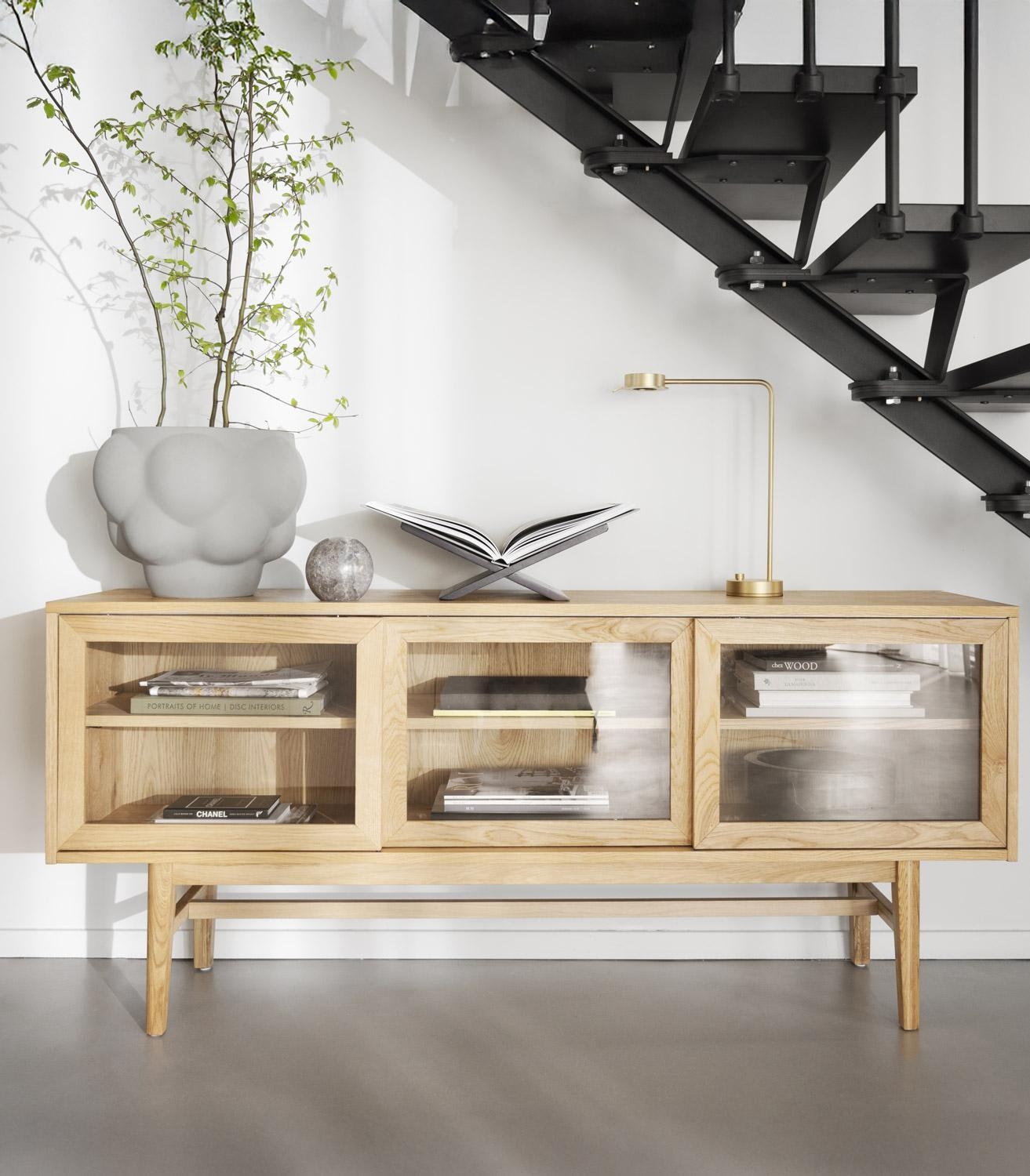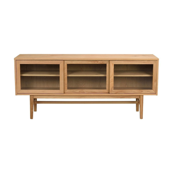 Das Sideboard HAZELTON ist mit einem Korpus und Gestell aus massivem Eichenholz in Braun gefertigt. Die Fronten bestehen aus Eichenholzfurnier in derselben Farbgebung. Seiten- und Frontflächen sind mit transparentem Glas ausgestattet, das den Blick auf den Innenbereich freigibt. Das Möbelstück verfügt über drei Schiebetüren sowie drei feste Einlegeböden. Die Maße betragen 170 cm in der Breite, 75 cm in der Höhe und 40 cm in der Tiefe.