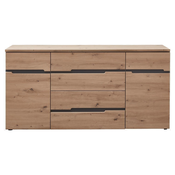 Das Sideboard MIRENO ist in Artisan Eiche Dekor gefertigt und wird durch Absetzungen in Graphitgrau ergänzt. Es verfügt über zwei Türen und drei Schubladen, die mit insgesamt vier Einlegeböden im Inneren zusätzlichen Stauraum bieten. Die Maße des Sideboards betragen 165 cm in der Breite, 82 cm in der Höhe und 44 cm in der Tiefe.