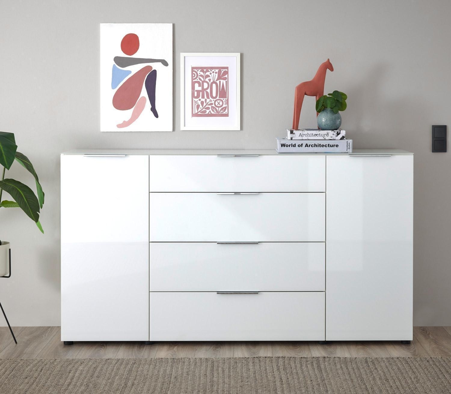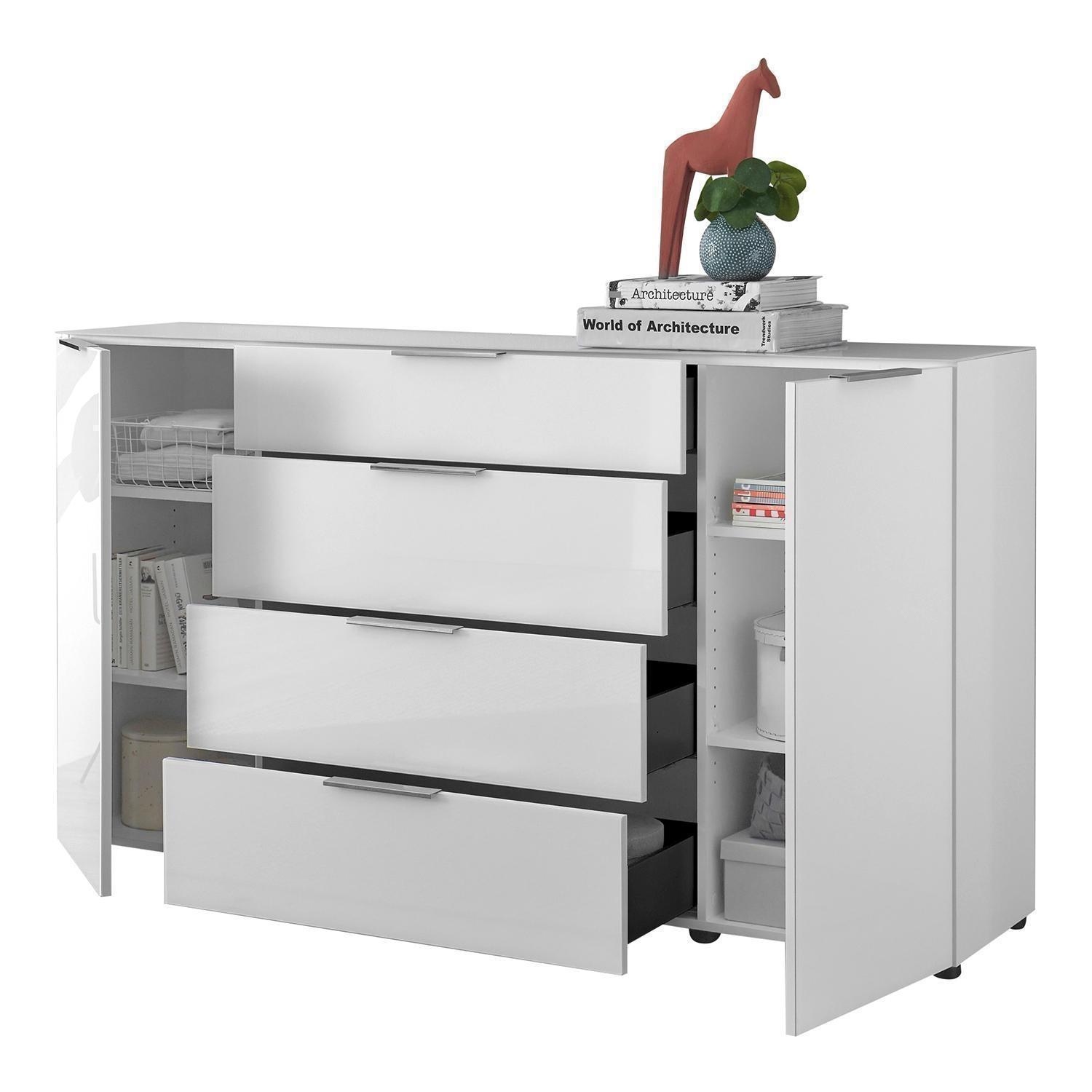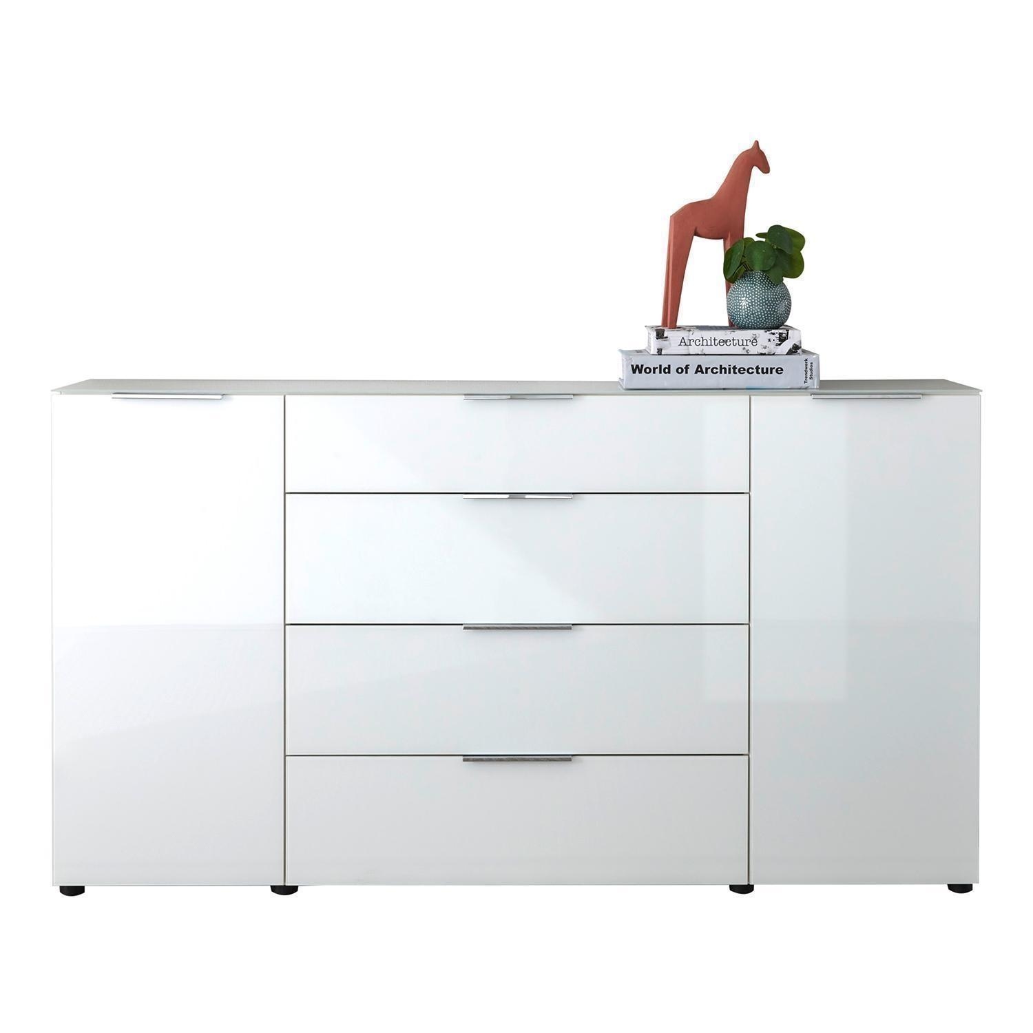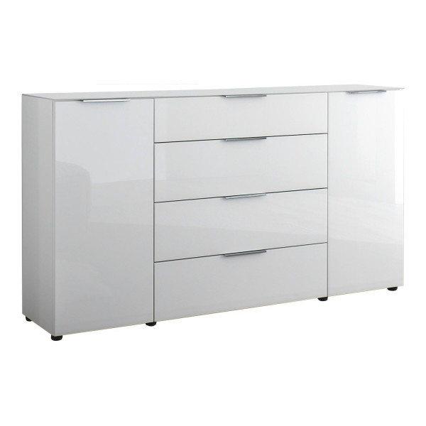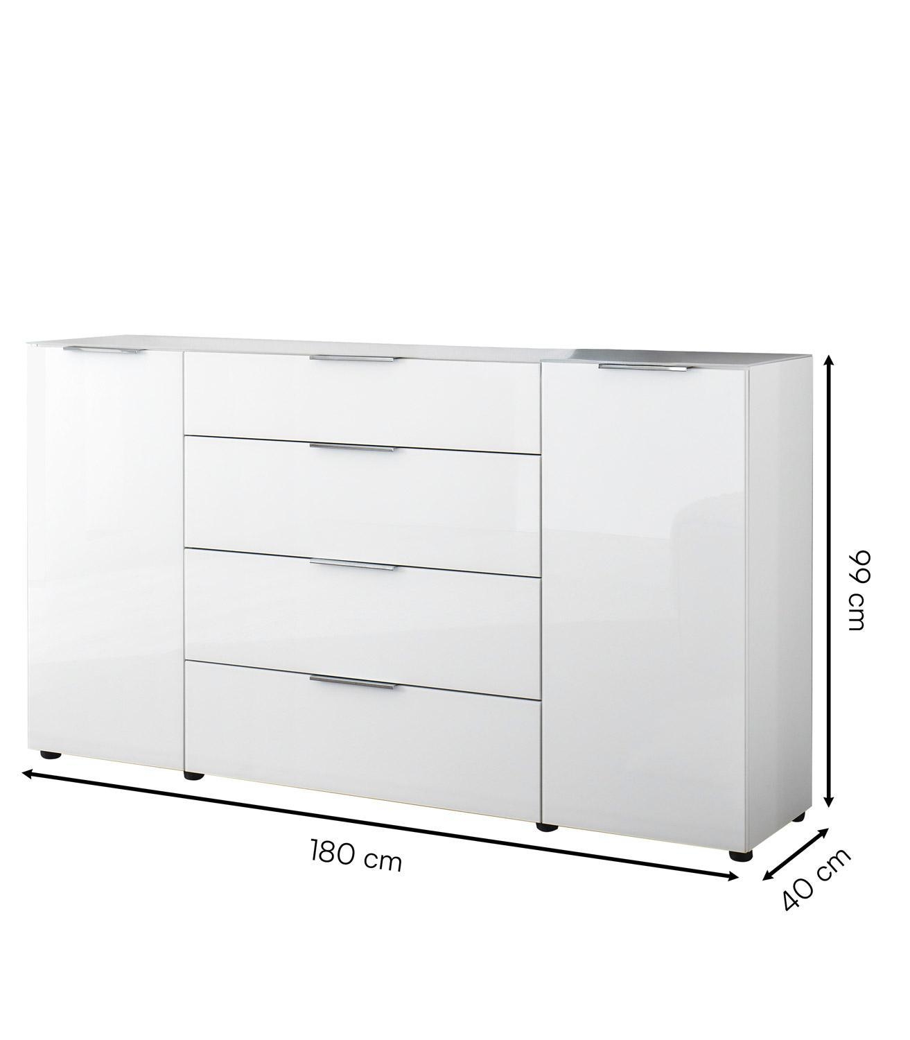 180 x 99 cm - 2 Türen - 4 Schubladen - Weißglas - Weiß matt