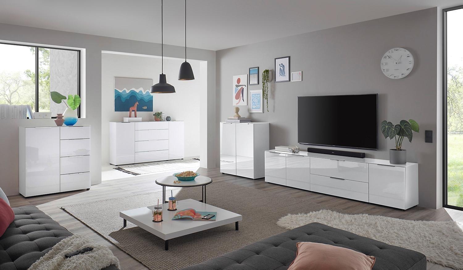 Das Sideboard SAKURA in Weiß matt bietet mit zwei Türen, vier Schubladen und vier höhenverstellbaren Einlegeböden vielseitigen Stauraum. Die Fronten aus Weißglas verleihen ihm ein elegantes Erscheinungsbild. Die Griffe aus verchromtem Metall runden das Design ab. Dank der Soft-Close-Funktion schließen die Türen und Schubladen leise und sanft. Das Sideboard misst 180 cm in der Breite, 99 cm in der Höhe und 40 cm in der Tiefe.