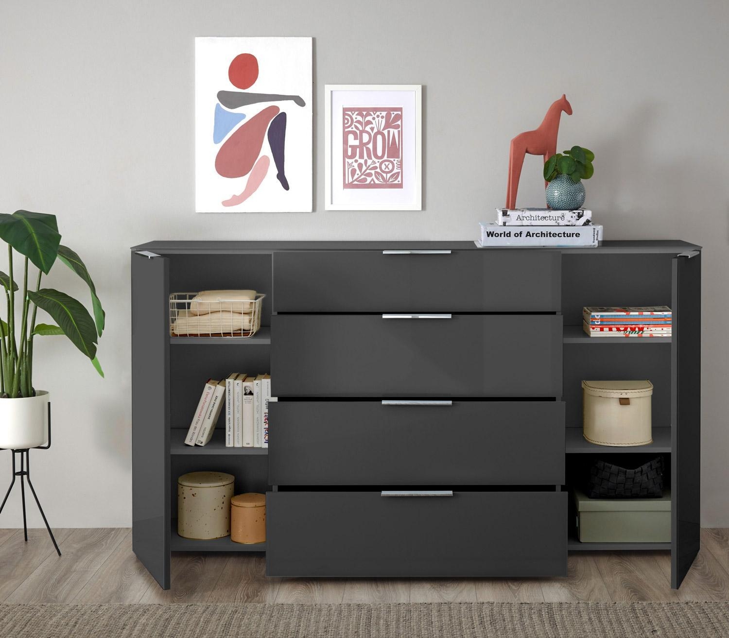 Das Sideboard SAKURA in Anthrazit matt bietet mit zwei Türen, vier Schubladen und vier höhenverstellbaren Einlegeböden vielseitigen Stauraum. Die Fronten aus Anthrazitglas verleihen ihm ein elegantes Erscheinungsbild. Die Griffe aus verchromtem Metall runden das Design ab. Dank der Soft-Close-Funktion schließen die Türen und Schubladen leise und sanft. Das Sideboard misst 180 cm in der Breite, 99 cm in der Höhe und 40 cm in der Tiefe.