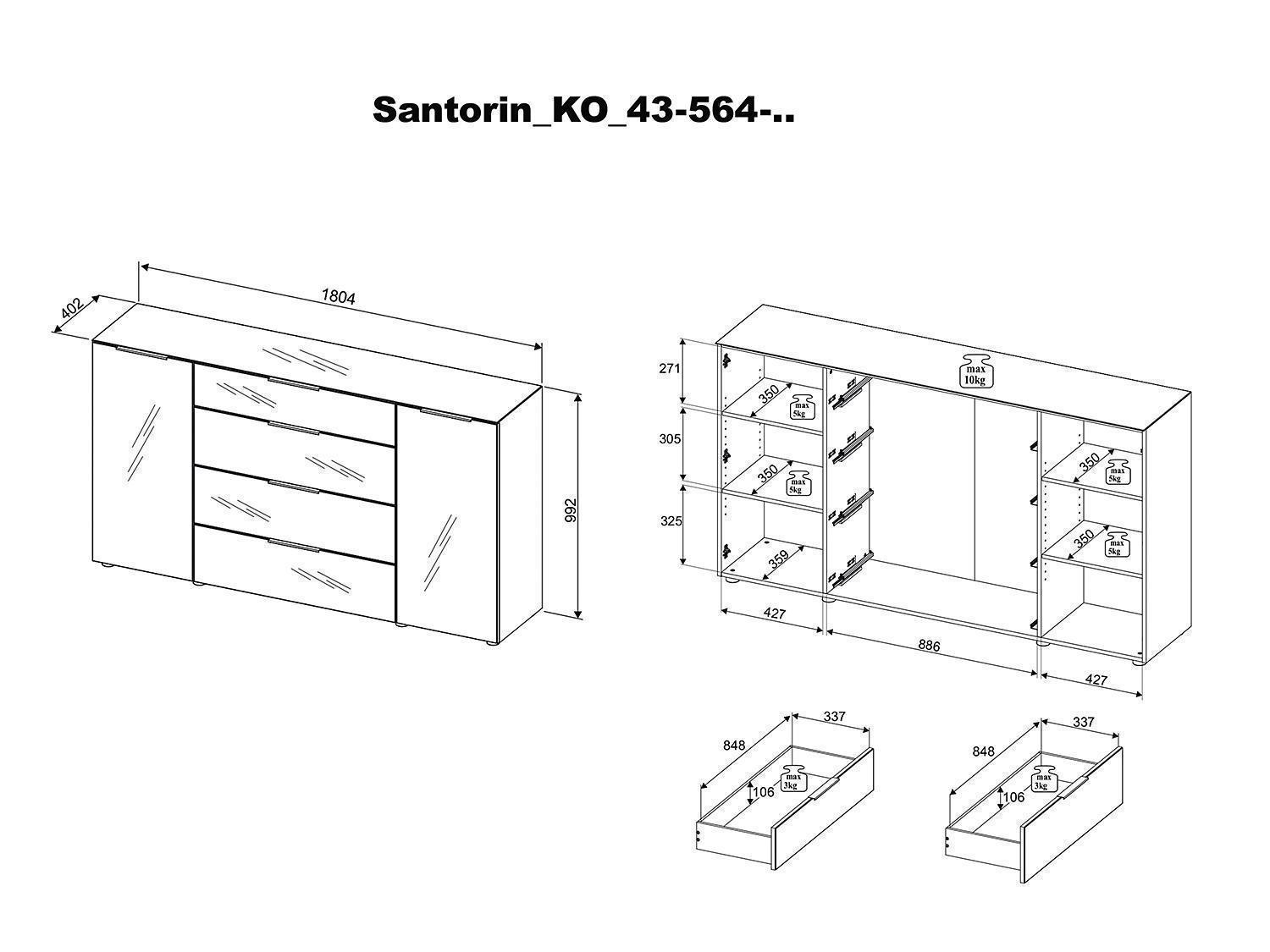 | Lieferumfang: | 1 Sideboard mit 2 Türen, 4 Schubladen und 4 höhenverstellbaren Einlegeböden |