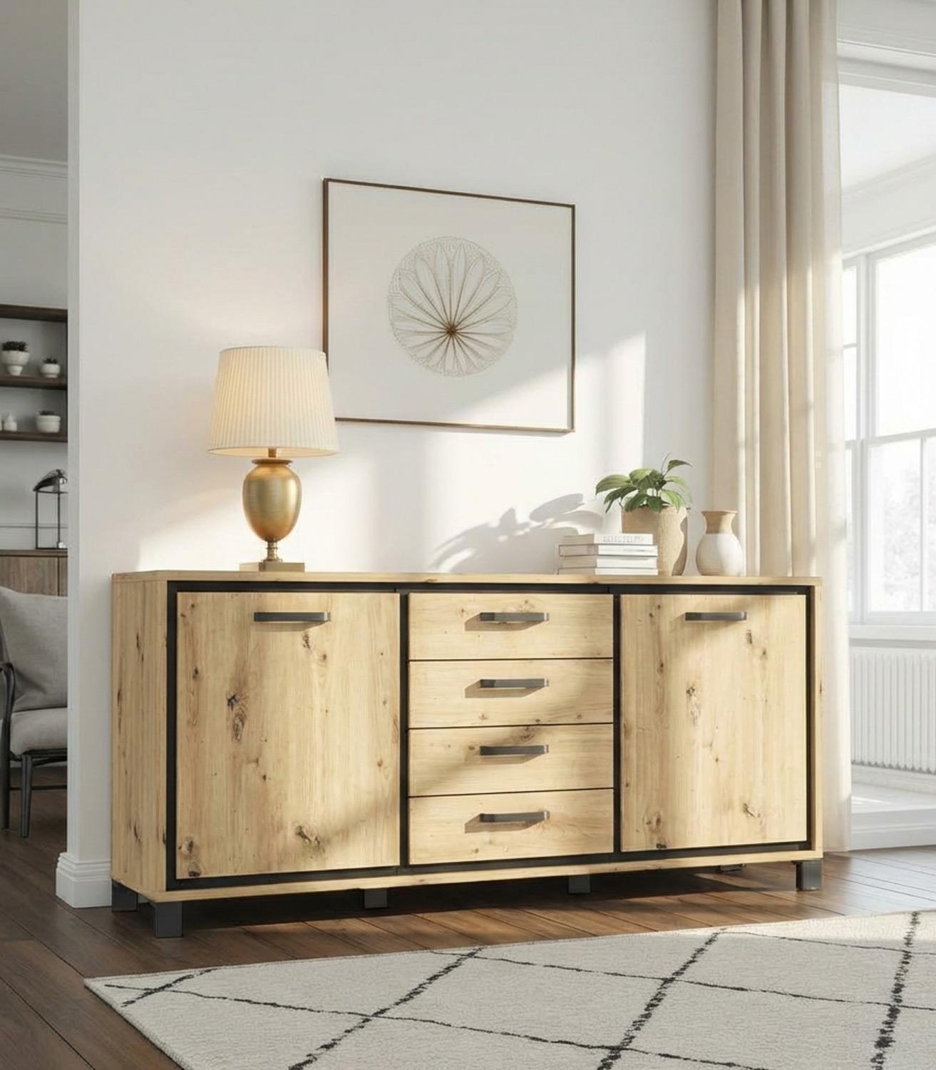 Das Sideboard in Artisan Eiche Dekor kombiniert ansprechendes Design mit funktionaler Praktikabilität. Die Eicheoptik verleiht dem Möbelstück eine natürliche Ausstrahlung. Schwarze Füße und Absetzungen setzen dabei moderne Akzente, während Griffe aus Metall eine elegante Note hinzufügen. Mit 4 Schubladen und 2 Türen bietet das Sideboard vielseitigen Stauraum für eine ordentliche Aufbewahrung von Gegenständen. Ein stilvolles Möbelstück, das sowohl ästhetisch als auch funktional überzeugt und sich harmonisch in unterschiedliche Einrichtungsstile einfügt.