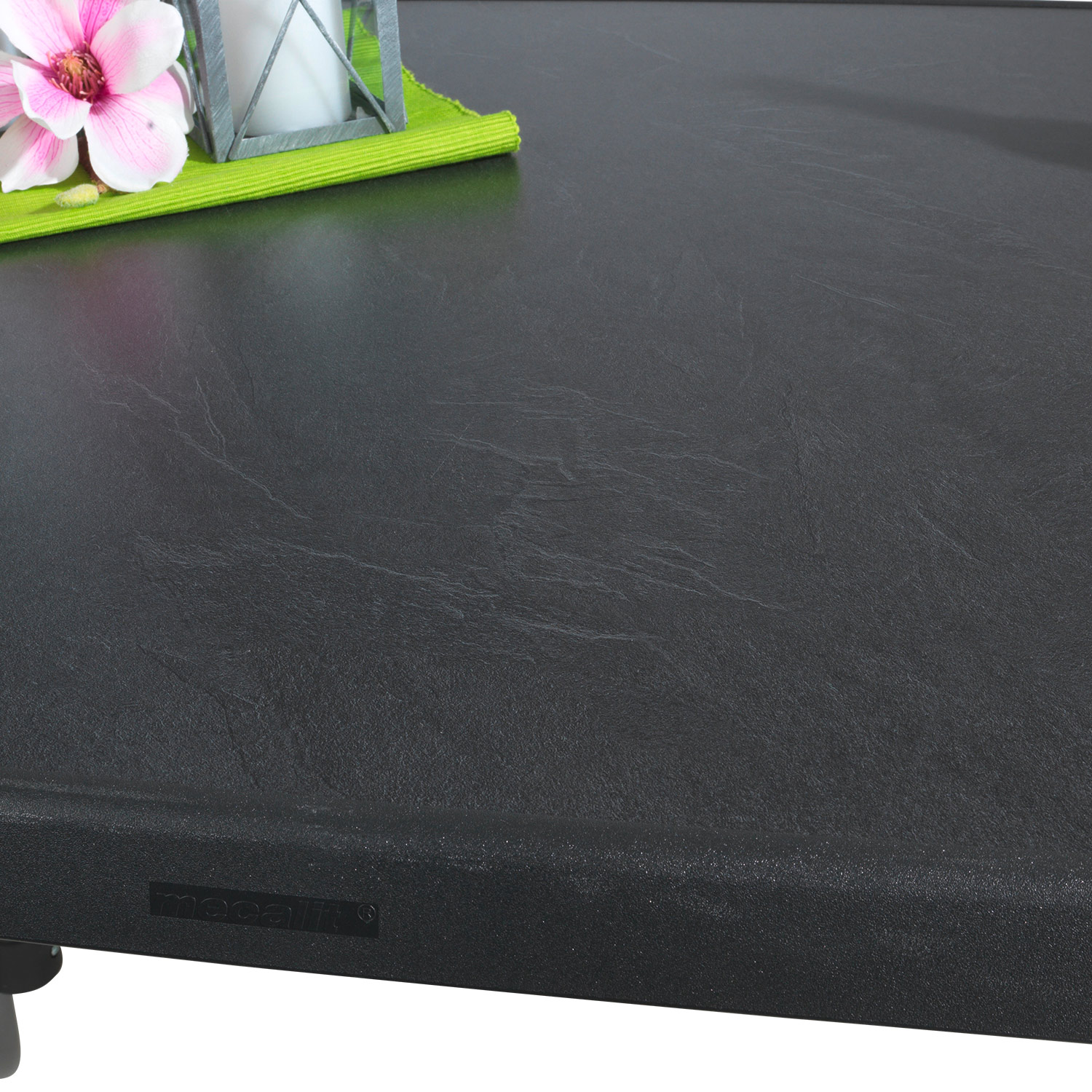 Die Tischplatte des Gartentisches besteht aus Mecalit. Einem Material, dass aus mehreren hochverdichteten Pressspanplatten in Verbindung mit einem Kunststoffmaterial entsteht. Dadurch wird die Tischplatte wetterfest, schlagfest, glutfest und säurebeständig. Außerdem ist die Tischplatte kältefest, wodurch der Tisch auch in kälteren Monaten und sogar bei Schnee im Freien stehen kann.