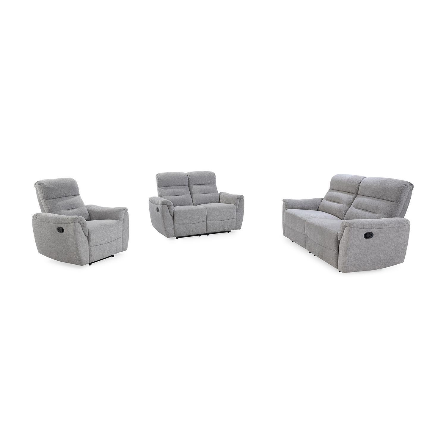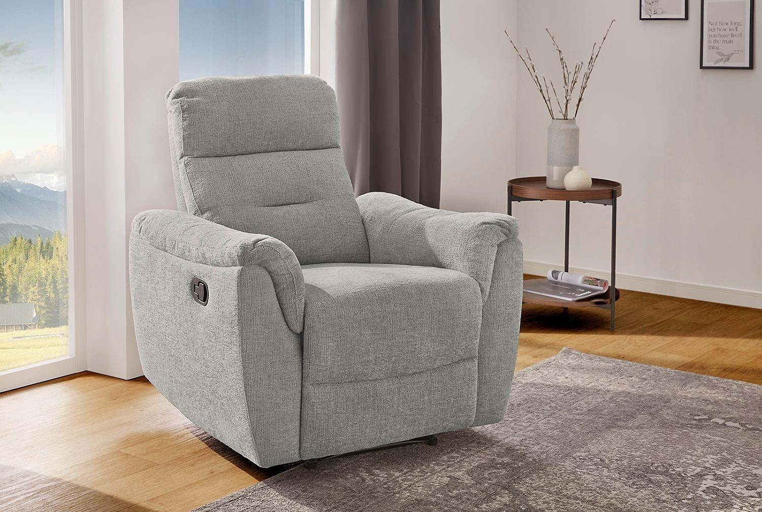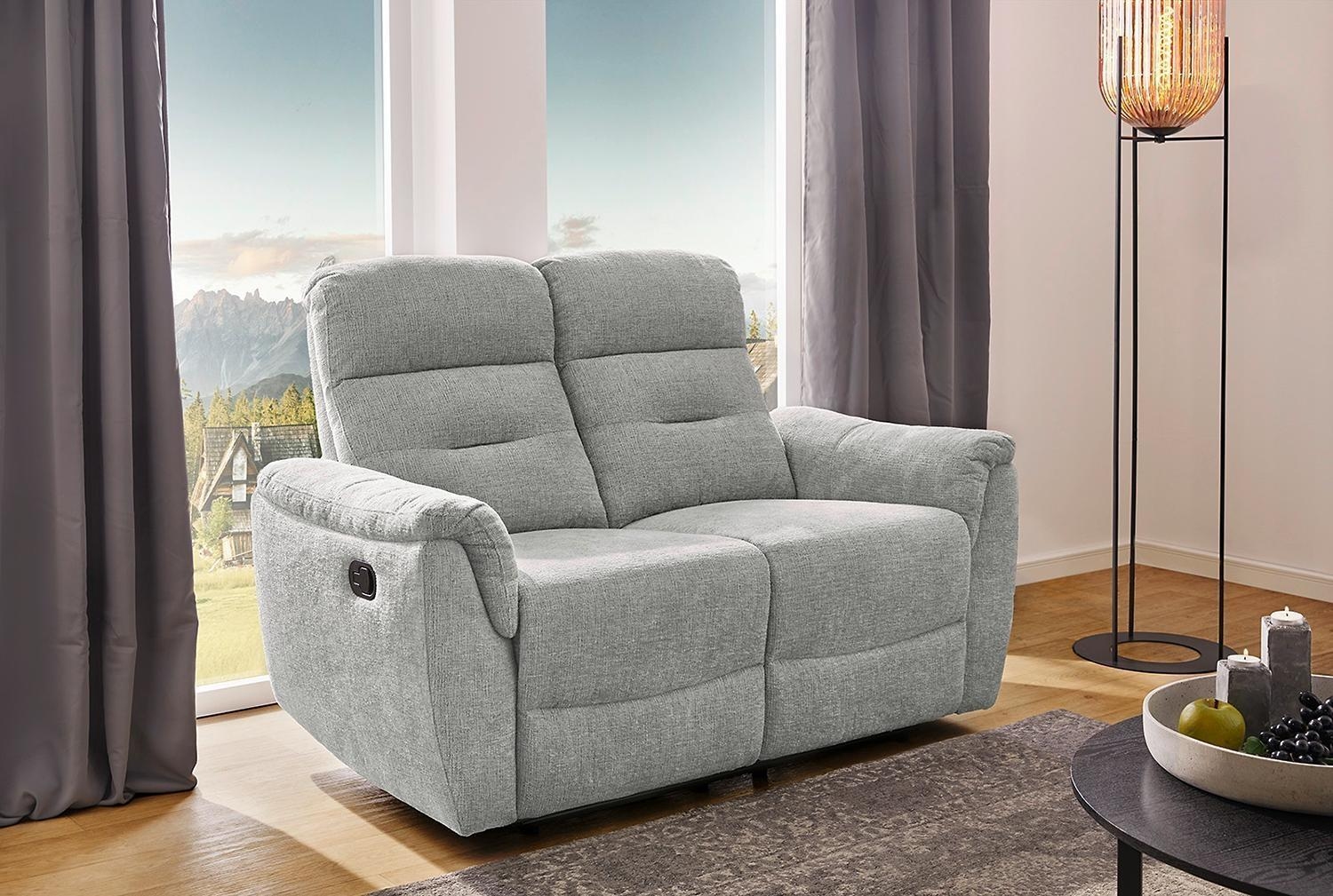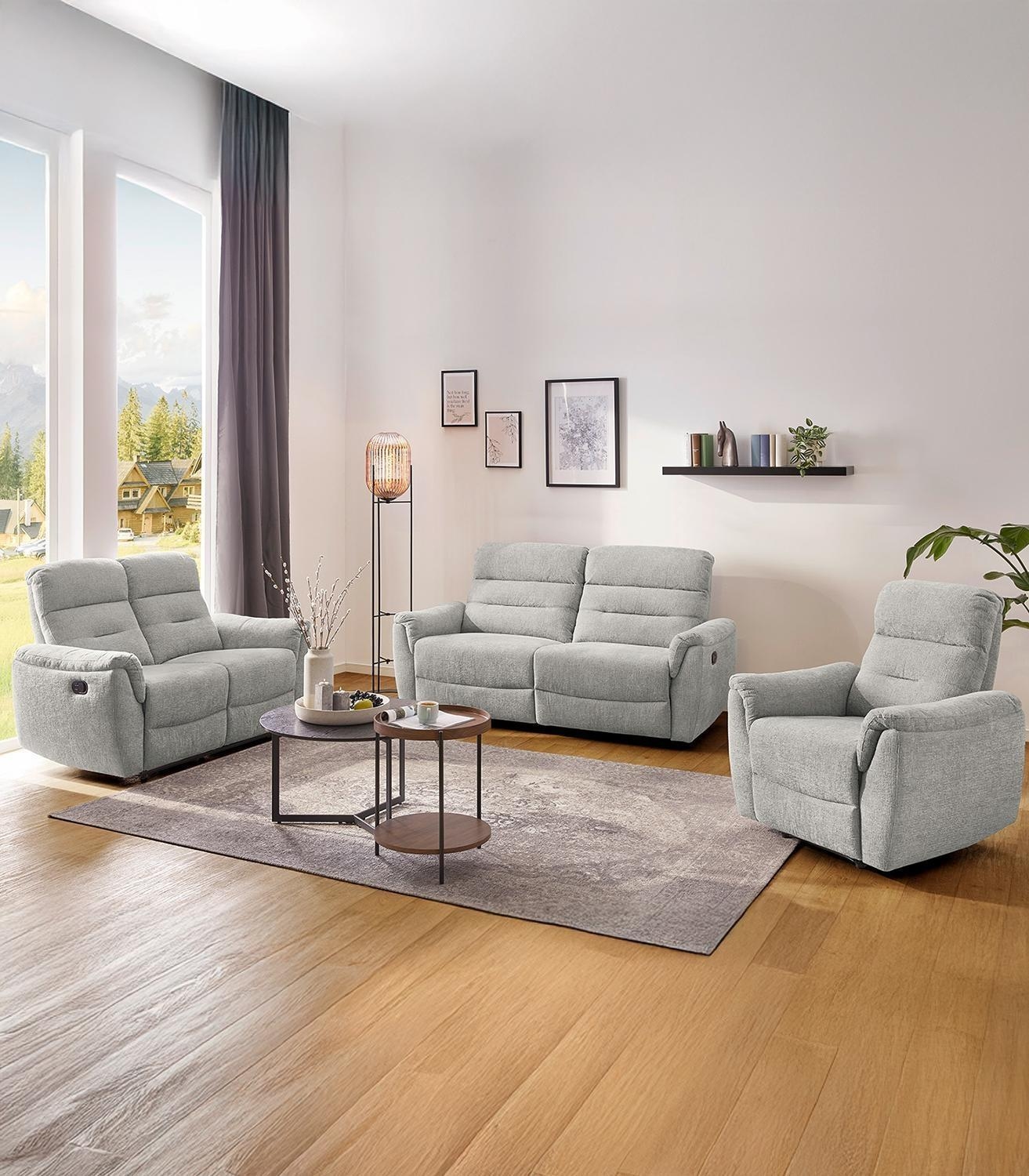 Die dreiteilige Sofagarnitur UWE zeichnet sich durch ihren Chenillebezug in Hellgrau aus. Sie setzt sich aus einem 3-Sitzer, einem 2-Sitzer und einem Sessel zusammen. Für hohen Sitzkomfort sorgt eine Polsterung mit Tonnentaschen-Federkern und Wellenunterfederung. Die Garnitur verfügt über eine halbautomatische Relaxfunktion, die eine synchrone Verstellung des Fußteils ermöglicht. Die einzelnen Sitze lassen sich dabei durch Betätigung eines Seitenhebels in Kombination mit Körperdruck individuell verstellen.