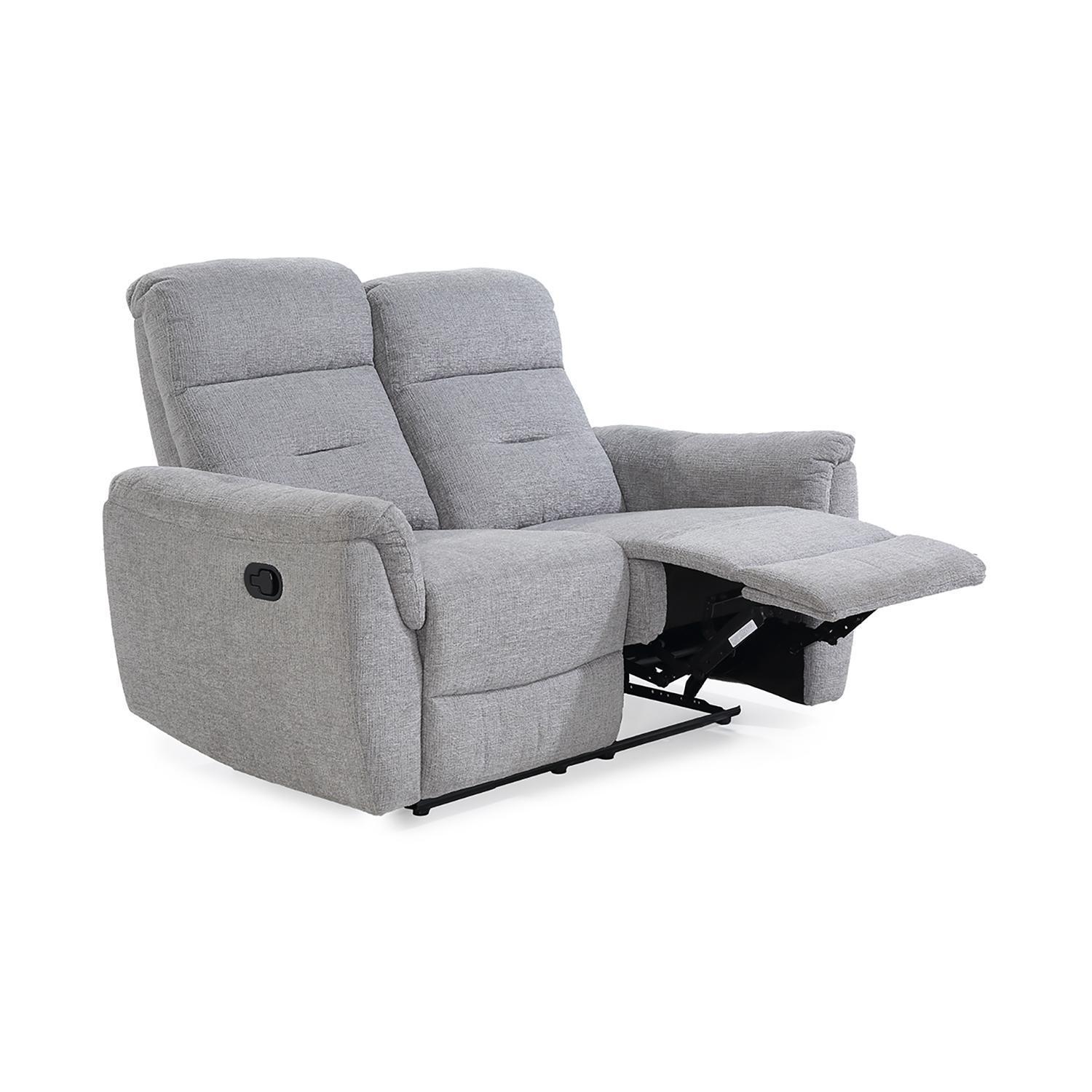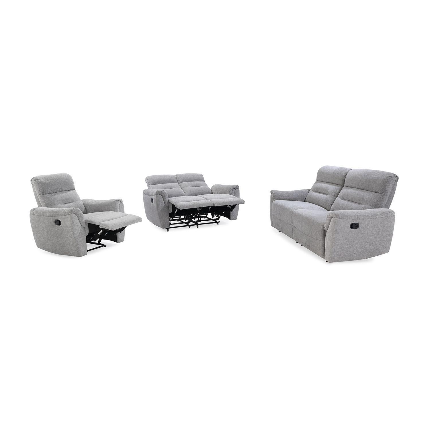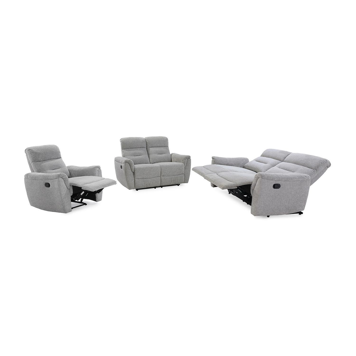 Die dreiteilige Sofagarnitur UWE zeichnet sich durch ihren Chenillebezug in Hellgrau aus. Sie setzt sich aus einem 3-Sitzer, einem 2-Sitzer und einem Sessel zusammen. Für hohen Sitzkomfort sorgt eine Polsterung mit Tonnentaschen-Federkern und Wellenunterfederung. Die Garnitur verfügt über eine halbautomatische Relaxfunktion, die eine synchrone Verstellung des Fußteils ermöglicht. Die einzelnen Sitze lassen sich dabei durch Betätigung eines Seitenhebels in Kombination mit Körperdruck individuell verstellen.