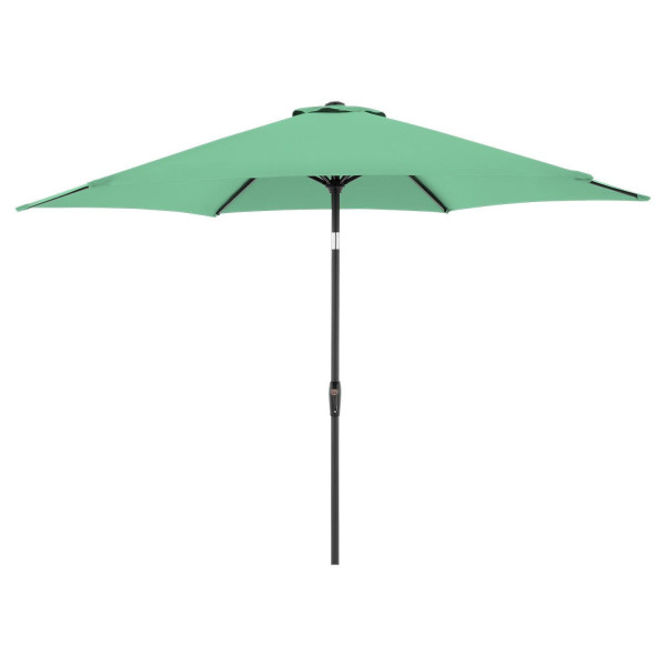 Der Sonnenschirm ZINNIA besteht aus Polyester in der Farbe Mintgrün. Der Mast ist aus schwarzem Aluminium gefertigt und verfügt über eine Knickfunktion zur flexiblen Ausrichtung. Der Sonnenschirm lässt sich mittels Kurbelmechanismus öffnen und schließen. Ständer und Beschwerungsplatten sind nicht im Lieferumfang enthalten. Der Schirm hat einen Durchmesser von 300 cm und eine Höhe von 248 cm.