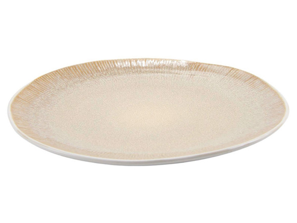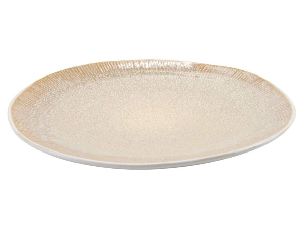 Der Speiseteller TZIA in Beige besticht durch eine elegante linienförmige Reliefprägung und eine glasierte Oberfläche aus Steingut. Mit einem Durchmesser von 27 cm und einer Höhe von 1 cm bietet er ausreichend Platz für Ihre Speisen. Die Unterseite des Tellers ist in Weiß gehalten, was einen schönen Kontrast zur beigen Oberseite bildet. Der Teller ist sowohl spülmaschinen- als auch mikrowellengeeignet, was ihn besonders praktisch im Alltag macht. Ein stilvoller Begleiter für jede Mahlzeit.