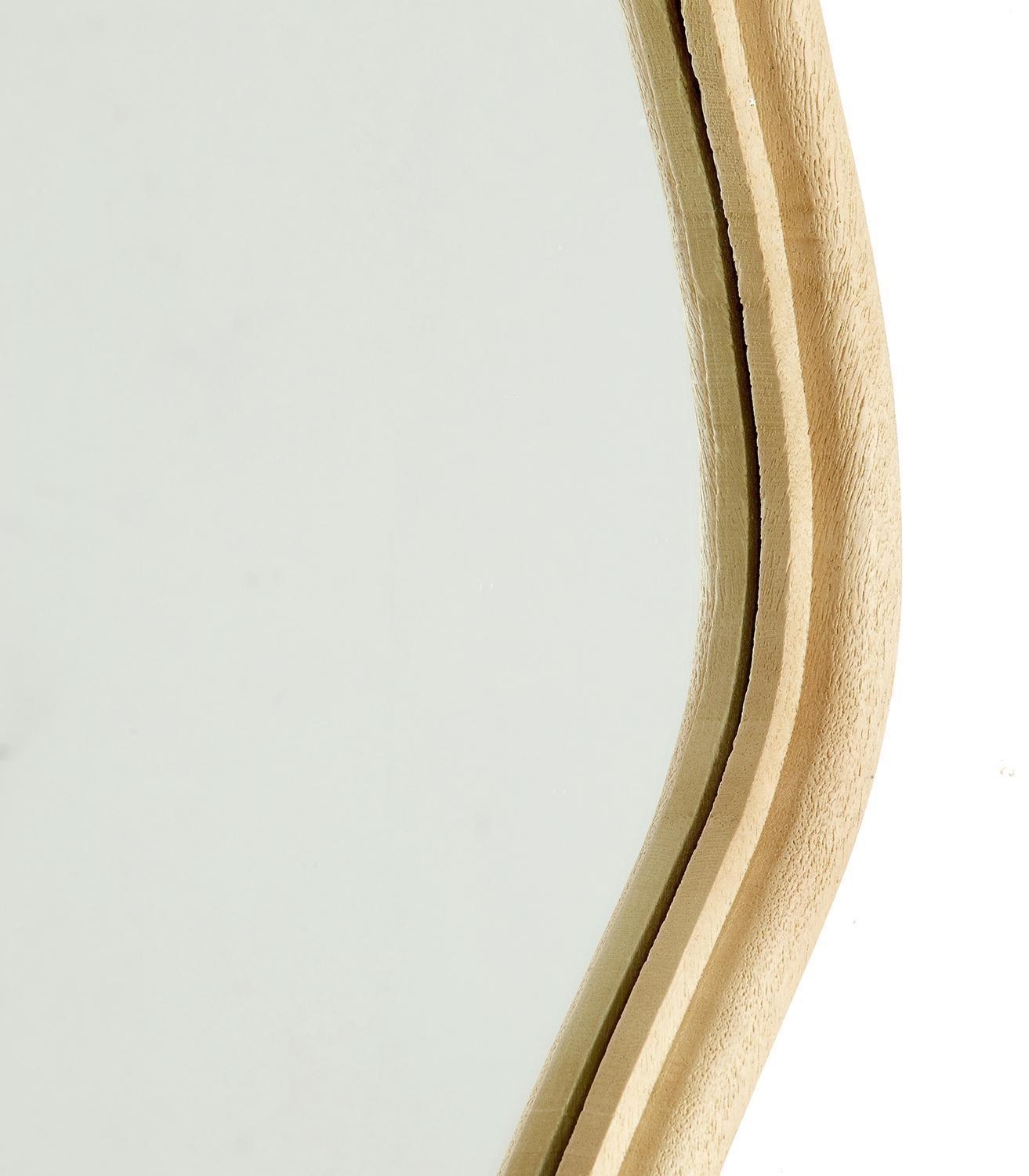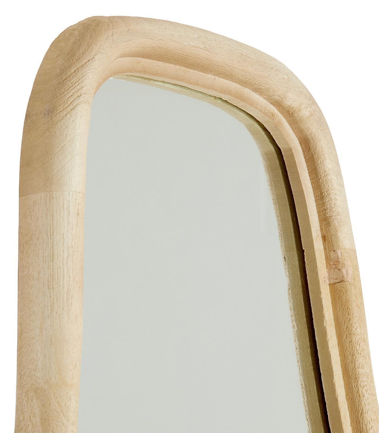 Der Spiegel CELANO der Marke Light & Living ist mit einem braunen Holzrahmen ausgestattet und verfügt über eine Spiegelfläche aus Glas. Er hat eine Höhe von 121 cm, eine Breite von 62 cm sowie eine Tiefe von 5 cm und ist in organischer Form gestaltet. Auf der Rückseite befindet sich eine Aufhängung, wodurch der Spiegel vertikal montiert werden kann.
