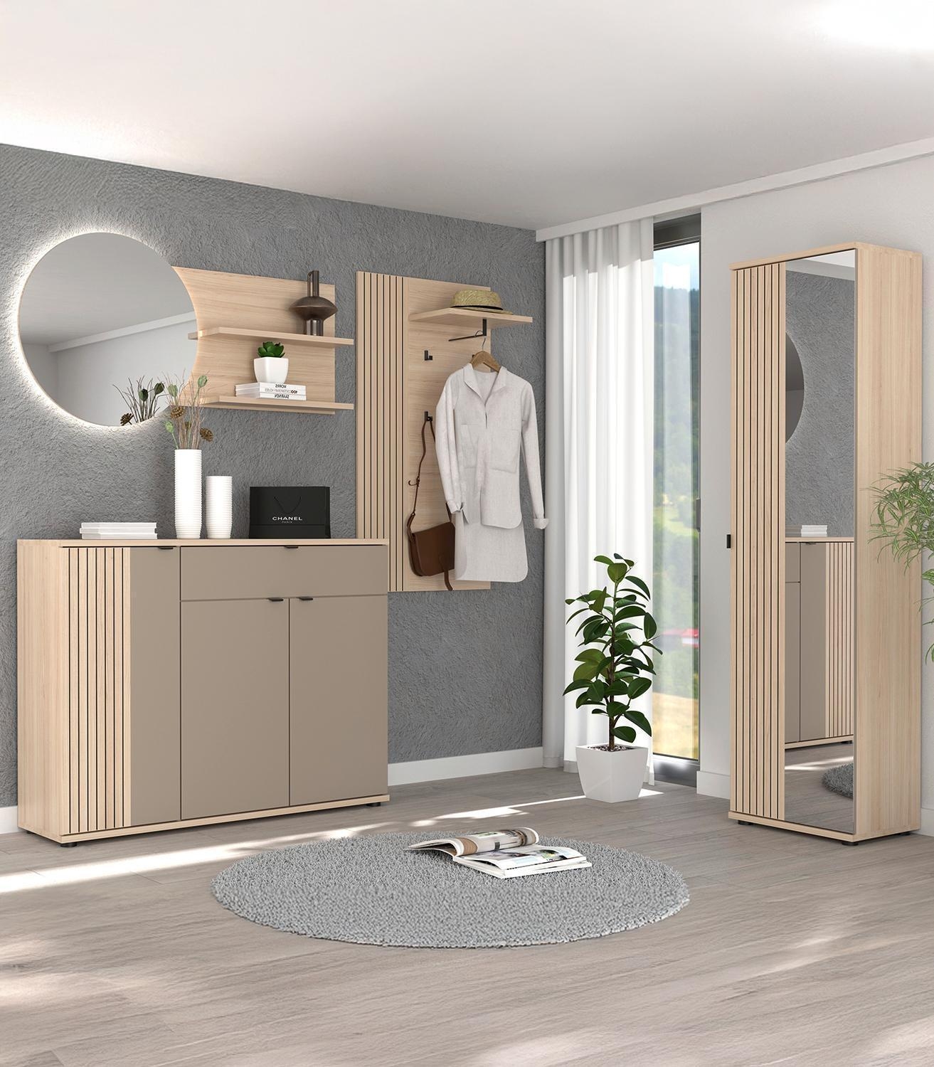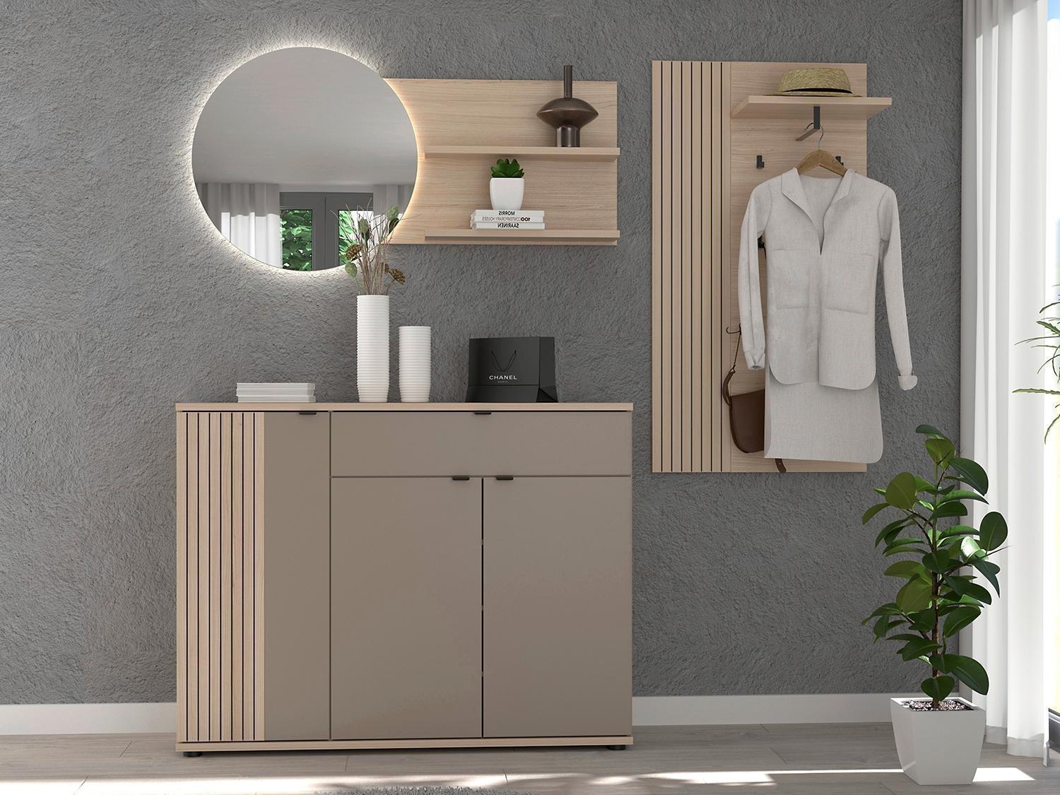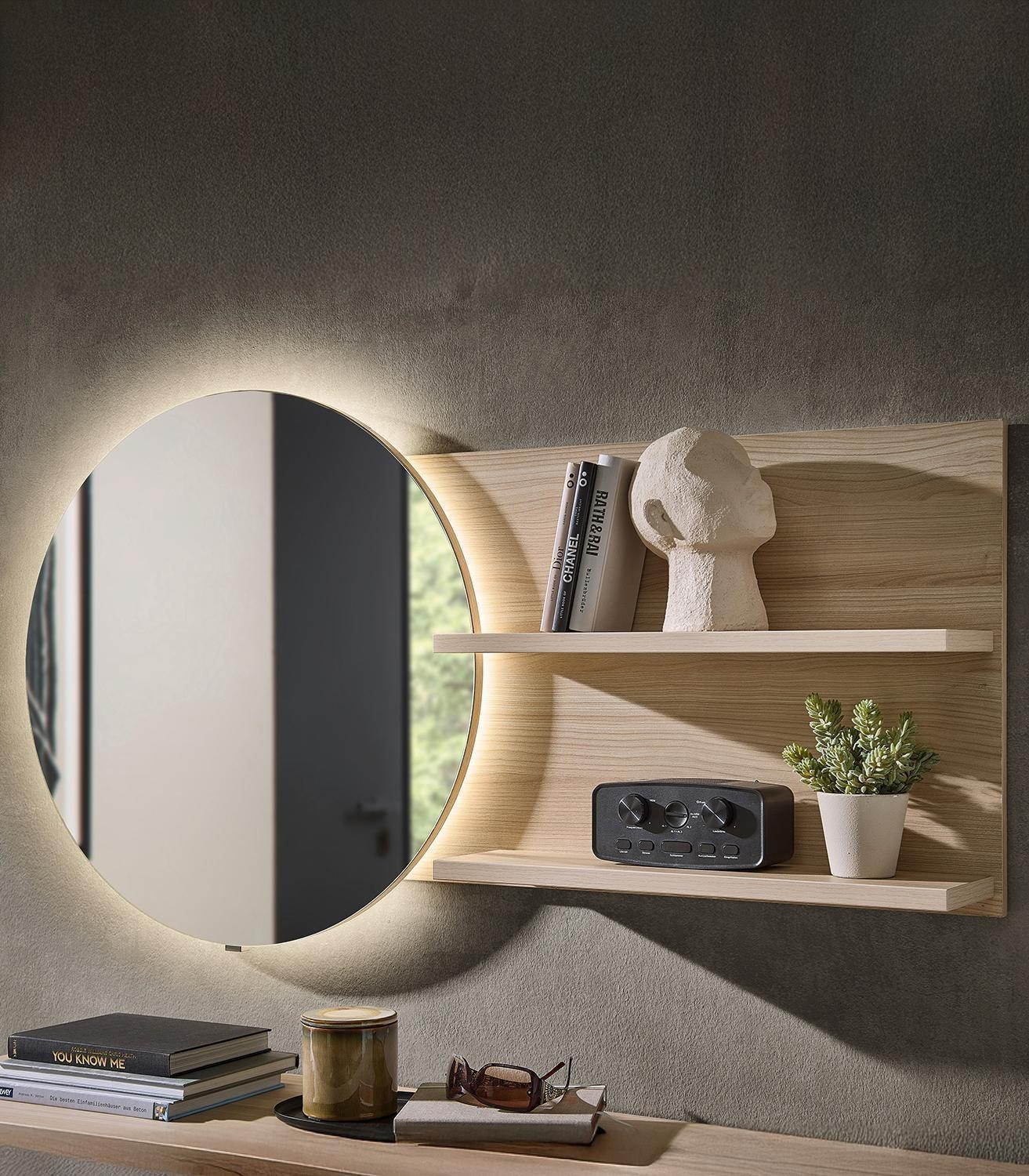 Der Spiegel PISOLO ist mit einem Rahmen in Riva Eiche Dekor gestaltet und verfügt über zwei praktische Ablageflächen. Er eignet sich für den Einsatz im Flur, Schlafzimmer oder Wohnzimmer und ist mit einer integrierten LED-Beleuchtung ausgestattet. Mit einer Breite von 133 cm, einer Höhe von 70 cm und einer Tiefe von 17 cm benötigt der Spiegel mehr Platz an der Wand.