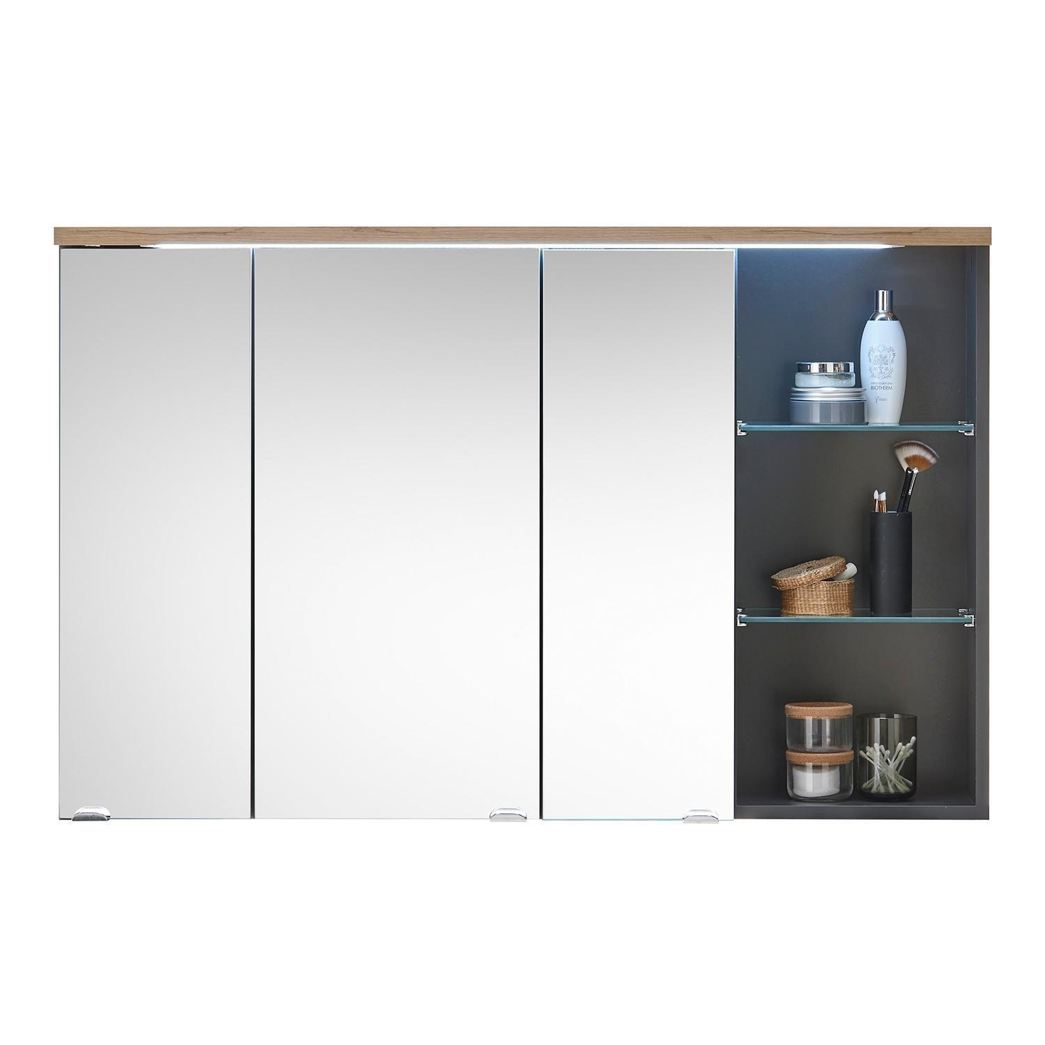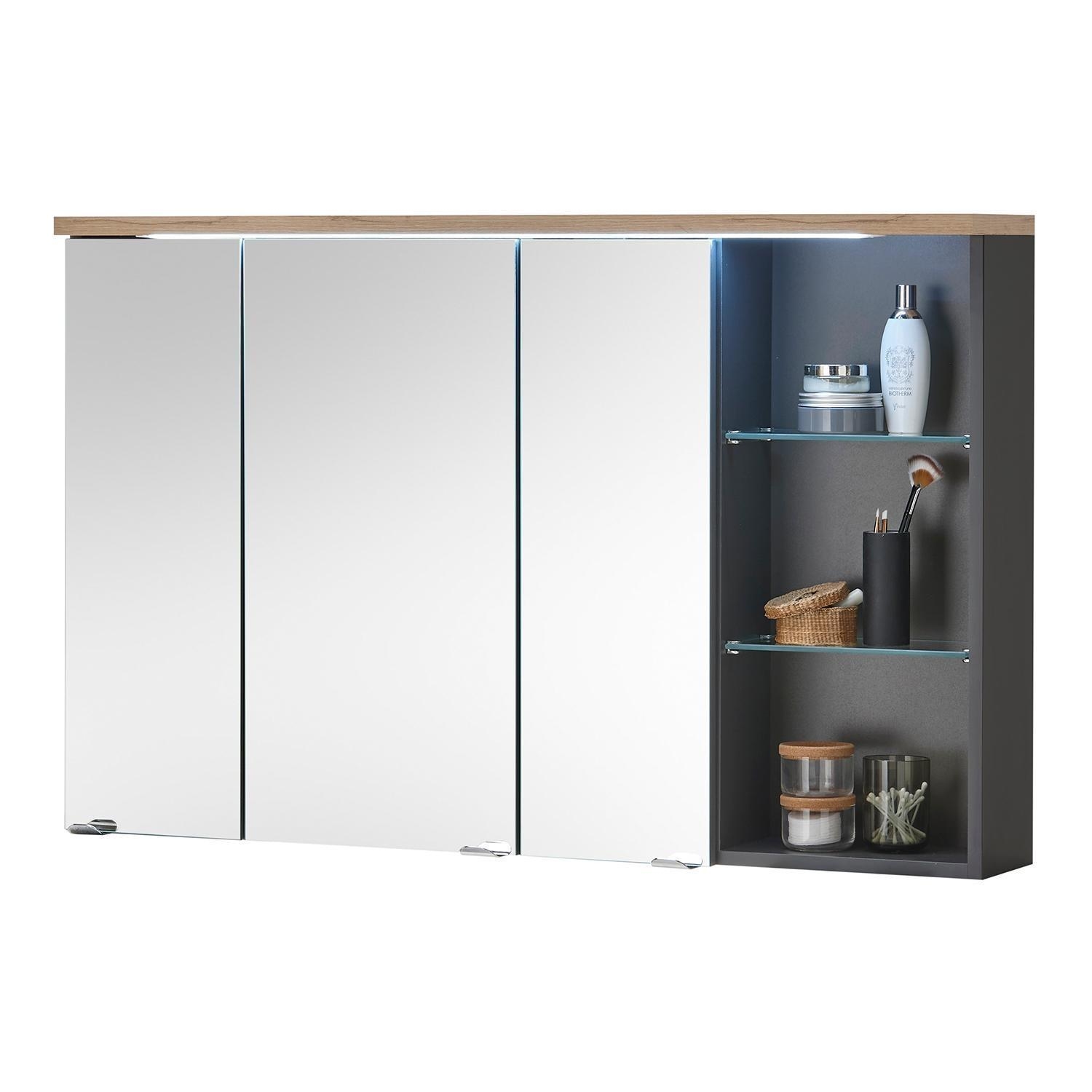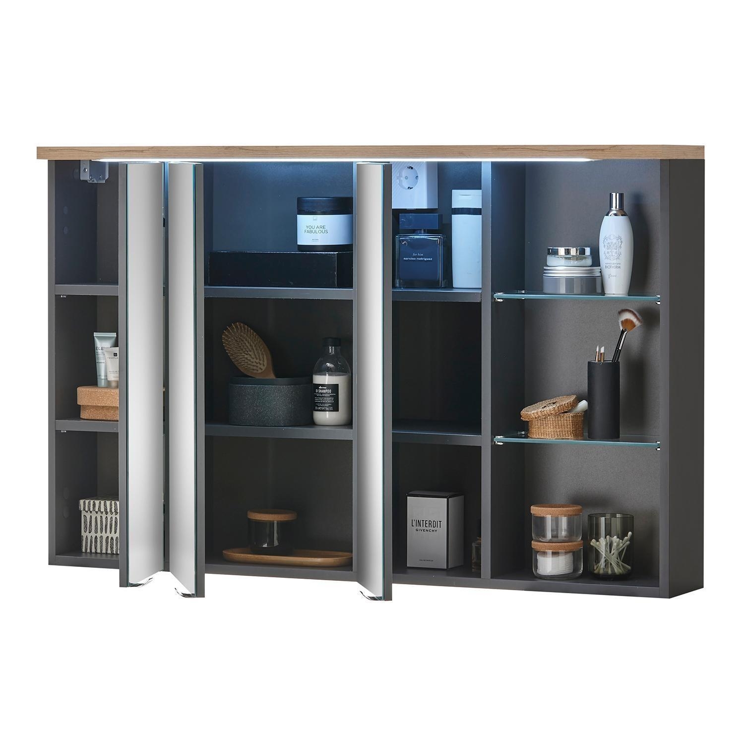 Der Spiegelschrank MARTINO ist in Grau matt gehalten und mit einem Oberboden in Artisan Eiche Dekor ausgestattet. Er verfügt über drei Spiegeltüren, hinter denen sich zwei Glasböden und sechs weitere Einlegeböden zur Aufbewahrung befinden. Eine integrierte LED-Beleuchtung sorgt für eine gleichmäßige Ausleuchtung des Spiegels. Zusätzlich ist der Spiegelschrank mit einem Schalter-Steckdosen-Element versehen. Die Maße betragen 110 cm in der Breite, 70 cm in der Höhe und 22 cm in der Tiefe.