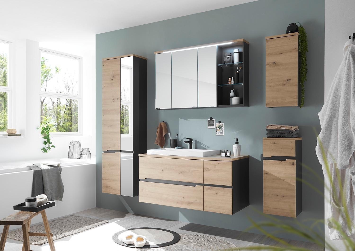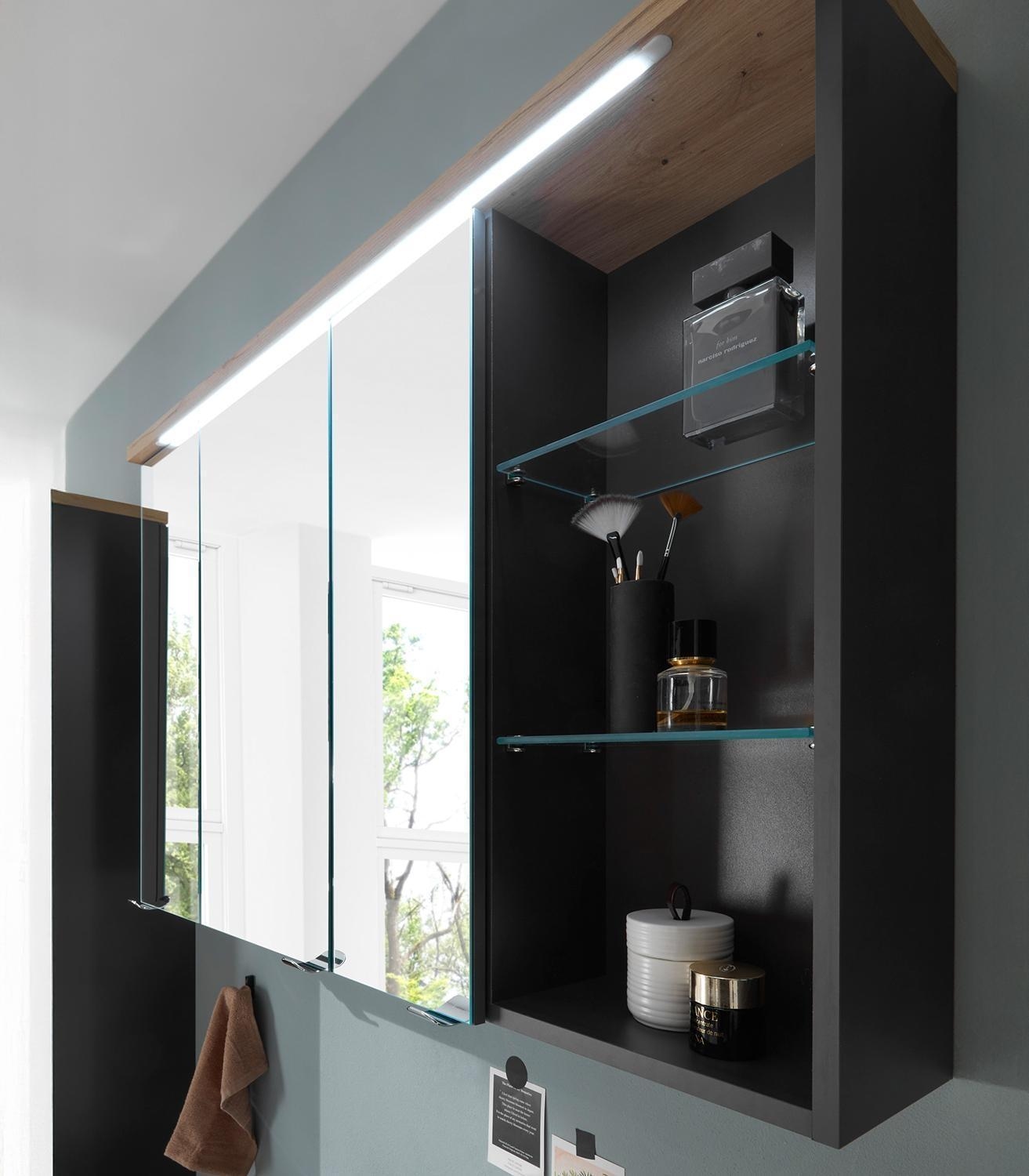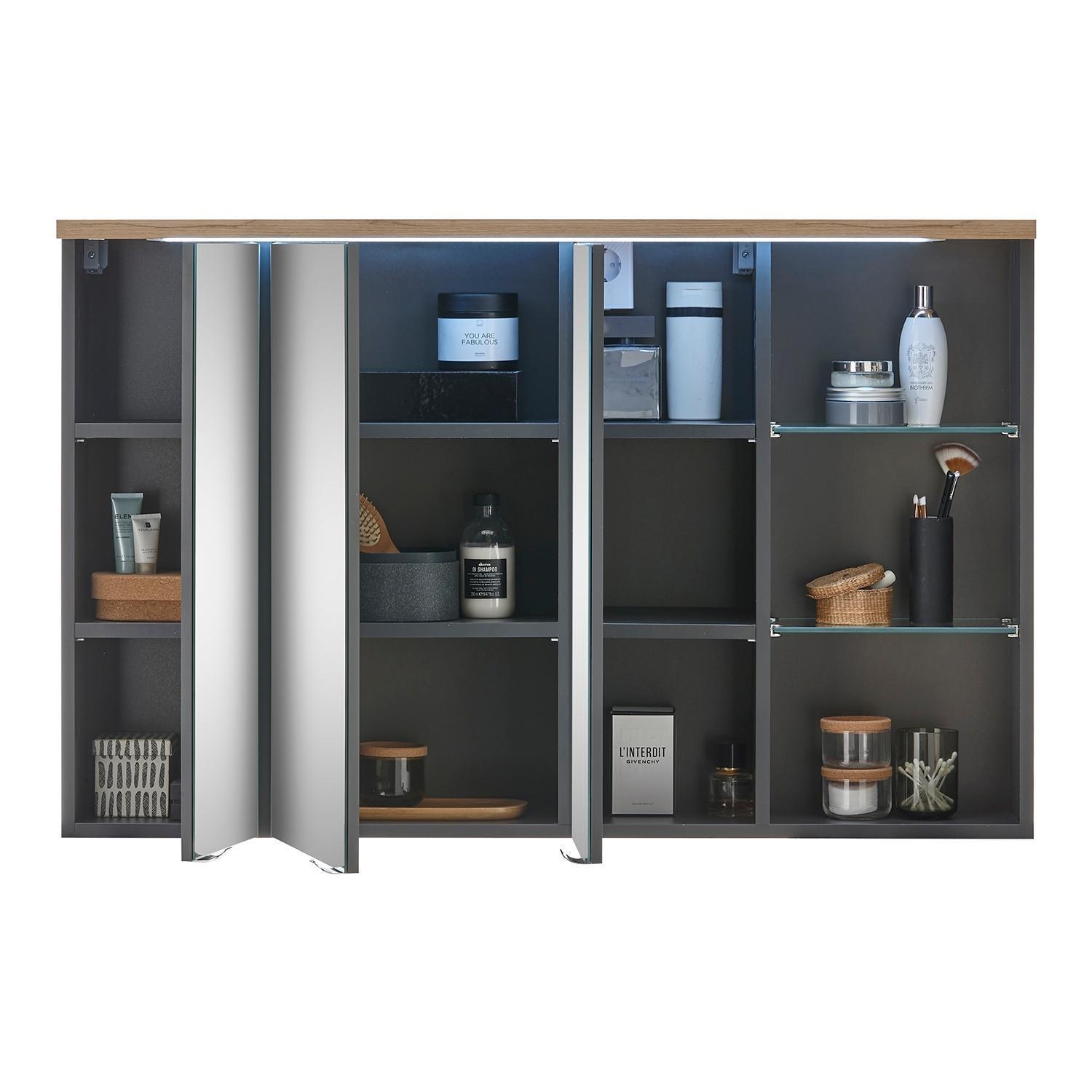 Der Spiegelschrank MARTINO ist in Grau matt gehalten und mit einem Oberboden in Artisan Eiche Dekor ausgestattet. Er verfügt über drei Spiegeltüren, hinter denen sich zwei Glasböden und sechs weitere Einlegeböden zur Aufbewahrung befinden. Eine integrierte LED-Beleuchtung sorgt für eine gleichmäßige Ausleuchtung des Spiegels. Zusätzlich ist der Spiegelschrank mit einem Schalter-Steckdosen-Element versehen. Die Maße betragen 110 cm in der Breite, 70 cm in der Höhe und 22 cm in der Tiefe.