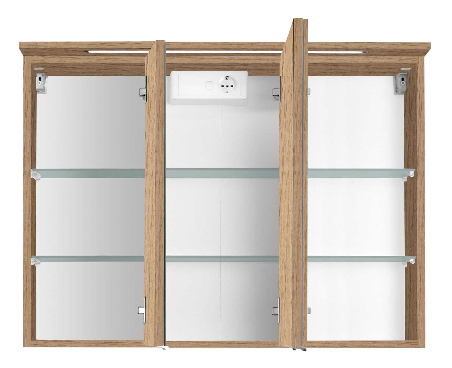 | Lieferumfang: | 1 Spiegelschrank mit 3 Spiegeltüren und 6 Glaseinlegeböden. Inkl. LED-Beleuchtung und Schalter-Steckdosen-Element |