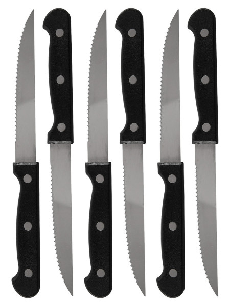 Das Steakmesser-Set MR. STEAK umfasst sechs Messer mit scharfen Edelstahlklingen und robusten, vernieteten Griffschalen aus Kunststoff. Die Messer haben eine Gesamtlänge von 21,5 cm, wobei die Klingenlänge 11 cm beträgt. Sie sind ideal für das Schneiden von Steak und anderen Fleischsorten. Das Set ist ausschließlich für die Handwäsche geeignet, um die Langlebigkeit der Messer zu gewährleisten.