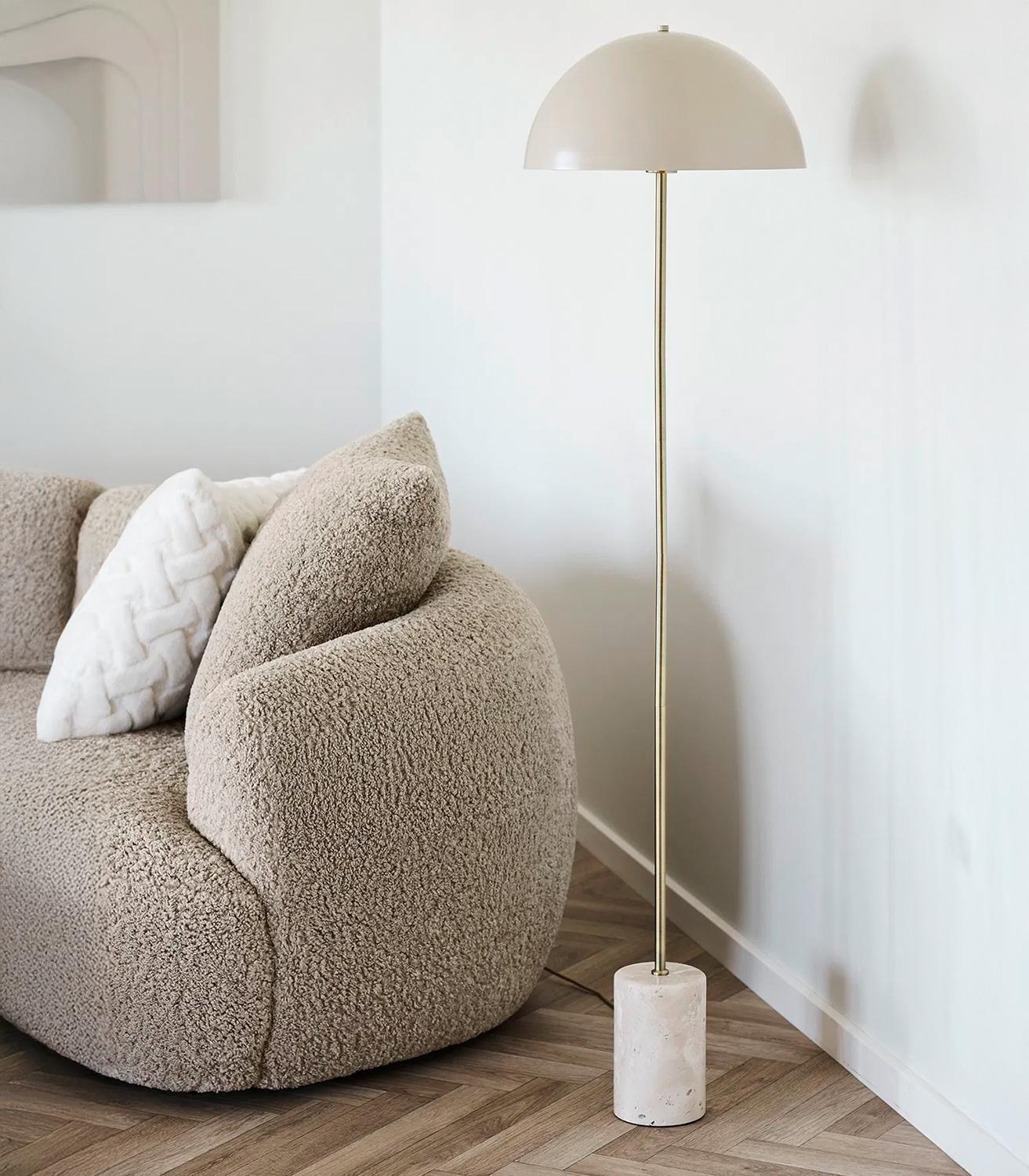Die Stehlampe SHEFFIELD wird aus Metall in den Farben Beige und Goldgelb gefertigt. Diese Standleuchte besitzt eine Höhe von 155 cm sowie einen Durchmesser von 40 cm und ist mit einem Lampenfuß aus massivem Marmor ausgestattet. Als Lichtquelle dient ein austauschbares Leuchtmittel mit einer E27-Fassung, welches eine Leistung von bis zu 40 Watt erbringen darf. Im Lieferumfang ist ein Leuchtmittel für diese Bodenleuchte nicht enthalten.