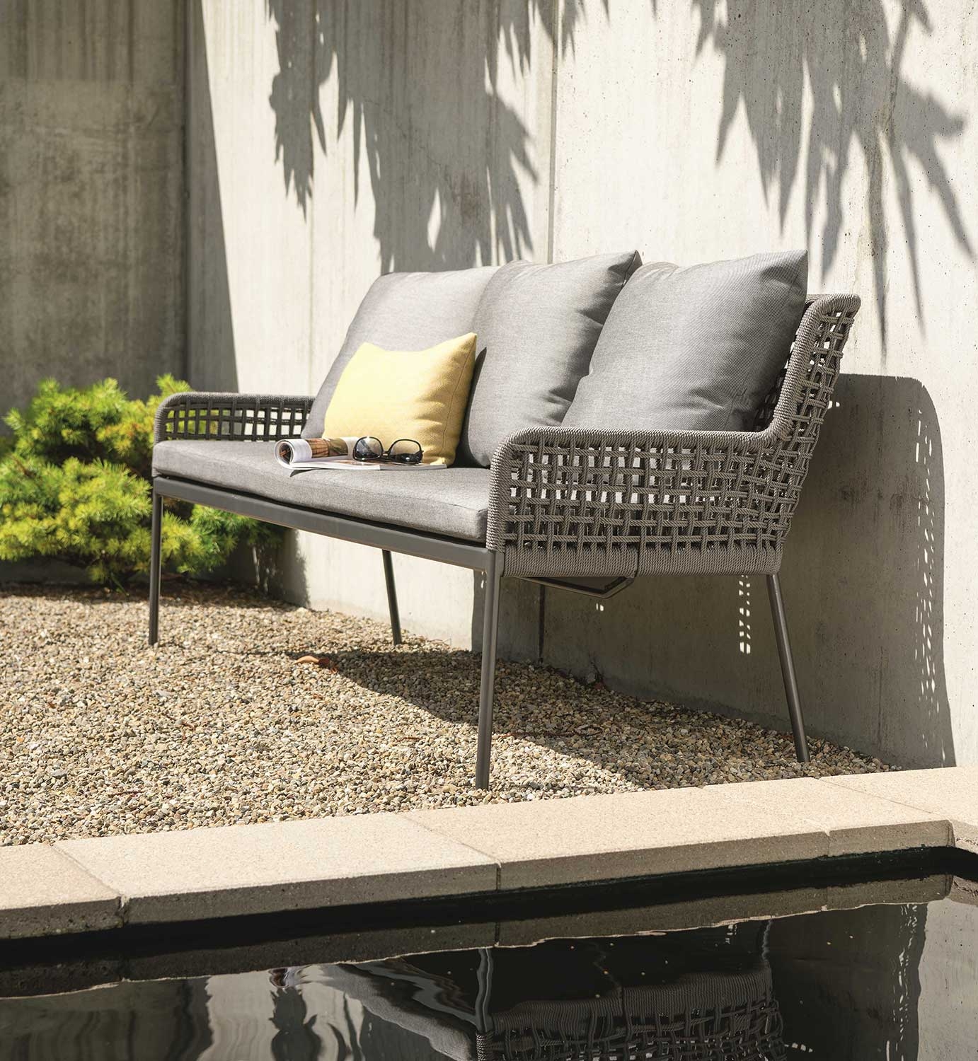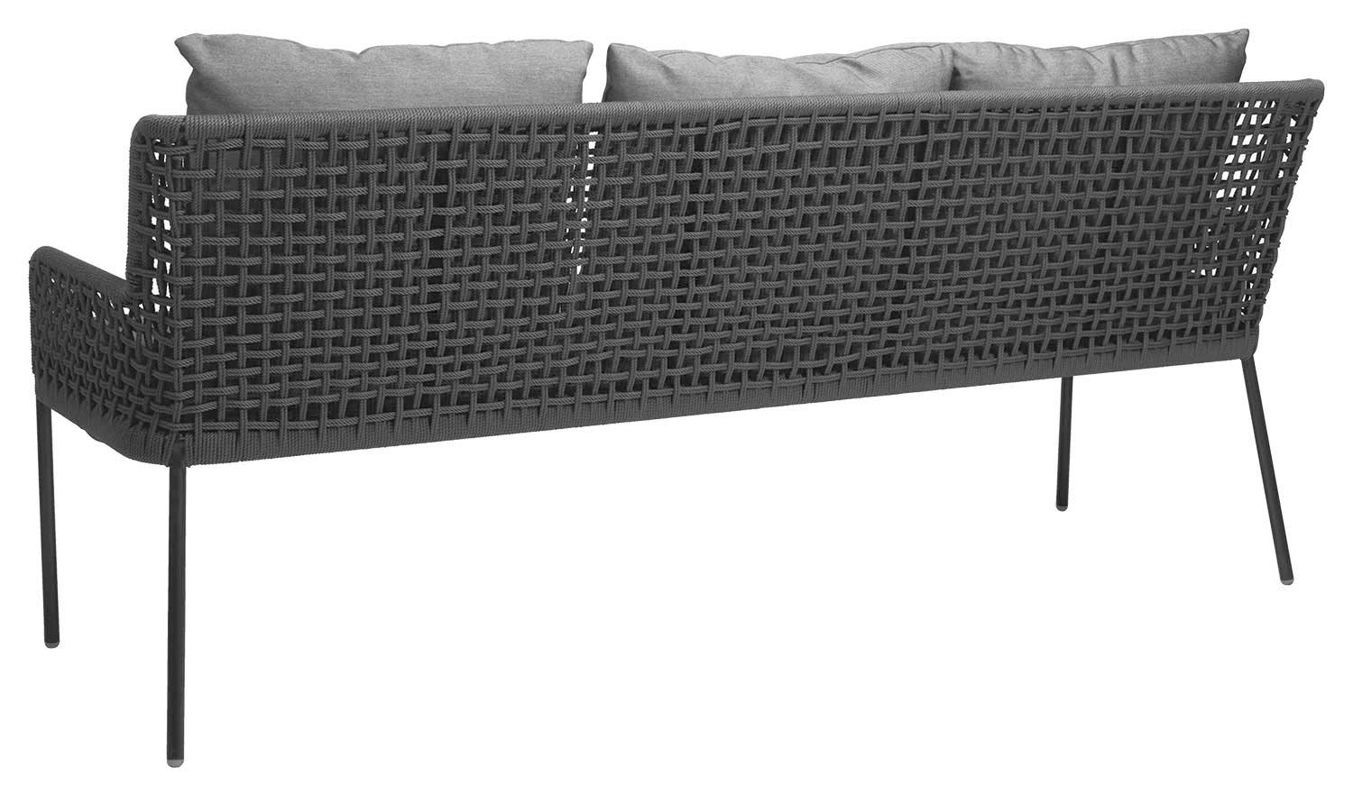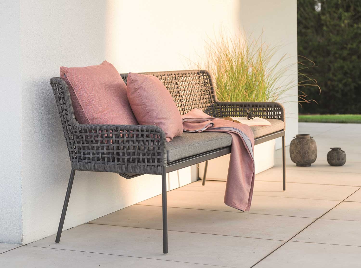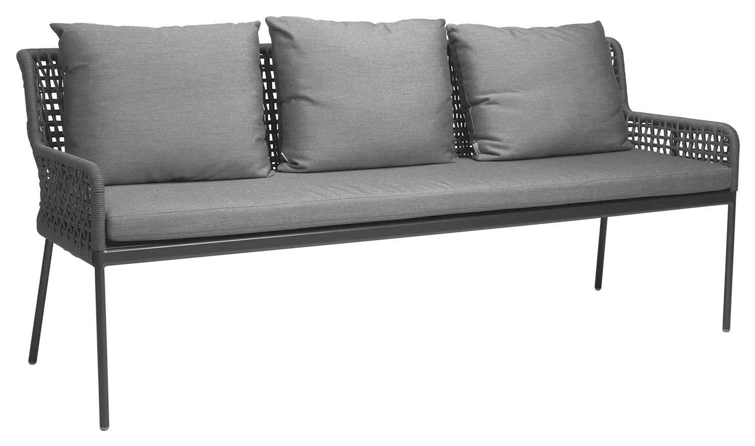 Die bequeme 3-Sitzer Gartenbank überzeugt mit einer besonderen Kordel-Optik. Durch ihr leichtes Gestell aus pulverbeschichtetem Aluminium in der Farbe anthrazit besitzt die Gartenbank ein geringes Gewicht und lässt sich somit problemlos verstellen. Die Bespannung der Bank besteht aus hochwertigen Polypropylen-Kordeln in der Farbe Platin. Diese Synthetikfaser ist scheuerfest und optimal für den Außenbereich geeignet. Im Lieferumfang sind zudem 1 Sitzauflage und 3 Rückenkissen aus Polyacryl in seidengrau enthalten, die jeweils mit Reißverschlüssen versehen sind. Polyacryl ist lichtecht, chemikalienbeständig, schnelltrocknend und ist dank der niedrigen Dichtigkeit sehr leicht.