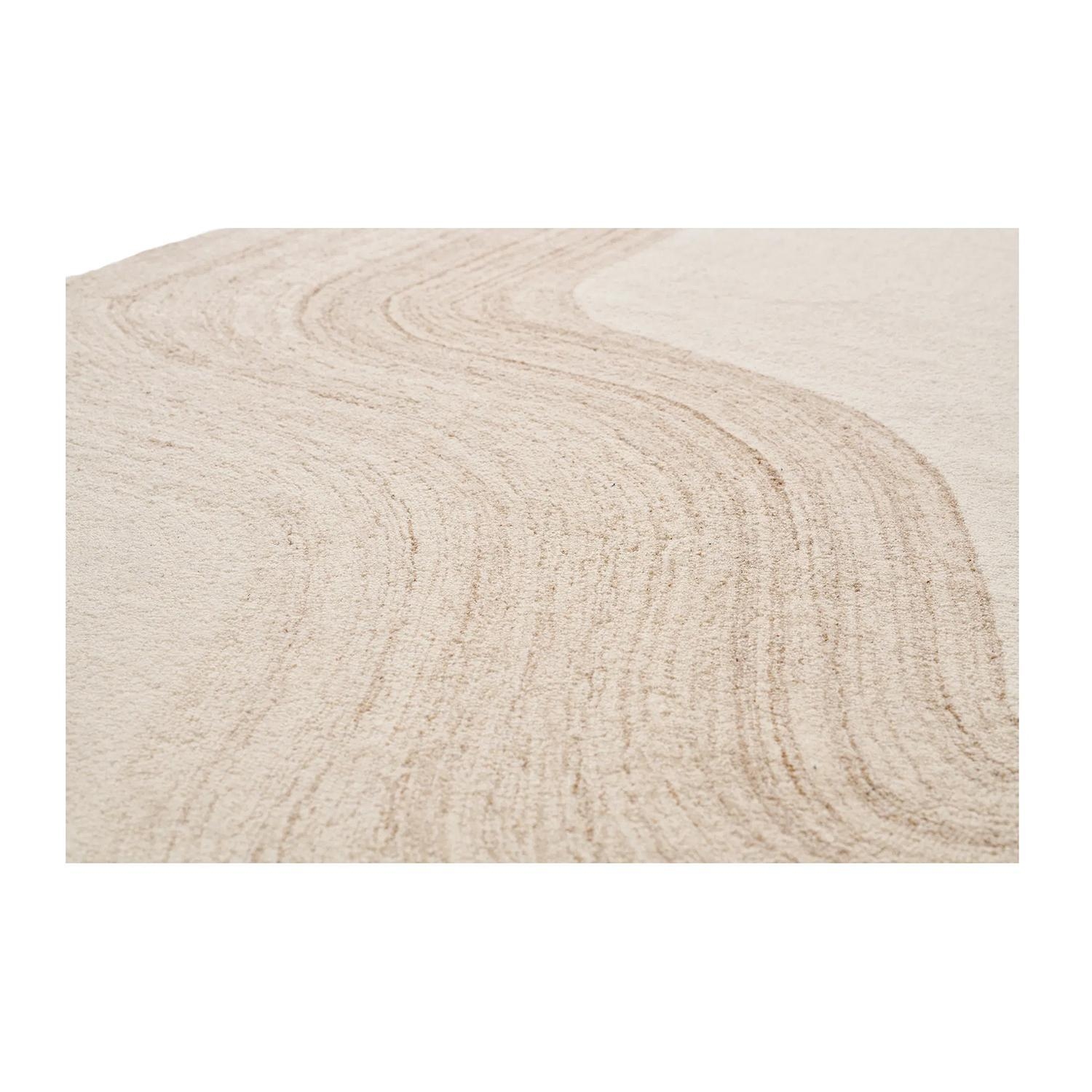 Der Maschinenwebteppich SURAT ist in Beige gehalten und besteht aus Wolle. Die Oberfläche ist mit einem Wellenmuster in Hellbraun versehen, das eine reliefartige Struktur bildet. Gefertigt wurde der Teppich im handgetufteten Verfahren. Mit einer Breite von 160 cm und einer Länge von 230 cm eignet er sich für größere Wohn- oder Aufenthaltsbereiche.