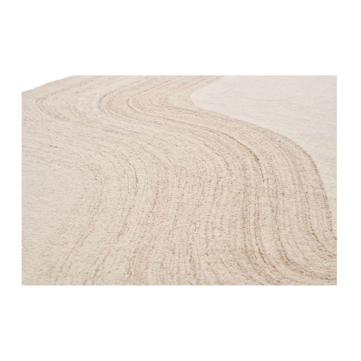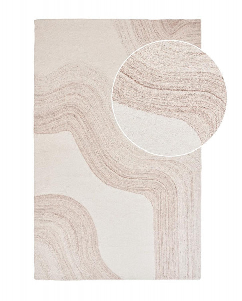 Der Maschinenwebteppich SURAT ist in Beige gehalten und besteht aus Wolle. Die Oberfläche ist mit einem Wellenmuster in Hellbraun versehen, das eine reliefartige Struktur bildet. Gefertigt wurde der Teppich im handgetufteten Verfahren. Mit einer Breite von 200 cm und einer Länge von 300 cm eignet er sich für größere Wohn- oder Aufenthaltsbereiche.