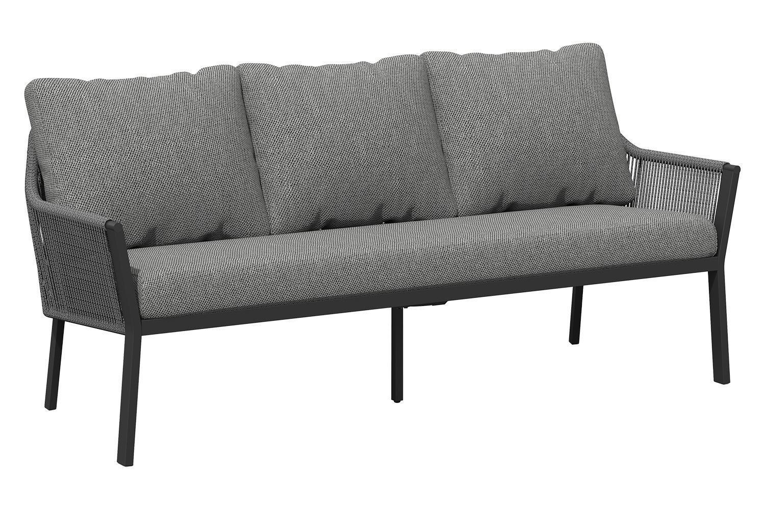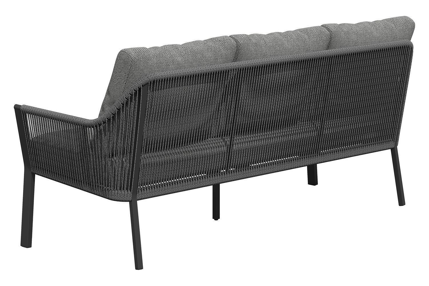 Die Gartenbank LIV verfügt über ein Gestell aus Aluminium in Dunkelgrau. Die Sitz- und Rückenkissen sind mit Olefinbezügen in Grau ausgestattet. Die Rücken- und Seitenbespannung besteht aus Seilen. Die Bank verfügt über Sitzplätze für max. 3 Personen. Die Breite beträgt 200 cm, die Höhe 83 cm und die Tiefe 79 cm.