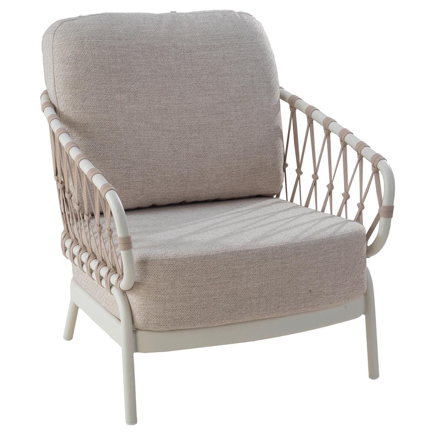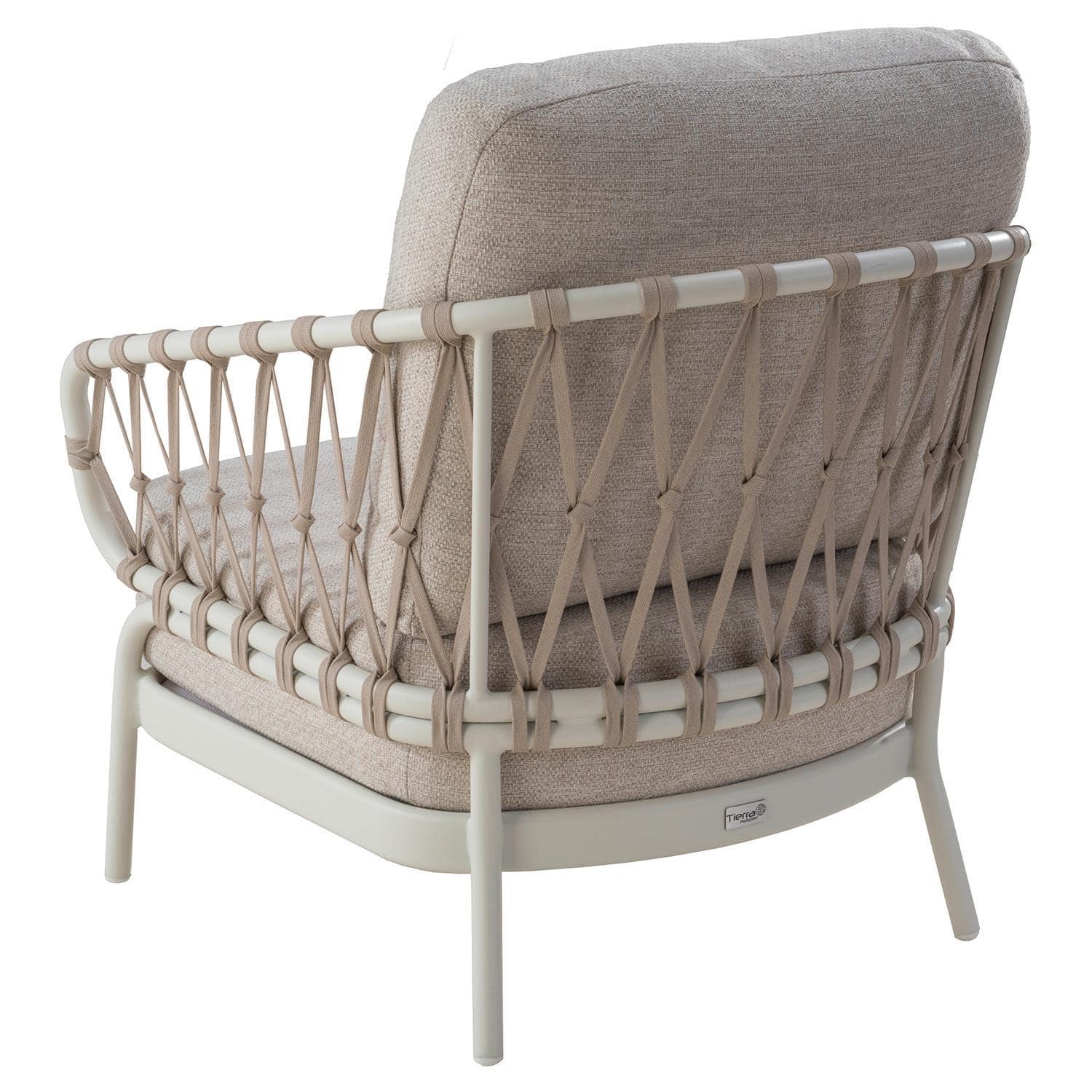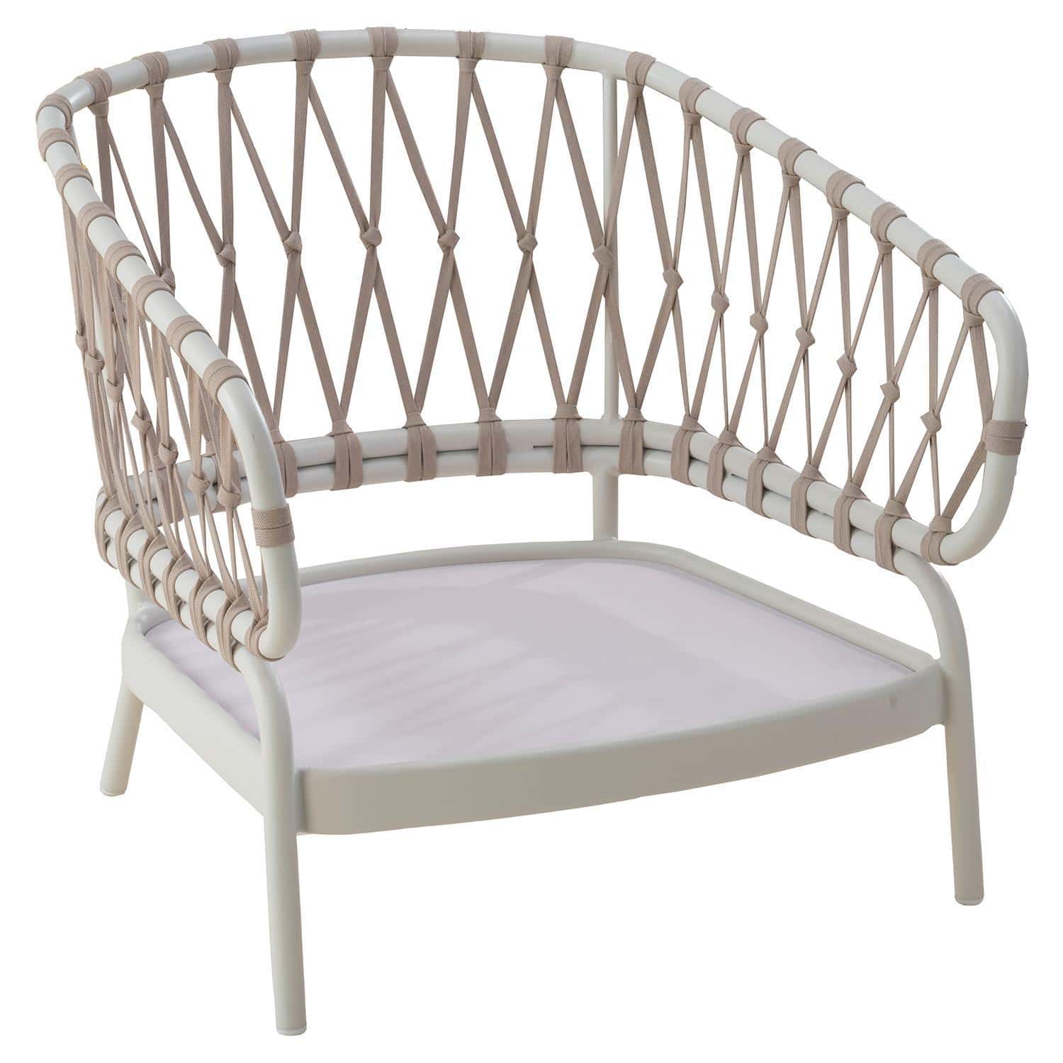Der Gartensessel NATAL LOUNGE der Marke Tierra Outdoor verfügt über ein Aluminiumgestell in Cremeweiß. Die Sitz- und Rückenlehne sind mit einer Seilbespannung in Hellbraun versehen. Sitz- und Rückenkissen haben Bezüge aus Olefin in Beige. Der Sessel ist für den Außenbereich geeignet. Die Abmessungen betragen 70 cm in der Breite, 83 cm in der Höhe und 70 cm in der Tiefe