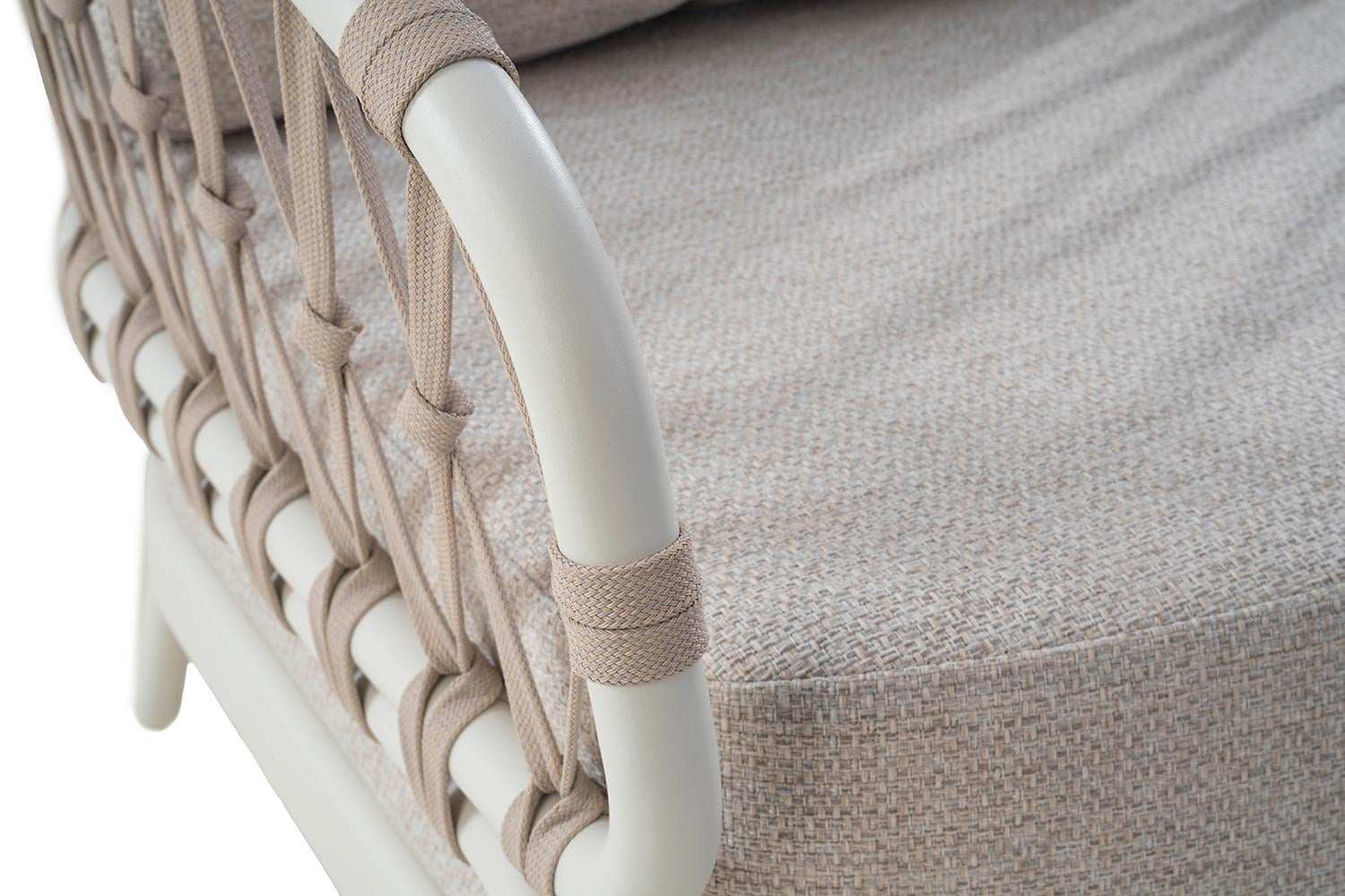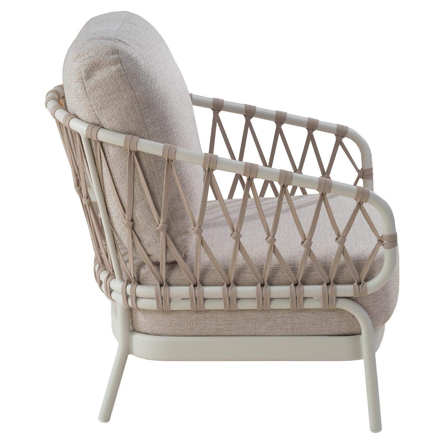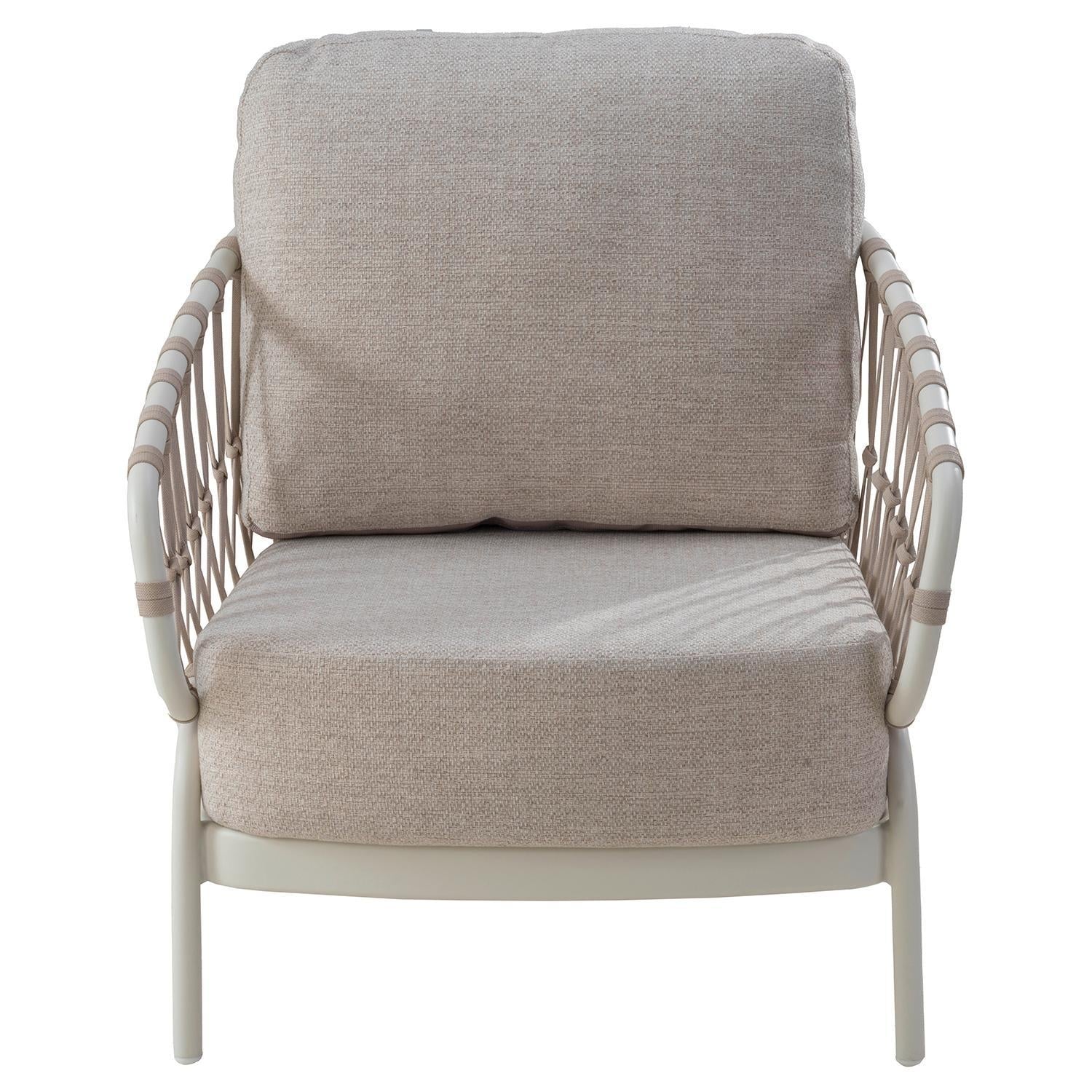 Der Gartensessel NATAL LOUNGE der Marke Tierra Outdoor verfügt über ein Aluminiumgestell in Cremeweiß. Die Sitz- und Rückenlehne sind mit einer Seilbespannung in Hellbraun versehen. Sitz- und Rückenkissen haben Bezüge aus Olefin in Beige. Der Sessel ist für den Außenbereich geeignet. Die Abmessungen betragen 70 cm in der Breite, 83 cm in der Höhe und 70 cm in der Tiefe