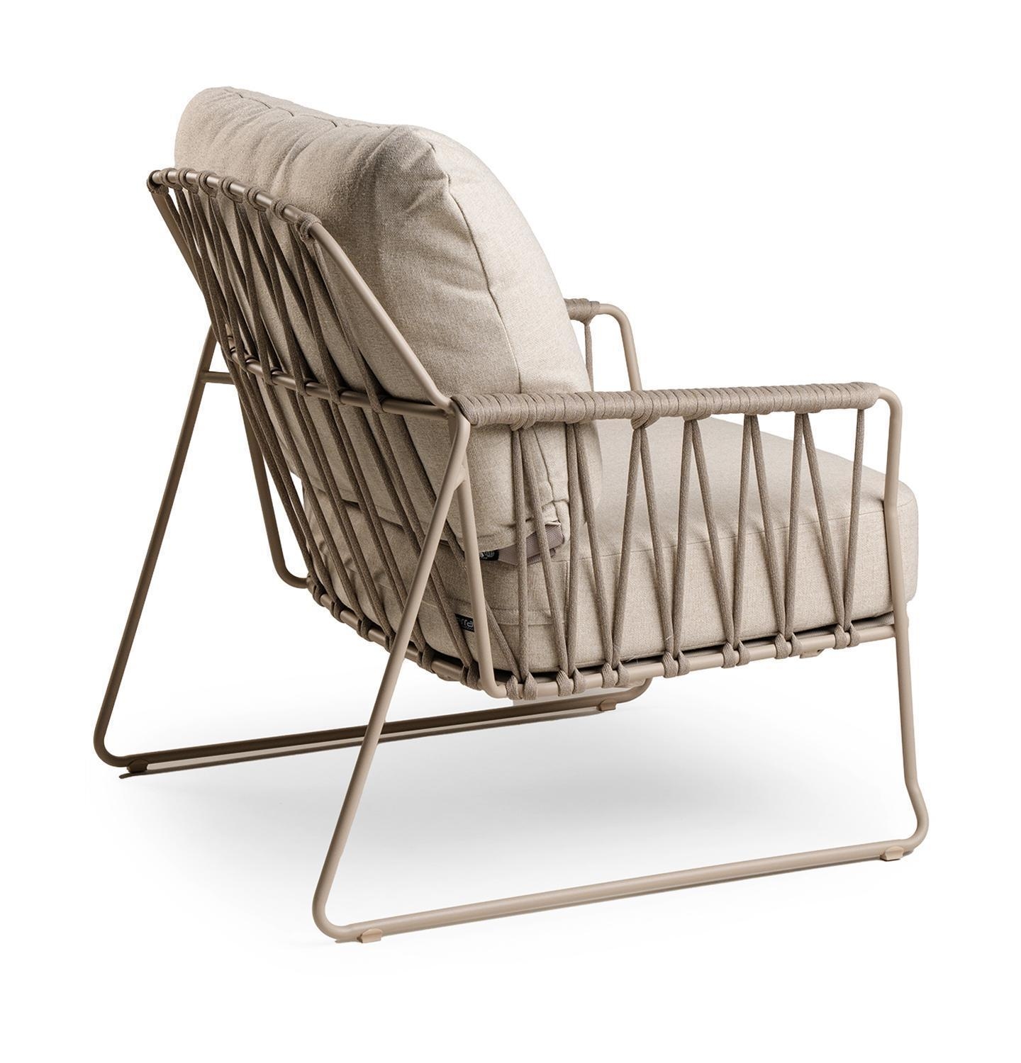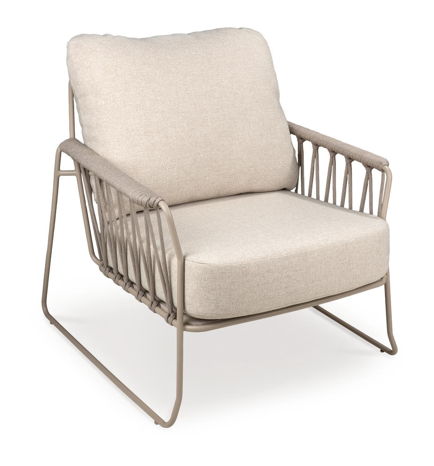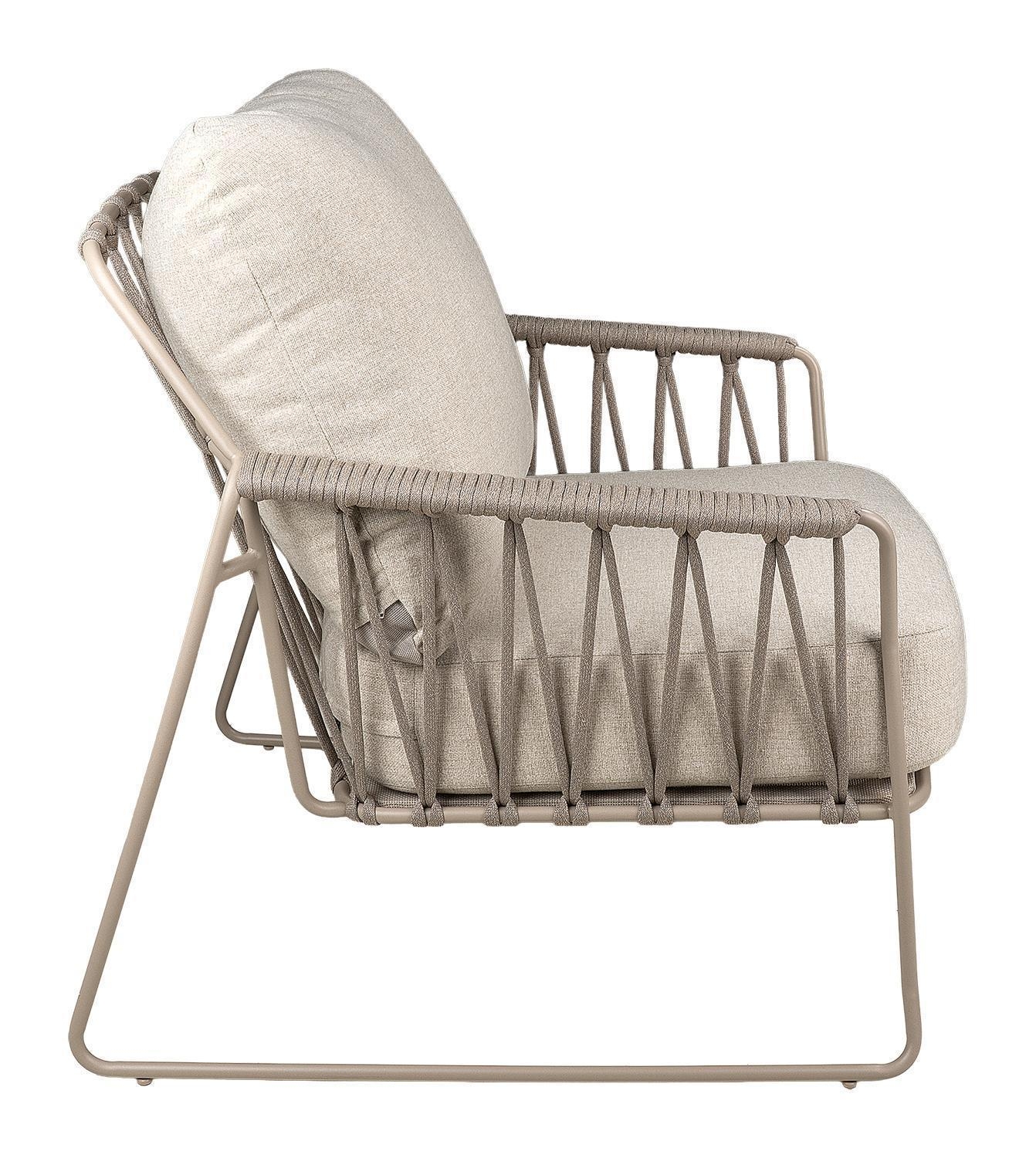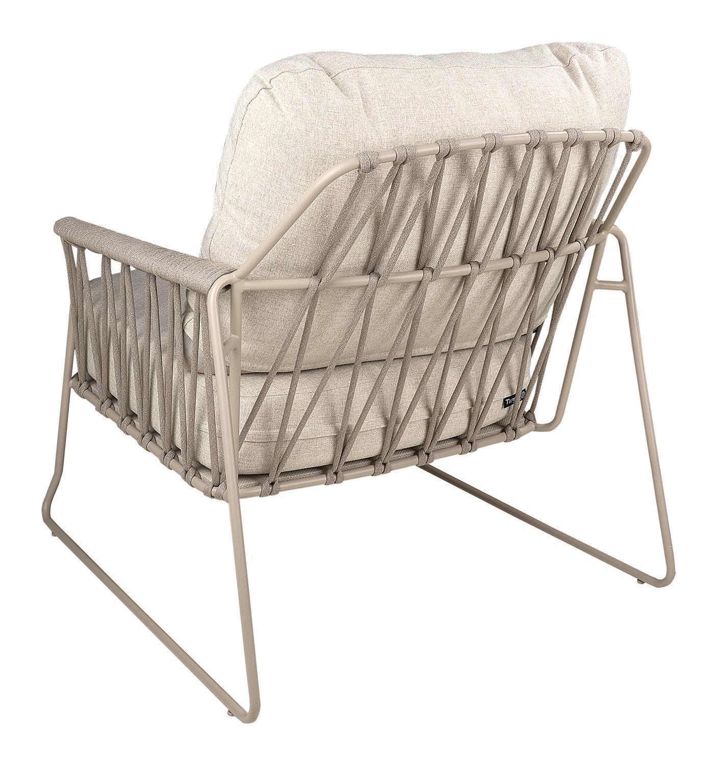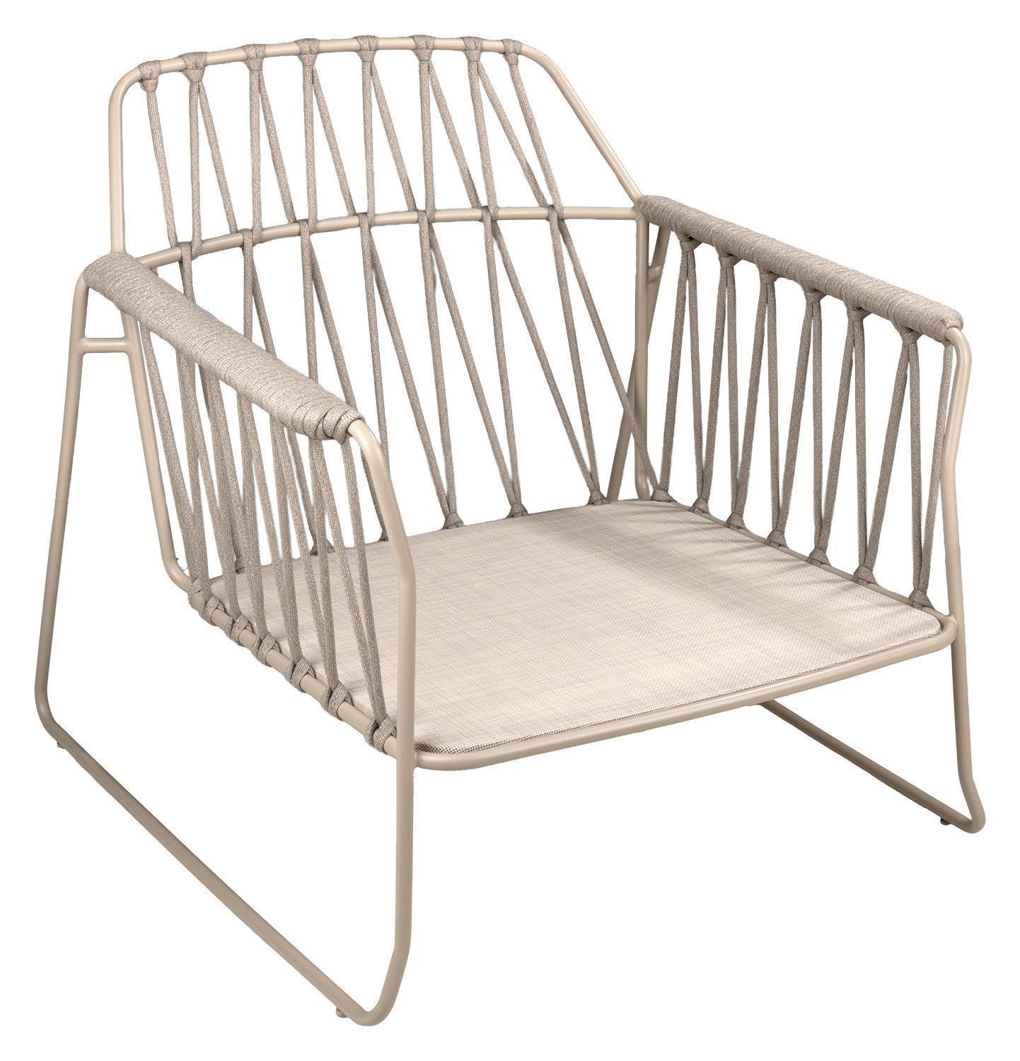 Der Gartensessel RIVIERA der Marke Tierra Outdoor verfügt über ein Aluminiumgestell in Champagnerfarben. Die Sitz- und Rückenlehne sind mit einer Seilbespannung in Beige versehen. Sitz- und Rückenkissen haben Bezüge aus Olefin und sind beide in der Farbe Beige gehalten. Der Sessel ist für den Außenbereich geeignet und verfügt über Abmessungen von 70 cm in der Breite, 83 cm in der Höhe und 70 cm in der Tiefe