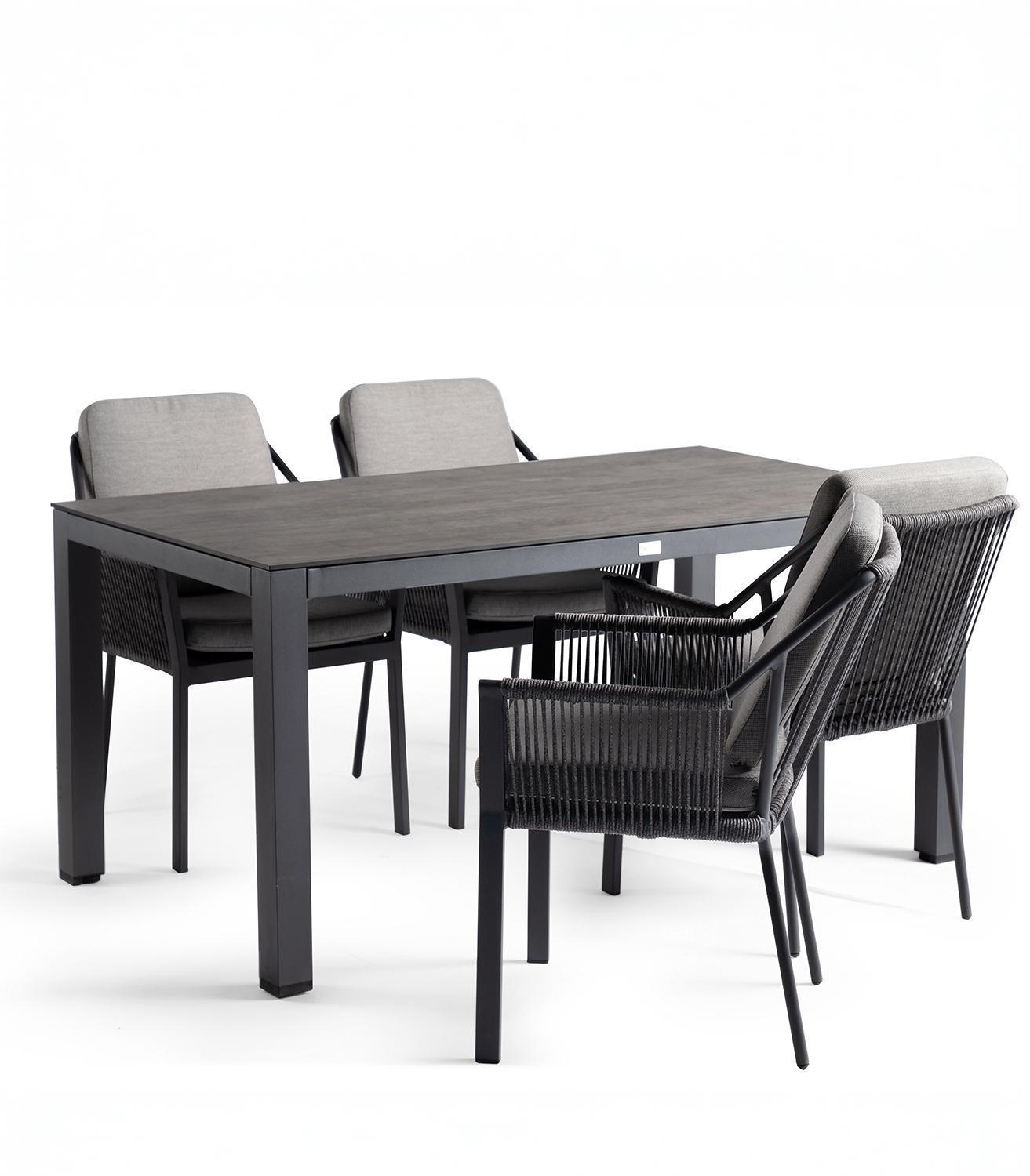 Der Gartenstuhl LIV verfügt über ein Gestell aus Aluminium in Dunkelgrau. Die Sitz- und Rückenkissen sind mit Olefinbezügen in Grau ausgestattet. Die Rücken- und Seitenbespannung besteht aus Seilen. Der Stuhl ist platzsparend stapelbar. Die Breite beträgt 65 cm, die Höhe 89 cm und die Tiefe 58 cm.