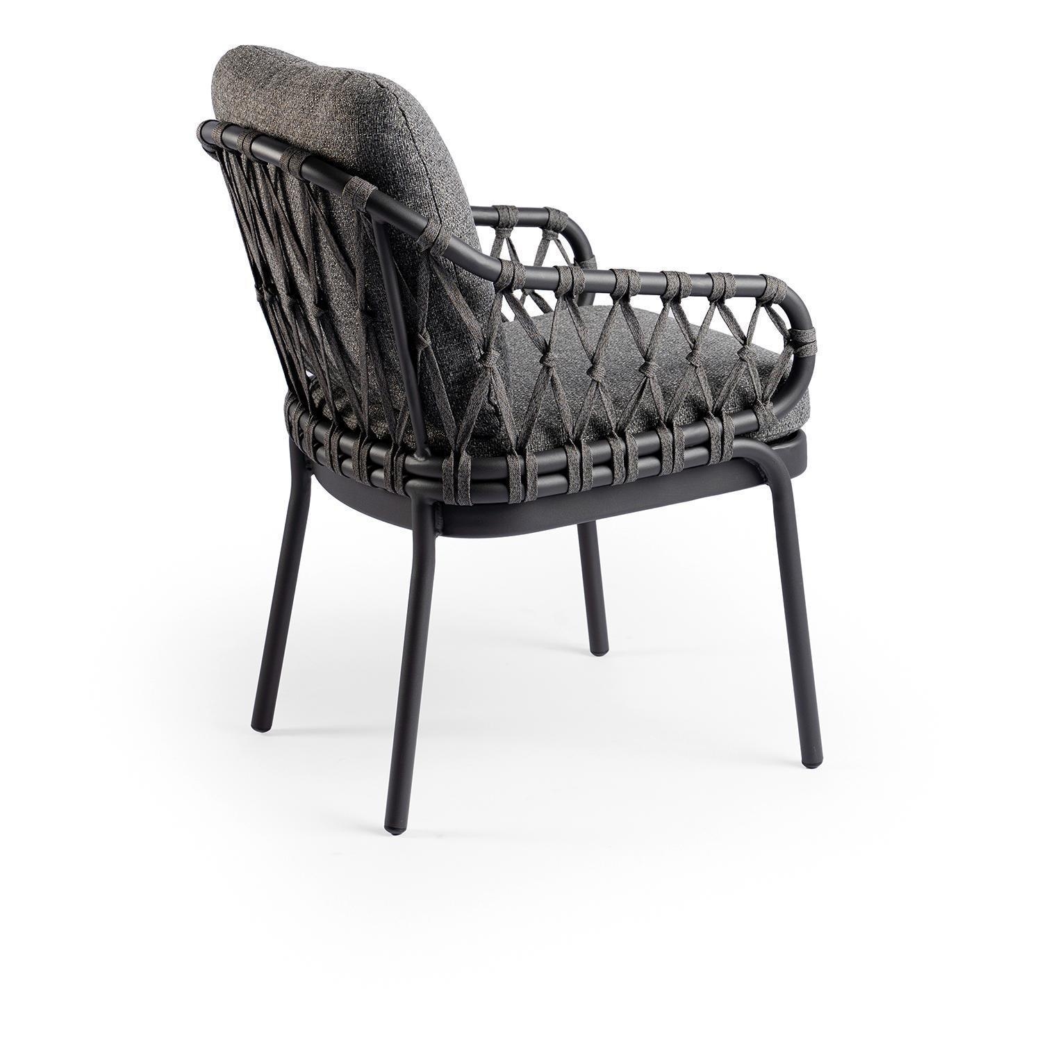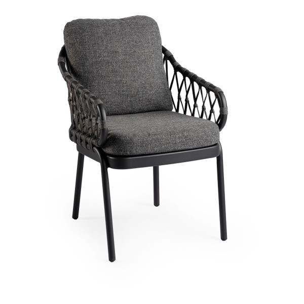 Der Gartenstuhl NATAL DINING der Marke Tierra Outdoor verfügt über ein Aluminiumgestell in Schwarz. Die Sitz- und Rückenlehne ist mit einer Seilbespannung in Grau versehen. Sitz- und Rückenkissen haben Bezüge aus Olefin ebenfalls in Grau. Der Sessel ist für den Außenbereich geeignet. Die Abmessungen betragen 61 cm in der Breite, 84 cm in der Höhe und 70 cm in der Tiefe