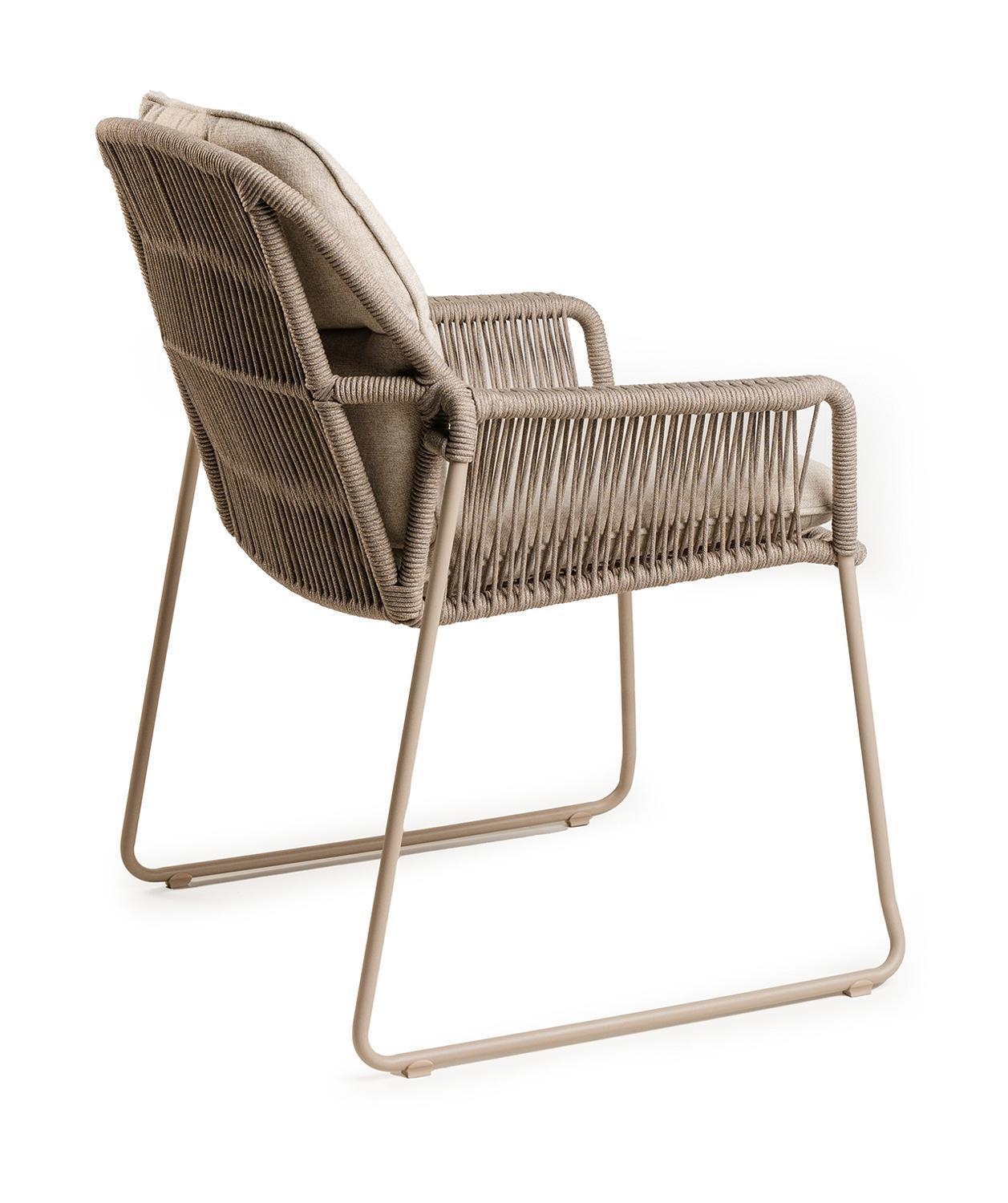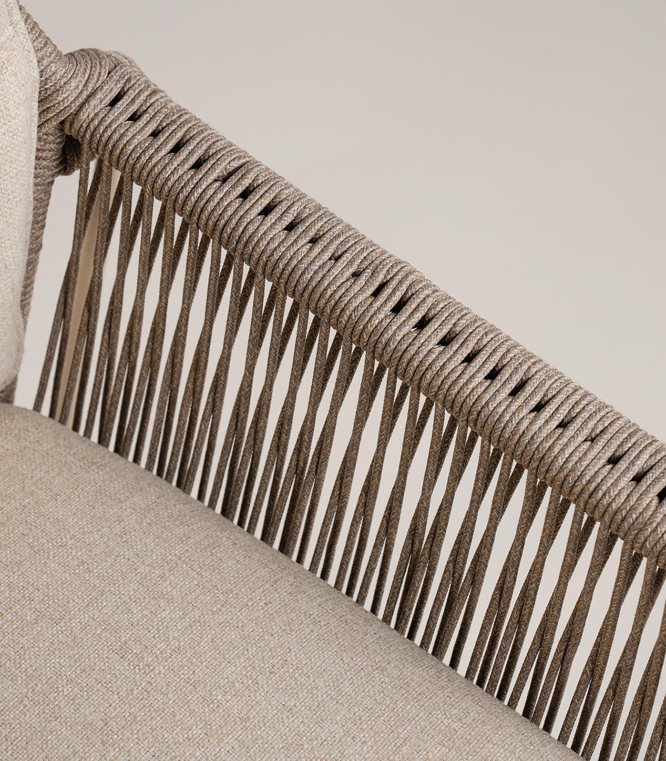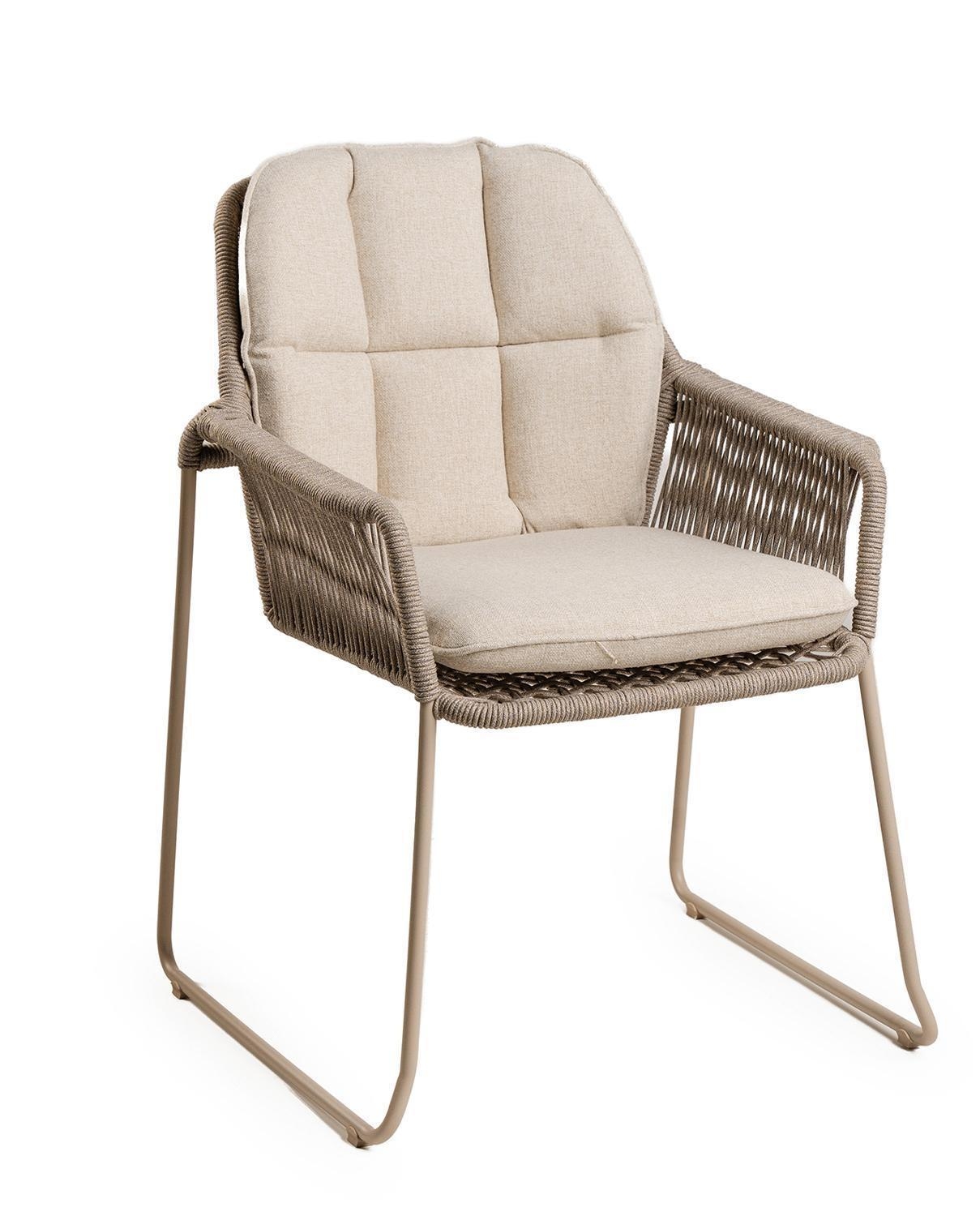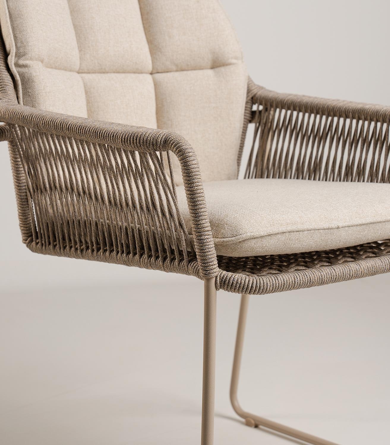 Der Gartenstuhl RIVERA der Marke Tierra Outdoor verfügt über ein Aluminiumgestell in Champagnerfarben. Die Polsterauflage ist mit einem Olefinbezug in Beige versehen. Rücken- und Seitenbereiche sind mit Seilen bespannt. Der Stuhl hat eine Breite von 66 cm, eine Höhe von 87 cm und eine Tiefe von 64 cm.