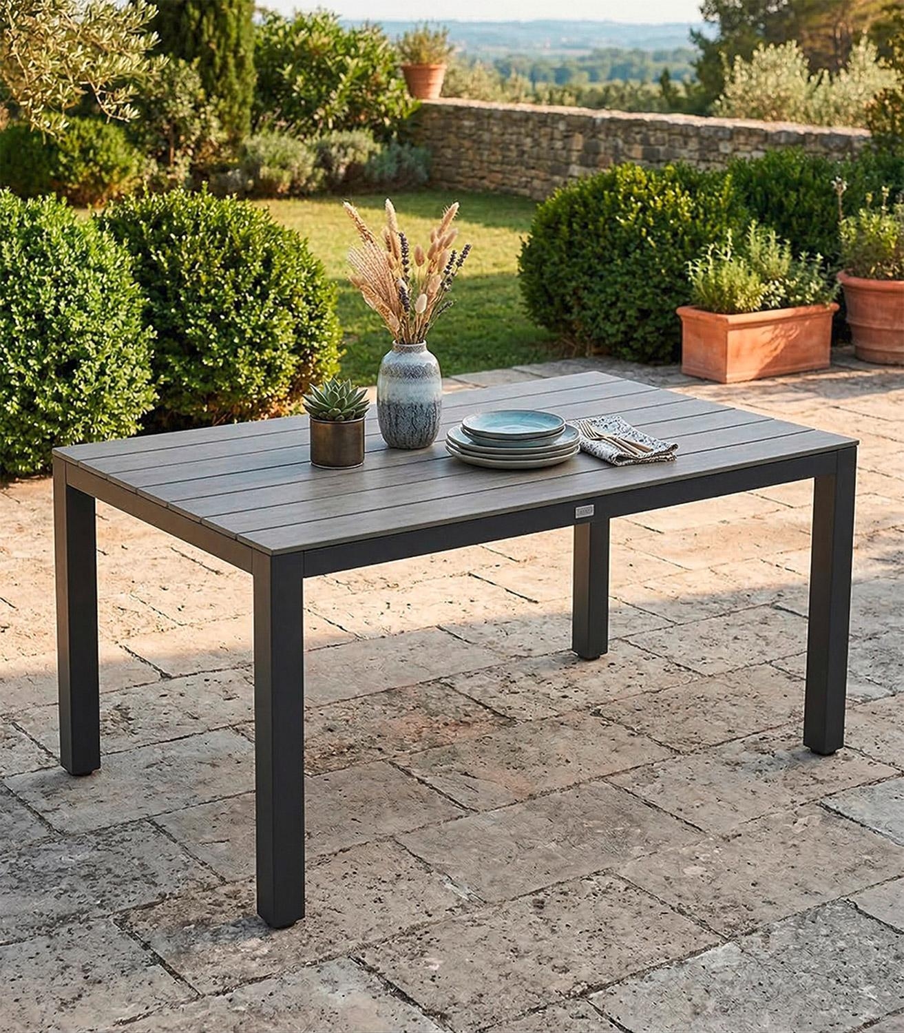 Der Gartentisch BRIGA der Marke Tierra Outdoor ist mit einer Tischplatte aus HPL in Grau ausgestattet. Das Gestell besteht aus Aluminium und ist in der Farbe Anthrazit gehalten. Die Breite des Tisches beträgt 160 cm, die Höhe 74 cm und die Tiefe 100 cm.
