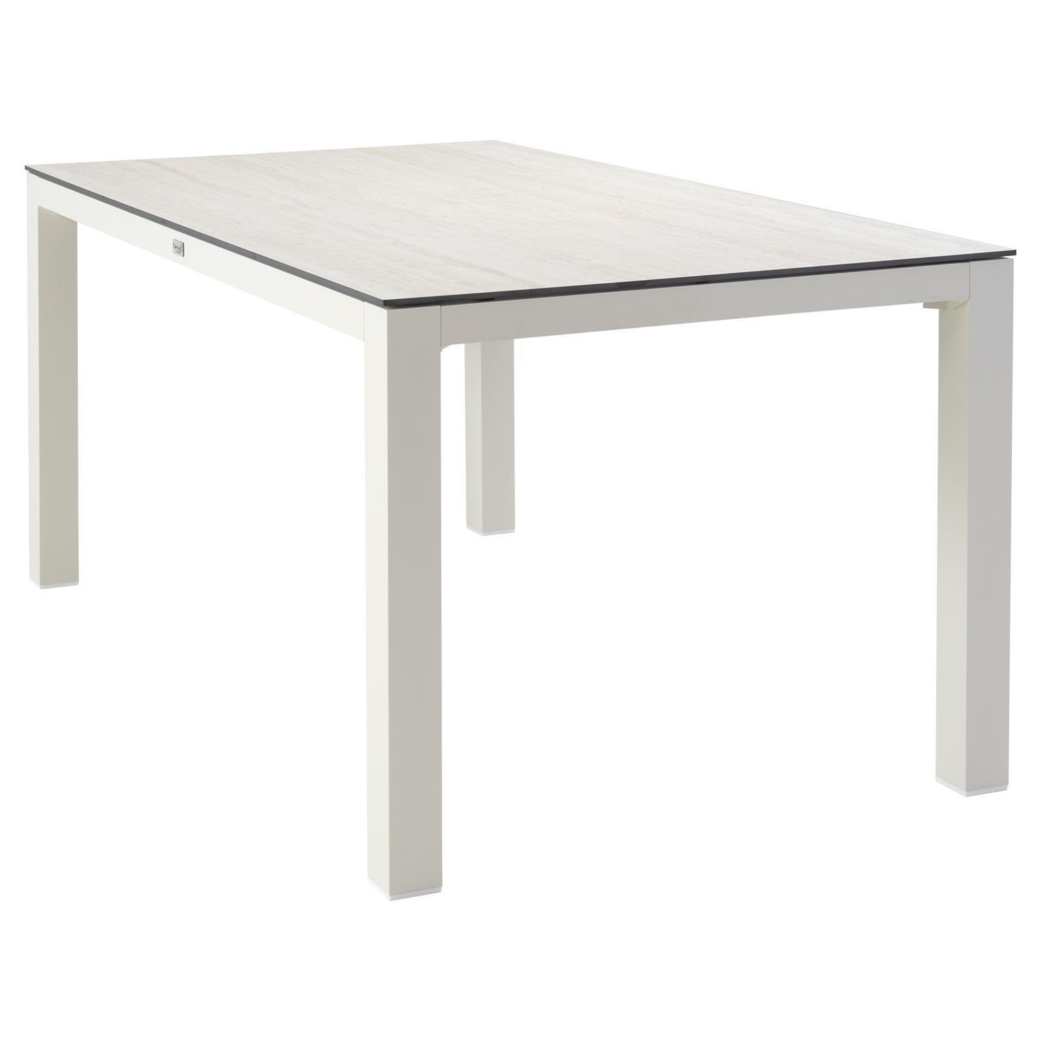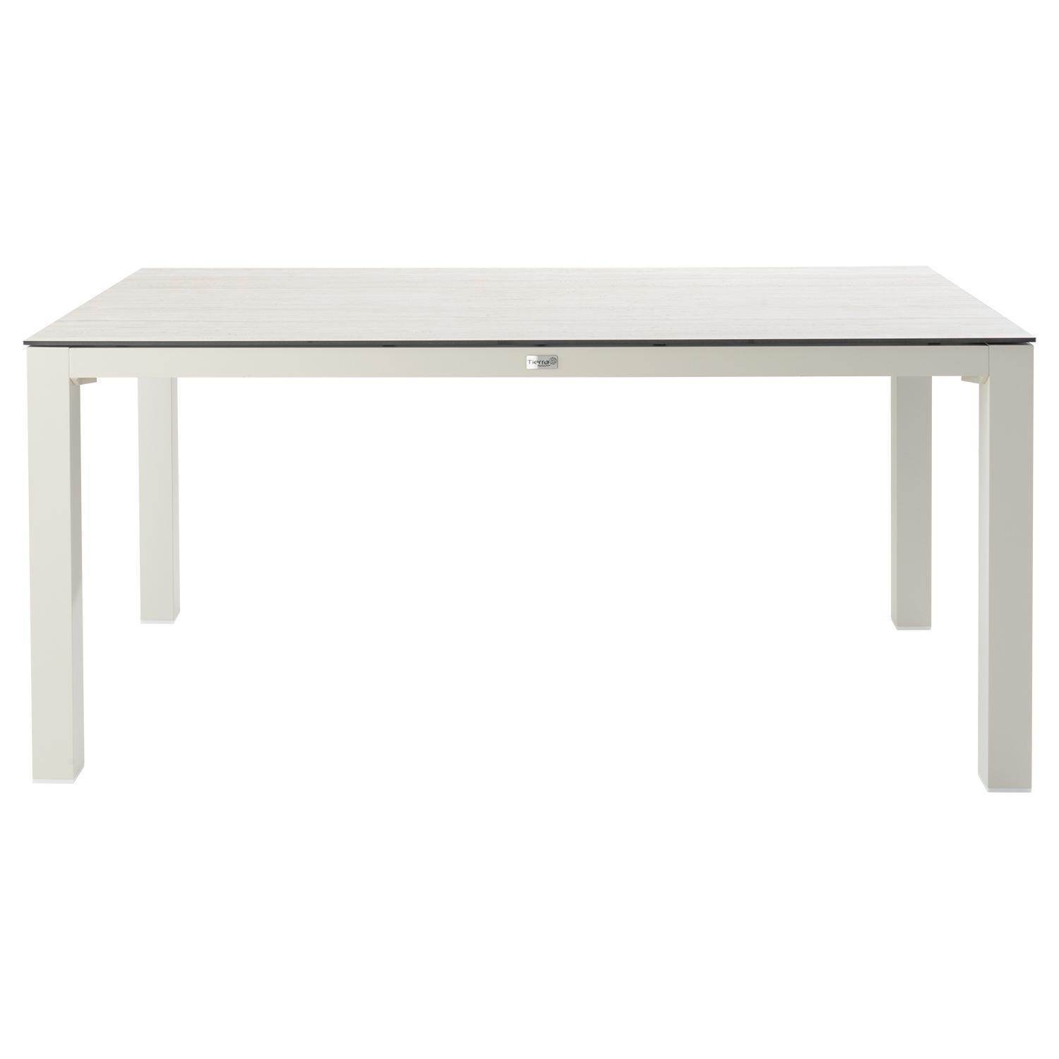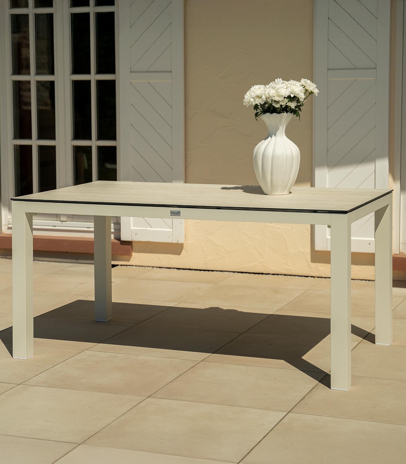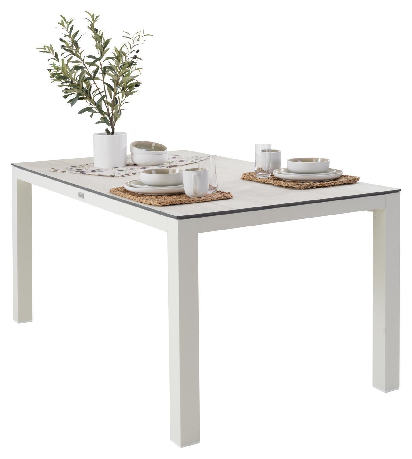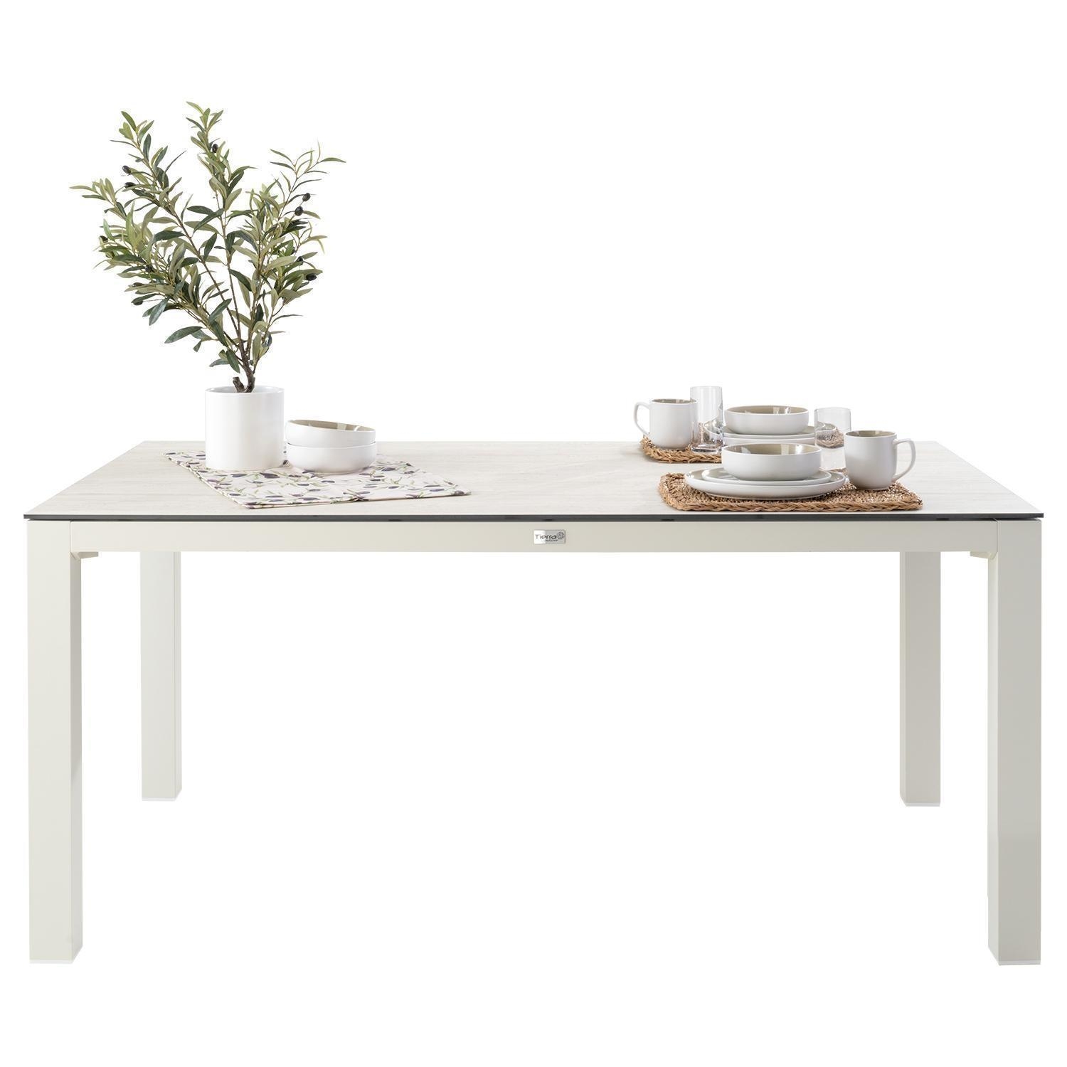 Der Gartentisch BRIGA DINING der Marke Tierra Outdoor ist mit einer Tischplatte aus HPL in Grau ausgestattet. Das Gestell besteht aus Aluminium und ist in der Farbe Cremeweiß gehalten. Die Breite des Tisches beträgt 160 cm und die Tiefe 90 cm.