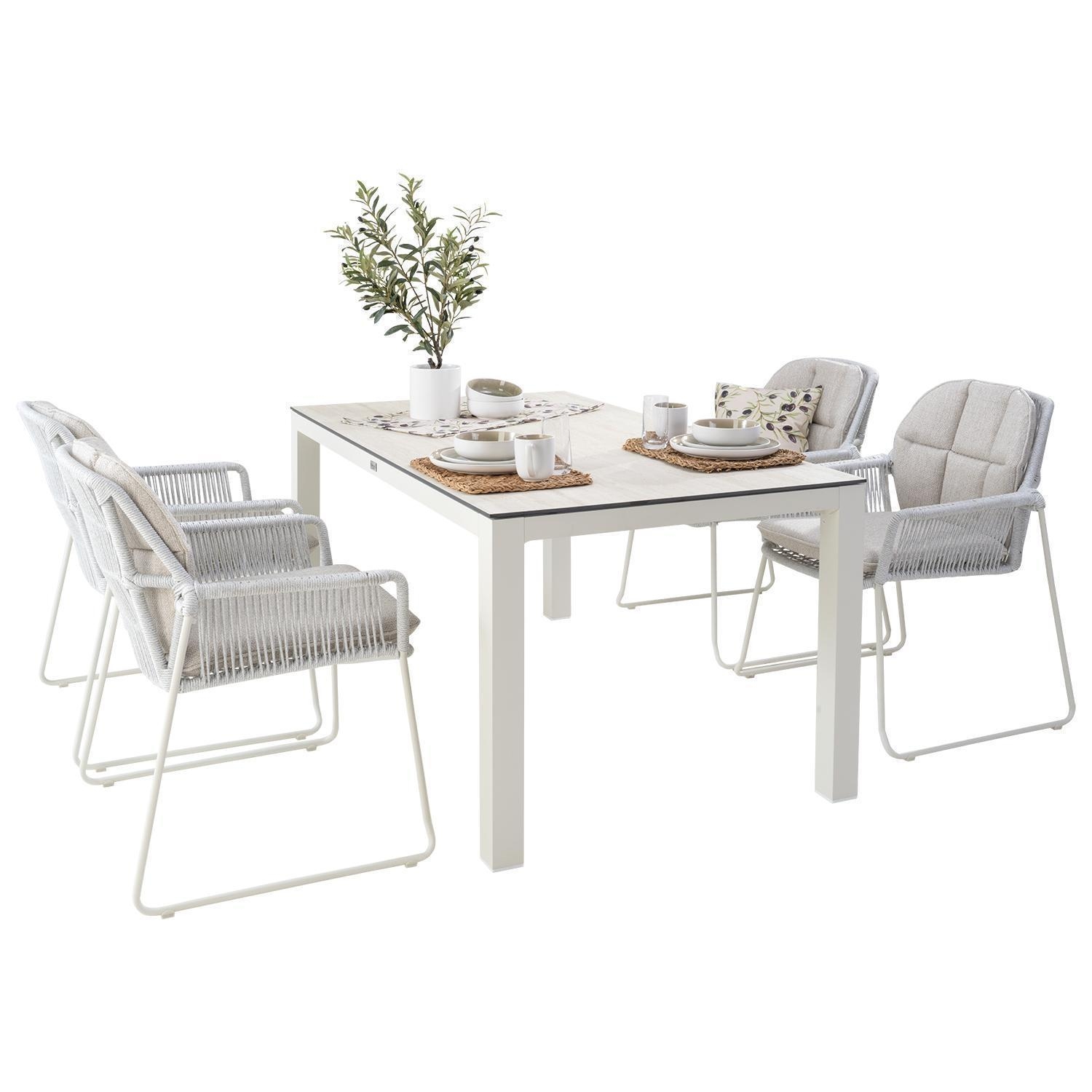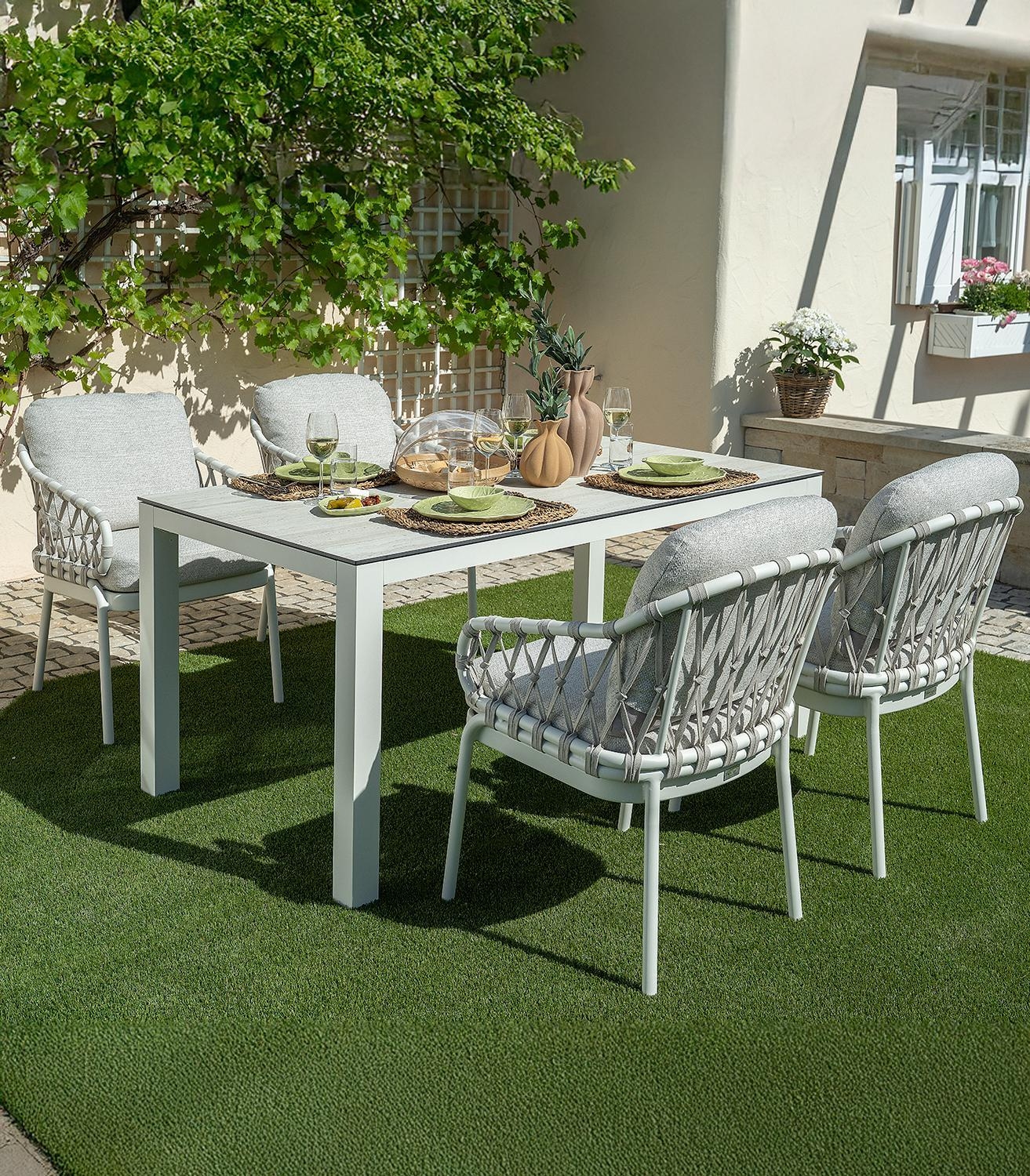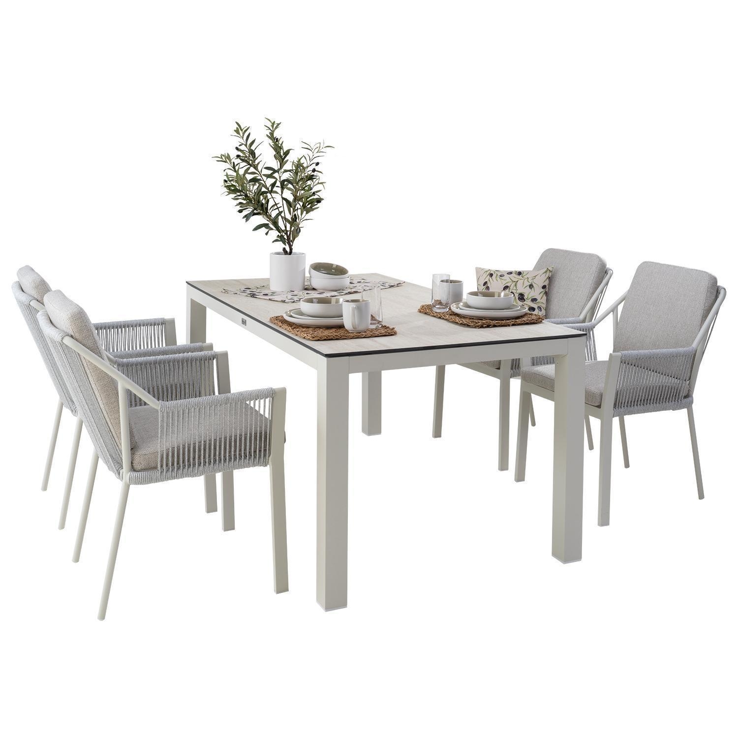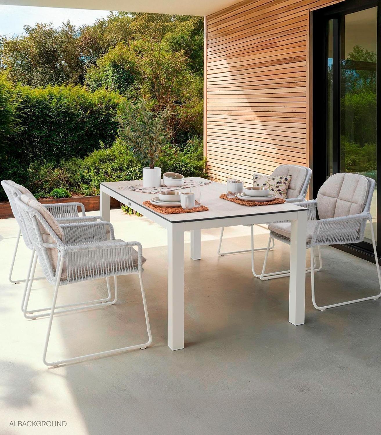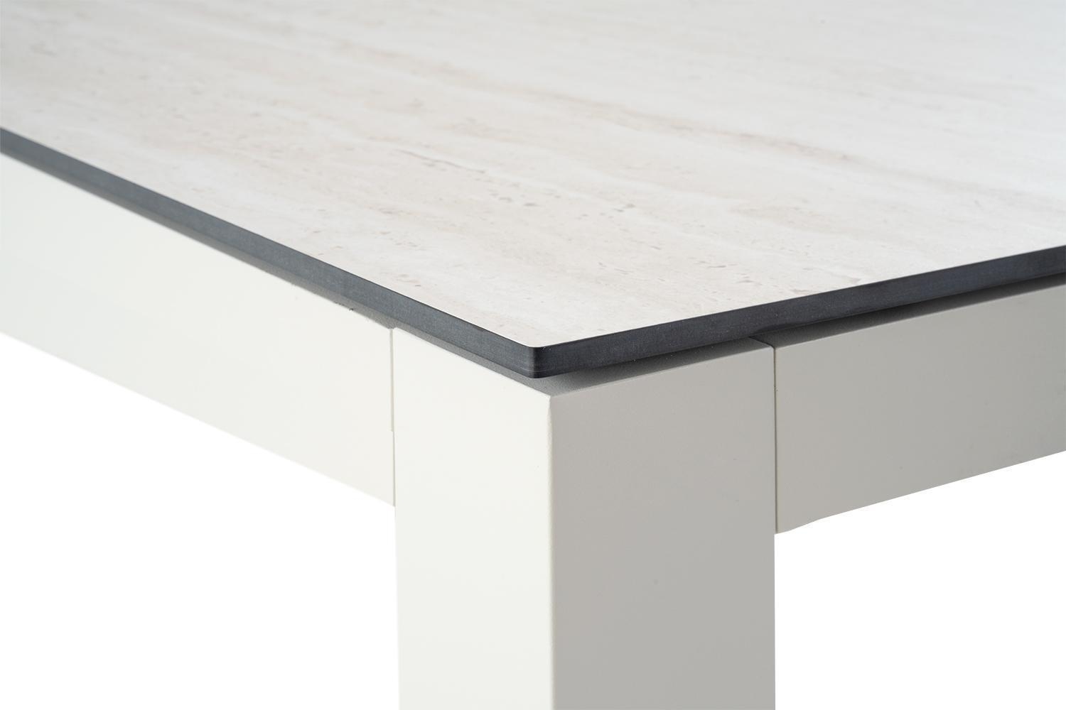 Der Gartentisch BRIGA DINING der Marke Tierra Outdoor ist mit einer Tischplatte aus HPL in Grau ausgestattet. Das Gestell besteht aus Aluminium und ist in der Farbe Cremeweiß gehalten. Die Breite des Tisches beträgt 160 cm und die Tiefe 90 cm.