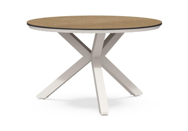 Der Gartentisch ORBITAL der Marke Tierra Outdoor kombiniert eine Tischplatte aus HPL in brauner Holzoptik mit einem cremeweißen Aluminiumgestell. Diese Konstruktion weist einen Durchmesser von 120 cm sowie eine Höhe von 75 cm auf. Aufgrund der verwendeten Materialien ist das Möbelstück sowohl frostsicher als auch witterungsbeständig. Die Dimensionen dieses Produkts sind für die Nutzung durch 4 Personen ausgelegt. Durch die Beschaffenheit aus HPL und Aluminium ist das Objekt für den Einsatz im Freien konzipiert.