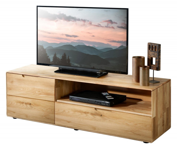Das TV Lowboard ADESSO besticht durch seine elegante Ausführung aus massivem Wildeichenholz. Die geölte Oberfläche betont die natürliche Holzstruktur und verleiht dem Möbelstück eine warme Ausstrahlung. Es verfügt über eine Tür und eine Schublade, beide mit Soft-Close-Funktion, die sanftes und geräuschloses Schließen ermöglichen. Zudem bietet ein offenes Ablagefach Platz für elektronische Geräte oder Dekorationen. Mit einer Breite von 149 cm, einer Höhe von 47 cm und einer Tiefe von 40 cm ist es perfekt für moderne Wohnräume.